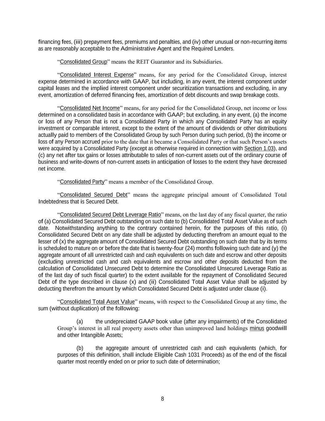 8 financing fees, (iii) prepayment fees, premiums and penalties, and (iv) other unusual or non-recurring items as are reasonably acceptable to the Administrative Agent and the Required Lenders. “Consolidated Group” means the REIT Guarantor and its Subsidiaries. “Consolidated Interest Expense” means, for any period for the Consolidated Group, interest expense determined in accordance with GAAP, but including, in any event, the interest component under capital leases and the implied interest component under securitization transactions and excluding, in any event, amortization of deferred financing fees, amortization of debt discounts and swap breakage costs. “Consolidated Net Income” means, for any period for the Consolidated Group, net income or loss determined on a consolidated basis in accordance with GAAP; but excluding, in any event, (a) the income or loss of any Person that is not a Consolidated Party in which any Consolidated Party has an equity investment or comparable interest, except to the extent of the amount of dividends or other distributions actually paid to members of the Consolidated Group by such Person during such period, (b) the income or loss of any Person accrued prior to the date that it became a Consolidated Party or that such Person’s assets were acquired by a Consolidated Party (except as otherwise required in connection with Section 1.03), and (c) any net after tax gains or losses attributable to sales of non-current assets out of the ordinary course of business and write-downs of non-current assets in anticipation of losses to the extent they have decreased net income. “Consolidated Party” means a member of the Consolidated Group. “Consolidated Secured Debt” means the aggregate principal amount of Consolidated Total Indebtedness that is Secured Debt. “Consolidated Secured Debt Leverage Ratio” means, on the last day of any fiscal quarter, the ratio of (a) Consolidated Secured Debt outstanding on such date to (b) Consolidated Total Asset Value as of such date. Notwithstanding anything to the contrary contained herein, for the purposes of this ratio, (i) Consolidated Secured Debt on any date shall be adjusted by deducting therefrom an amount equal to the lesser of (x) the aggregate amount of Consolidated Secured Debt outstanding on such date that by its terms is scheduled to mature on or before the date that is twenty-four (24) months following such date and (y) the aggregate amount of all unrestricted cash and cash equivalents on such date and escrow and other deposits (excluding unrestricted cash and cash equivalents and escrow and other deposits deducted from the calculation of Consolidated Unsecured Debt to determine the Consolidated Unsecured Leverage Ratio as of the last day of such fiscal quarter) to the extent available for the repayment of Consolidated Secured Debt of the type described in clause (x) and (ii) Consolidated Total Asset Value shall be adjusted by deducting therefrom the amount by which Consolidated Secured Debt is adjusted under clause (i). “Consolidated Total Asset Value” means, with respect to the Consolidated Group at any time, the sum (without duplication) of the following: (a) the undepreciated GAAP book value (after any impairments) of the Consolidated Group’s interest in all real property assets other than unimproved land holdings minus goodwill and other Intangible Assets; (b) the aggregate amount of unrestricted cash and cash equivalents (which, for purposes of this definition, shall include Eligible Cash 1031 Proceeds) as of the end of the fiscal quarter most recently ended on or prior to such date of determination;