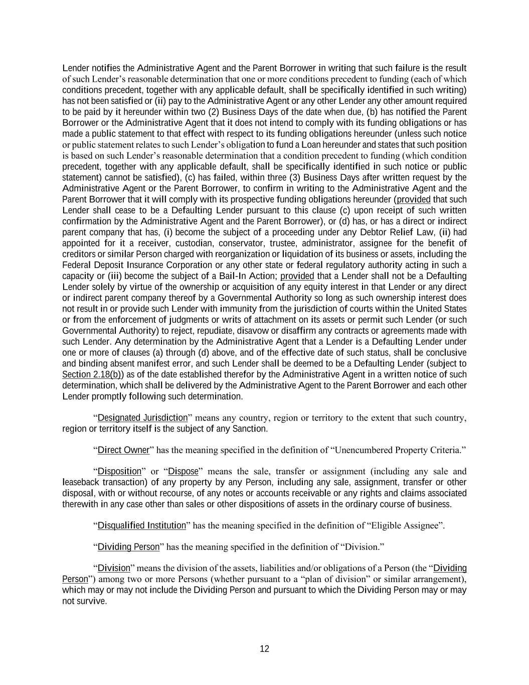 12 Lender notifies the Administrative Agent and the Parent Borrower in writing that such failure is the result of such Lender’s reasonable determination that one or more conditions precedent to funding (each of which conditions precedent, together with any applicable default, shall be specifically identified in such writing) has not been satisfied or (ii) pay to the Administrative Agent or any other Lender any other amount required to be paid by it hereunder within two (2) Business Days of the date when due, (b) has notified the Parent Borrower or the Administrative Agent that it does not intend to comply with its funding obligations or has made a public statement to that effect with respect to its funding obligations hereunder (unless such notice or public statement relates to such Lender’s obligation to fund a Loan hereunder and states that such position is based on such Lender’s reasonable determination that a condition precedent to funding (which condition precedent, together with any applicable default, shall be specifically identified in such notice or public statement) cannot be satisfied), (c) has failed, within three (3) Business Days after written request by the Administrative Agent or the Parent Borrower, to confirm in writing to the Administrative Agent and the Parent Borrower that it will comply with its prospective funding obligations hereunder (provided that such Lender shall cease to be a Defaulting Lender pursuant to this clause (c) upon receipt of such written confirmation by the Administrative Agent and the Parent Borrower), or (d) has, or has a direct or indirect parent company that has, (i) become the subject of a proceeding under any Debtor Relief Law, (ii) had appointed for it a receiver, custodian, conservator, trustee, administrator, assignee for the benefit of creditors or similar Person charged with reorganization or liquidation of its business or assets, including the Federal Deposit Insurance Corporation or any other state or federal regulatory authority acting in such a capacity or (iii) become the subject of a Bail-In Action; provided that a Lender shall not be a Defaulting Lender solely by virtue of the ownership or acquisition of any equity interest in that Lender or any direct or indirect parent company thereof by a Governmental Authority so long as such ownership interest does not result in or provide such Lender with immunity from the jurisdiction of courts within the United States or from the enforcement of judgments or writs of attachment on its assets or permit such Lender (or such Governmental Authority) to reject, repudiate, disavow or disaffirm any contracts or agreements made with such Lender. Any determination by the Administrative Agent that a Lender is a Defaulting Lender under one or more of clauses (a) through (d) above, and of the effective date of such status, shall be conclusive and binding absent manifest error, and such Lender shall be deemed to be a Defaulting Lender (subject to Section 2.18(b)) as of the date established therefor by the Administrative Agent in a written notice of such determination, which shall be delivered by the Administrative Agent to the Parent Borrower and each other Lender promptly following such determination. “Designated Jurisdiction” means any country, region or territory to the extent that such country, region or territory itself is the subject of any Sanction. “Direct Owner” has the meaning specified in the definition of “Unencumbered Property Criteria.” “Disposition” or “Dispose” means the sale, transfer or assignment (including any sale and leaseback transaction) of any property by any Person, including any sale, assignment, transfer or other disposal, with or without recourse, of any notes or accounts receivable or any rights and claims associated therewith in any case other than sales or other dispositions of assets in the ordinary course of business. “Disqualified Institution” has the meaning specified in the definition of “Eligible Assignee”. “Dividing Person” has the meaning specified in the definition of “Division.” “Division” means the division of the assets, liabilities and/or obligations of a Person (the “Dividing Person”) among two or more Persons (whether pursuant to a “plan of division” or similar arrangement), which may or may not include the Dividing Person and pursuant to which the Dividing Person may or may not survive.