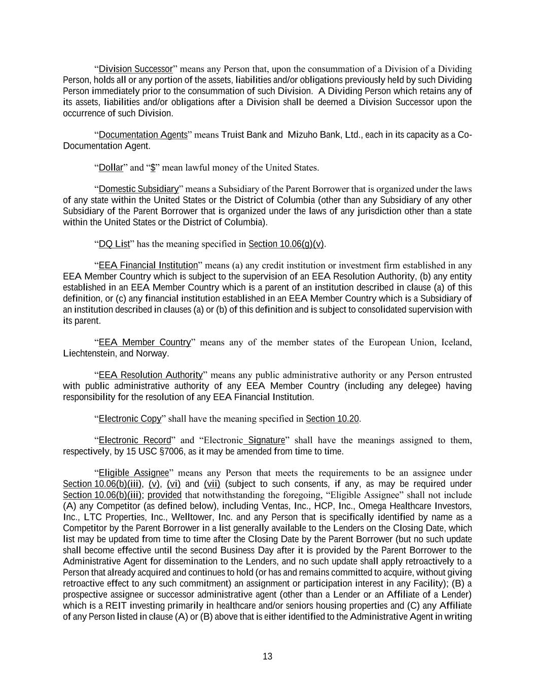 13 “Division Successor” means any Person that, upon the consummation of a Division of a Dividing Person, holds all or any portion of the assets, liabilities and/or obligations previously held by such Dividing Person immediately prior to the consummation of such Division. A Dividing Person which retains any of its assets, liabilities and/or obligations after a Division shall be deemed a Division Successor upon the occurrence of such Division. “Documentation Agents” means Truist Bank and Mizuho Bank, Ltd., each in its capacity as a Co- Documentation Agent. “Dollar” and “$” mean lawful money of the United States. “Domestic Subsidiary” means a Subsidiary of the Parent Borrower that is organized under the laws of any state within the United States or the District of Columbia (other than any Subsidiary of any other Subsidiary of the Parent Borrower that is organized under the laws of any jurisdiction other than a state within the United States or the District of Columbia). “DQ List” has the meaning specified in Section 10.06(g)(v). “EEA Financial Institution” means (a) any credit institution or investment firm established in any EEA Member Country which is subject to the supervision of an EEA Resolution Authority, (b) any entity established in an EEA Member Country which is a parent of an institution described in clause (a) of this definition, or (c) any financial institution established in an EEA Member Country which is a Subsidiary of an institution described in clauses (a) or (b) of this definition and is subject to consolidated supervision with its parent. “EEA Member Country” means any of the member states of the European Union, Iceland, Liechtenstein, and Norway. “EEA Resolution Authority” means any public administrative authority or any Person entrusted with public administrative authority of any EEA Member Country (including any delegee) having responsibility for the resolution of any EEA Financial Institution. “Electronic Copy” shall have the meaning specified in Section 10.20. “Electronic Record” and “Electronic Signature” shall have the meanings assigned to them, respectively, by 15 USC §7006, as it may be amended from time to time. “Eligible Assignee” means any Person that meets the requirements to be an assignee under Section 10.06(b)(iii), (v), (vi) and (vii) (subject to such consents, if any, as may be required under Section 10.06(b)(iii); provided that notwithstanding the foregoing, “Eligible Assignee” shall not include (A) any Competitor (as defined below), including Ventas, Inc., HCP, Inc., Omega Healthcare Investors, Inc., LTC Properties, Inc., Welltower, Inc. and any Person that is specifically identified by name as a Competitor by the Parent Borrower in a list generally available to the Lenders on the Closing Date, which list may be updated from time to time after the Closing Date by the Parent Borrower (but no such update shall become effective until the second Business Day after it is provided by the Parent Borrower to the Administrative Agent for dissemination to the Lenders, and no such update shall apply retroactively to a Person that already acquired and continues to hold (or has and remains committed to acquire, without giving retroactive effect to any such commitment) an assignment or participation interest in any Facility); (B) a prospective assignee or successor administrative agent (other than a Lender or an Affiliate of a Lender) which is a REIT investing primarily in healthcare and/or seniors housing properties and (C) any Affiliate of any Person listed in clause (A) or (B) above that is either identified to the Administrative Agent in writing