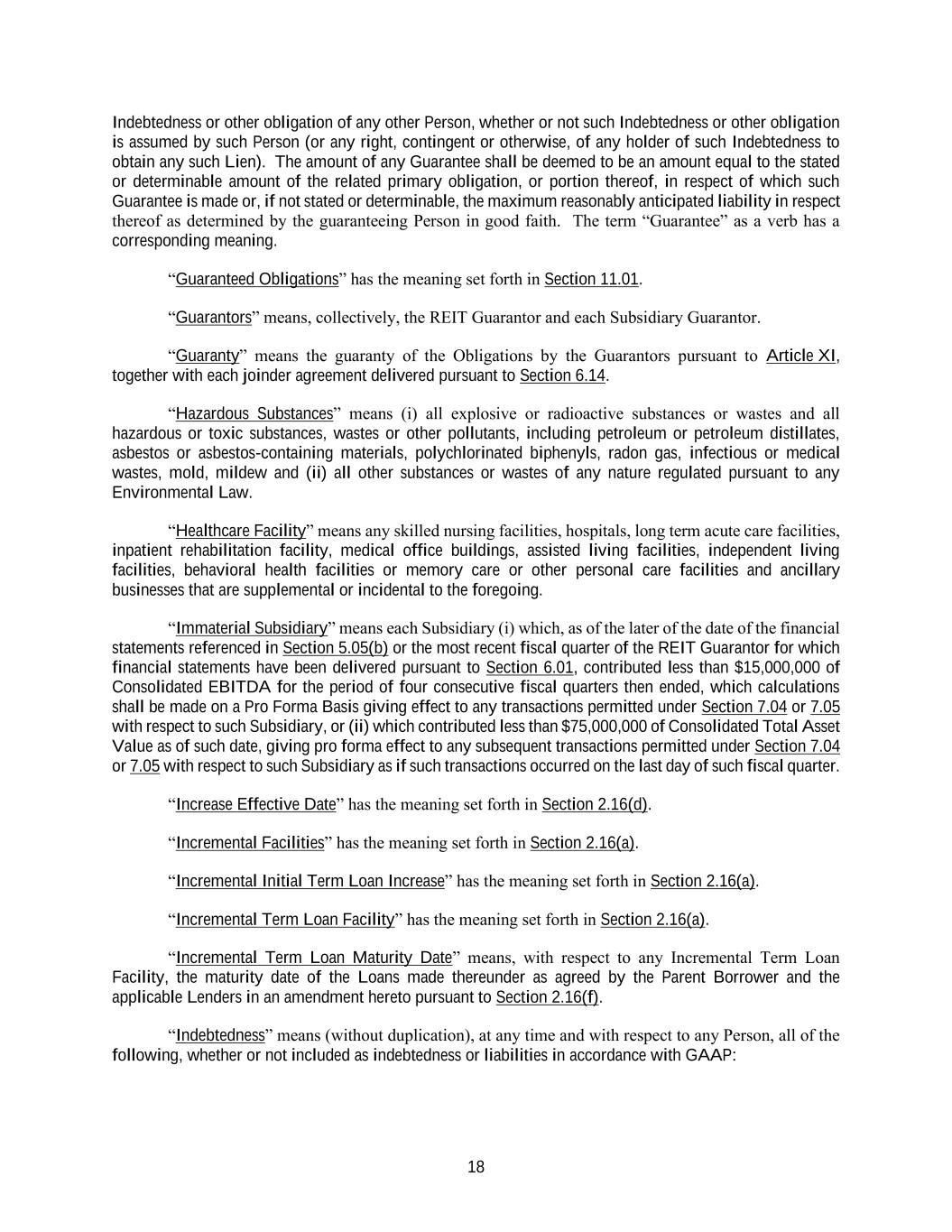 18 Indebtedness or other obligation of any other Person, whether or not such Indebtedness or other obligation is assumed by such Person (or any right, contingent or otherwise, of any holder of such Indebtedness to obtain any such Lien). The amount of any Guarantee shall be deemed to be an amount equal to the stated or determinable amount of the related primary obligation, or portion thereof, in respect of which such Guarantee is made or, if not stated or determinable, the maximum reasonably anticipated liability in respect thereof as determined by the guaranteeing Person in good faith. The term “Guarantee” as a verb has a corresponding meaning. “Guaranteed Obligations” has the meaning set forth in Section 11.01. “Guarantors” means, collectively, the REIT Guarantor and each Subsidiary Guarantor. “Guaranty” means the guaranty of the Obligations by the Guarantors pursuant to Article XI, together with each joinder agreement delivered pursuant to Section 6.14. “Hazardous Substances” means (i) all explosive or radioactive substances or wastes and all hazardous or toxic substances, wastes or other pollutants, including petroleum or petroleum distillates, asbestos or asbestos-containing materials, polychlorinated biphenyls, radon gas, infectious or medical wastes, mold, mildew and (ii) all other substances or wastes of any nature regulated pursuant to any Environmental Law. “Healthcare Facility” means any skilled nursing facilities, hospitals, long term acute care facilities, inpatient rehabilitation facility, medical office buildings, assisted living facilities, independent living facilities, behavioral health facilities or memory care or other personal care facilities and ancillary businesses that are supplemental or incidental to the foregoing. “Immaterial Subsidiary” means each Subsidiary (i) which, as of the later of the date of the financial statements referenced in Section 5.05(b) or the most recent fiscal quarter of the REIT Guarantor for which financial statements have been delivered pursuant to Section 6.01, contributed less than $15,000,000 of Consolidated EBITDA for the period of four consecutive fiscal quarters then ended, which calculations shall be made on a Pro Forma Basis giving effect to any transactions permitted under Section 7.04 or 7.05 with respect to such Subsidiary, or (ii) which contributed less than $75,000,000 of Consolidated Total Asset Value as of such date, giving pro forma effect to any subsequent transactions permitted under Section 7.04 or 7.05 with respect to such Subsidiary as if such transactions occurred on the last day of such fiscal quarter. “Increase Effective Date” has the meaning set forth in Section 2.16(d). “Incremental Facilities” has the meaning set forth in Section 2.16(a). “Incremental Initial Term Loan Increase” has the meaning set forth in Section 2.16(a). “Incremental Term Loan Facility” has the meaning set forth in Section 2.16(a). “Incremental Term Loan Maturity Date” means, with respect to any Incremental Term Loan Facility, the maturity date of the Loans made thereunder as agreed by the Parent Borrower and the applicable Lenders in an amendment hereto pursuant to Section 2.16(f). “Indebtedness” means (without duplication), at any time and with respect to any Person, all of the following, whether or not included as indebtedness or liabilities in accordance with GAAP: