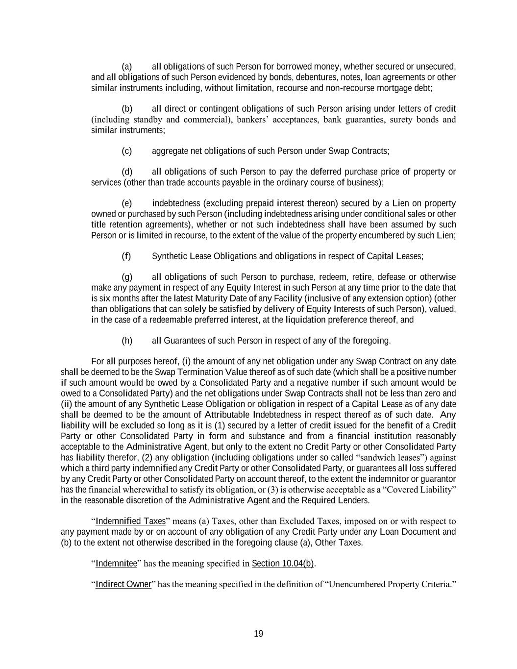 19 (a) all obligations of such Person for borrowed money, whether secured or unsecured, and all obligations of such Person evidenced by bonds, debentures, notes, loan agreements or other similar instruments including, without limitation, recourse and non-recourse mortgage debt; (b) all direct or contingent obligations of such Person arising under letters of credit (including standby and commercial), bankers’ acceptances, bank guaranties, surety bonds and similar instruments; (c) aggregate net obligations of such Person under Swap Contracts; (d) all obligations of such Person to pay the deferred purchase price of property or services (other than trade accounts payable in the ordinary course of business); (e) indebtedness (excluding prepaid interest thereon) secured by a Lien on property owned or purchased by such Person (including indebtedness arising under conditional sales or other title retention agreements), whether or not such indebtedness shall have been assumed by such Person or is limited in recourse, to the extent of the value of the property encumbered by such Lien; (f) Synthetic Lease Obligations and obligations in respect of Capital Leases; (g) all obligations of such Person to purchase, redeem, retire, defease or otherwise make any payment in respect of any Equity Interest in such Person at any time prior to the date that is six months after the latest Maturity Date of any Facility (inclusive of any extension option) (other than obligations that can solely be satisfied by delivery of Equity Interests of such Person), valued, in the case of a redeemable preferred interest, at the liquidation preference thereof, and (h) all Guarantees of such Person in respect of any of the foregoing. For all purposes hereof, (i) the amount of any net obligation under any Swap Contract on any date shall be deemed to be the Swap Termination Value thereof as of such date (which shall be a positive number if such amount would be owed by a Consolidated Party and a negative number if such amount would be owed to a Consolidated Party) and the net obligations under Swap Contracts shall not be less than zero and (ii) the amount of any Synthetic Lease Obligation or obligation in respect of a Capital Lease as of any date shall be deemed to be the amount of Attributable Indebtedness in respect thereof as of such date. Any liability will be excluded so long as it is (1) secured by a letter of credit issued for the benefit of a Credit Party or other Consolidated Party in form and substance and from a financial institution reasonably acceptable to the Administrative Agent, but only to the extent no Credit Party or other Consolidated Party has liability therefor, (2) any obligation (including obligations under so called “sandwich leases”) against which a third party indemnified any Credit Party or other Consolidated Party, or guarantees all loss suffered by any Credit Party or other Consolidated Party on account thereof, to the extent the indemnitor or guarantor has the financial wherewithal to satisfy its obligation, or (3) is otherwise acceptable as a “Covered Liability” in the reasonable discretion of the Administrative Agent and the Required Lenders. “Indemnified Taxes” means (a) Taxes, other than Excluded Taxes, imposed on or with respect to any payment made by or on account of any obligation of any Credit Party under any Loan Document and (b) to the extent not otherwise described in the foregoing clause (a), Other Taxes. “Indemnitee” has the meaning specified in Section 10.04(b). “Indirect Owner” has the meaning specified in the definition of “Unencumbered Property Criteria.”