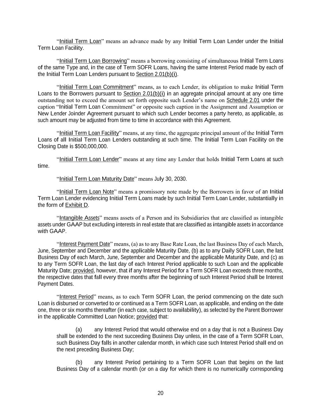 20 “Initial Term Loan” means an advance made by any Initial Term Loan Lender under the Initial Term Loan Facility. “Initial Term Loan Borrowing” means a borrowing consisting of simultaneous Initial Term Loans of the same Type and, in the case of Term SOFR Loans, having the same Interest Period made by each of the Initial Term Loan Lenders pursuant to Section 2.01(b)(i). “Initial Term Loan Commitment” means, as to each Lender, its obligation to make Initial Term Loans to the Borrowers pursuant to Section 2.01(b)(i) in an aggregate principal amount at any one time outstanding not to exceed the amount set forth opposite such Lender’s name on Schedule 2.01 under the caption “Initial Term Loan Commitment” or opposite such caption in the Assignment and Assumption or New Lender Joinder Agreement pursuant to which such Lender becomes a party hereto, as applicable, as such amount may be adjusted from time to time in accordance with this Agreement. “Initial Term Loan Facility” means, at any time, the aggregate principal amount of the Initial Term Loans of all Initial Term Loan Lenders outstanding at such time. The Initial Term Loan Facility on the Closing Date is $500,000,000. “Initial Term Loan Lender” means at any time any Lender that holds Initial Term Loans at such time. “Initial Term Loan Maturity Date” means July 30, 2030. “Initial Term Loan Note” means a promissory note made by the Borrowers in favor of an Initial Term Loan Lender evidencing Initial Term Loans made by such Initial Term Loan Lender, substantially in the form of Exhibit D. “Intangible Assets” means assets of a Person and its Subsidiaries that are classified as intangible assets under GAAP but excluding interests in real estate that are classified as intangible assets in accordance with GAAP. “Interest Payment Date” means, (a) as to any Base Rate Loan, the last Business Day of each March, June, September and December and the applicable Maturity Date, (b) as to any Daily SOFR Loan, the last Business Day of each March, June, September and December and the applicable Maturity Date, and (c) as to any Term SOFR Loan, the last day of each Interest Period applicable to such Loan and the applicable Maturity Date; provided, however, that if any Interest Period for a Term SOFR Loan exceeds three months, the respective dates that fall every three months after the beginning of such Interest Period shall be Interest Payment Dates. “Interest Period” means, as to each Term SOFR Loan, the period commencing on the date such Loan is disbursed or converted to or continued as a Term SOFR Loan, as applicable, and ending on the date one, three or six months thereafter (in each case, subject to availability), as selected by the Parent Borrower in the applicable Committed Loan Notice; provided that: (a) any Interest Period that would otherwise end on a day that is not a Business Day shall be extended to the next succeeding Business Day unless, in the case of a Term SOFR Loan, such Business Day falls in another calendar month, in which case such Interest Period shall end on the next preceding Business Day; (b) any Interest Period pertaining to a Term SOFR Loan that begins on the last Business Day of a calendar month (or on a day for which there is no numerically corresponding