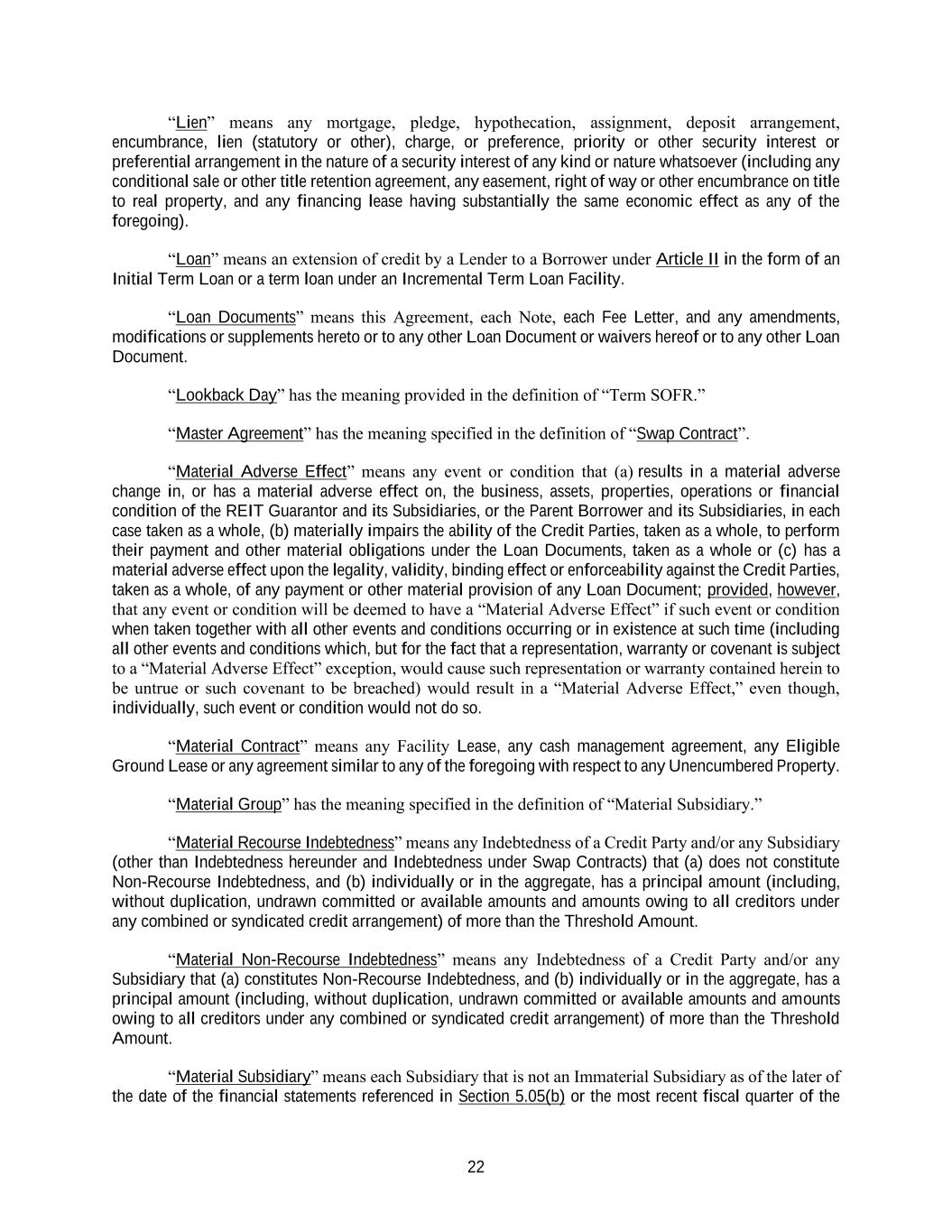 22 “Lien” means any mortgage, pledge, hypothecation, assignment, deposit arrangement, encumbrance, lien (statutory or other), charge, or preference, priority or other security interest or preferential arrangement in the nature of a security interest of any kind or nature whatsoever (including any conditional sale or other title retention agreement, any easement, right of way or other encumbrance on title to real property, and any financing lease having substantially the same economic effect as any of the foregoing). “Loan” means an extension of credit by a Lender to a Borrower under Article II in the form of an Initial Term Loan or a term loan under an Incremental Term Loan Facility. “Loan Documents” means this Agreement, each Note, each Fee Letter, and any amendments, modifications or supplements hereto or to any other Loan Document or waivers hereof or to any other Loan Document. “Lookback Day” has the meaning provided in the definition of “Term SOFR.” “Master Agreement” has the meaning specified in the definition of “Swap Contract”. “Material Adverse Effect” means any event or condition that (a) results in a material adverse change in, or has a material adverse effect on, the business, assets, properties, operations or financial condition of the REIT Guarantor and its Subsidiaries, or the Parent Borrower and its Subsidiaries, in each case taken as a whole, (b) materially impairs the ability of the Credit Parties, taken as a whole, to perform their payment and other material obligations under the Loan Documents, taken as a whole or (c) has a material adverse effect upon the legality, validity, binding effect or enforceability against the Credit Parties, taken as a whole, of any payment or other material provision of any Loan Document; provided, however, that any event or condition will be deemed to have a “Material Adverse Effect” if such event or condition when taken together with all other events and conditions occurring or in existence at such time (including all other events and conditions which, but for the fact that a representation, warranty or covenant is subject to a “Material Adverse Effect” exception, would cause such representation or warranty contained herein to be untrue or such covenant to be breached) would result in a “Material Adverse Effect,” even though, individually, such event or condition would not do so. “Material Contract” means any Facility Lease, any cash management agreement, any Eligible Ground Lease or any agreement similar to any of the foregoing with respect to any Unencumbered Property. “Material Group” has the meaning specified in the definition of “Material Subsidiary.” “Material Recourse Indebtedness” means any Indebtedness of a Credit Party and/or any Subsidiary (other than Indebtedness hereunder and Indebtedness under Swap Contracts) that (a) does not constitute Non-Recourse Indebtedness, and (b) individually or in the aggregate, has a principal amount (including, without duplication, undrawn committed or available amounts and amounts owing to all creditors under any combined or syndicated credit arrangement) of more than the Threshold Amount. “Material Non-Recourse Indebtedness” means any Indebtedness of a Credit Party and/or any Subsidiary that (a) constitutes Non-Recourse Indebtedness, and (b) individually or in the aggregate, has a principal amount (including, without duplication, undrawn committed or available amounts and amounts owing to all creditors under any combined or syndicated credit arrangement) of more than the Threshold Amount. “Material Subsidiary” means each Subsidiary that is not an Immaterial Subsidiary as of the later of the date of the financial statements referenced in Section 5.05(b) or the most recent fiscal quarter of the