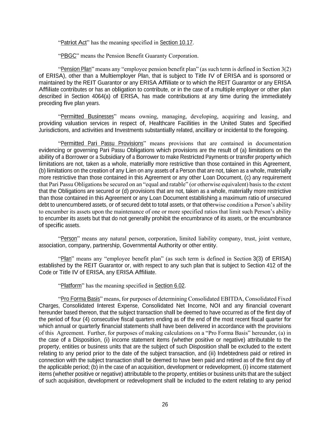 26 “Patriot Act” has the meaning specified in Section 10.17. “PBGC” means the Pension Benefit Guaranty Corporation. “Pension Plan” means any “employee pension benefit plan” (as such term is defined in Section 3(2) of ERISA), other than a Multiemployer Plan, that is subject to Title IV of ERISA and is sponsored or maintained by the REIT Guarantor or any ERISA Affiliate or to which the REIT Guarantor or any ERISA Affiliate contributes or has an obligation to contribute, or in the case of a multiple employer or other plan described in Section 4064(a) of ERISA, has made contributions at any time during the immediately preceding five plan years. “Permitted Businesses” means owning, managing, developing, acquiring and leasing, and providing valuation services in respect of, Healthcare Facilities in the United States and Specified Jurisdictions, and activities and Investments substantially related, ancillary or incidental to the foregoing. “Permitted Pari Passu Provisions” means provisions that are contained in documentation evidencing or governing Pari Passu Obligations which provisions are the result of (a) limitations on the ability of a Borrower or a Subsidiary of a Borrower to make Restricted Payments or transfer property which limitations are not, taken as a whole, materially more restrictive than those contained in this Agreement, (b) limitations on the creation of any Lien on any assets of a Person that are not, taken as a whole, materially more restrictive than those contained in this Agreement or any other Loan Document, (c) any requirement that Pari Passu Obligations be secured on an “equal and ratable” (or otherwise equivalent) basis to the extent that the Obligations are secured or (d) provisions that are not, taken as a whole, materially more restrictive than those contained in this Agreement or any Loan Document establishing a maximum ratio of unsecured debt to unencumbered assets, or of secured debt to total assets, or that otherwise condition a Person’s ability to encumber its assets upon the maintenance of one or more specified ratios that limit such Person’s ability to encumber its assets but that do not generally prohibit the encumbrance of its assets, or the encumbrance of specific assets. “Person” means any natural person, corporation, limited liability company, trust, joint venture, association, company, partnership, Governmental Authority or other entity. “Plan” means any “employee benefit plan” (as such term is defined in Section 3(3) of ERISA) established by the REIT Guarantor or, with respect to any such plan that is subject to Section 412 of the Code or Title IV of ERISA, any ERISA Affiliate. “Platform” has the meaning specified in Section 6.02. “Pro Forma Basis” means, for purposes of determining Consolidated EBITDA, Consolidated Fixed Charges, Consolidated Interest Expense, Consolidated Net Income, NOI and any financial covenant hereunder based thereon, that the subject transaction shall be deemed to have occurred as of the first day of the period of four (4) consecutive fiscal quarters ending as of the end of the most recent fiscal quarter for which annual or quarterly financial statements shall have been delivered in accordance with the provisions of this Agreement. Further, for purposes of making calculations on a “Pro Forma Basis” hereunder, (a) in the case of a Disposition, (i) income statement items (whether positive or negative) attributable to the property, entities or business units that are the subject of such Disposition shall be excluded to the extent relating to any period prior to the date of the subject transaction, and (ii) Indebtedness paid or retired in connection with the subject transaction shall be deemed to have been paid and retired as of the first day of the applicable period; (b) in the case of an acquisition, development or redevelopment, (i) income statement items (whether positive or negative) attributable to the property, entities or business units that are the subject of such acquisition, development or redevelopment shall be included to the extent relating to any period