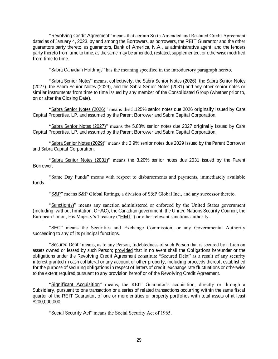 29 “Revolving Credit Agreement” means that certain Sixth Amended and Restated Credit Agreement dated as of January 4, 2023, by and among the Borrowers, as borrowers, the REIT Guarantor and the other guarantors party thereto, as guarantors, Bank of America, N.A., as administrative agent, and the lenders party thereto from time to time, as the same may be amended, restated, supplemented, or otherwise modified from time to time. “Sabra Canadian Holdings” has the meaning specified in the introductory paragraph hereto. “Sabra Senior Notes” means, collectively, the Sabra Senior Notes (2026), the Sabra Senior Notes (2027), the Sabra Senior Notes (2029), and the Sabra Senior Notes (2031) and any other senior notes or similar instruments from time to time issued by any member of the Consolidated Group (whether prior to, on or after the Closing Date). “Sabra Senior Notes (2026)” means the 5.125% senior notes due 2026 originally issued by Care Capital Properties, LP. and assumed by the Parent Borrower and Sabra Capital Corporation. “Sabra Senior Notes (2027)” means the 5.88% senior notes due 2027 originally issued by Care Capital Properties, LP. and assumed by the Parent Borrower and Sabra Capital Corporation. “Sabra Senior Notes (2029)” means the 3.9% senior notes due 2029 issued by the Parent Borrower and Sabra Capital Corporation. “Sabra Senior Notes (2031)” means the 3.20% senior notes due 2031 issued by the Parent Borrower. “Same Day Funds” means with respect to disbursements and payments, immediately available funds. “S&P” means S&P Global Ratings, a division of S&P Global Inc., and any successor thereto. “Sanction(s)” means any sanction administered or enforced by the United States government (including, without limitation, OFAC), the Canadian government, the United Nations Security Council, the European Union, His Majesty’s Treasury (“HMT”) or other relevant sanctions authority. “SEC” means the Securities and Exchange Commission, or any Governmental Authority succeeding to any of its principal functions. “Secured Debt” means, as to any Person, Indebtedness of such Person that is secured by a Lien on assets owned or leased by such Person; provided that in no event shall the Obligations hereunder or the obligations under the Revolving Credit Agreement constitute “Secured Debt” as a result of any security interest granted in cash collateral or any account or other property, including proceeds thereof, established for the purpose of securing obligations in respect of letters of credit, exchange rate fluctuations or otherwise to the extent required pursuant to any provision hereof or of the Revolving Credit Agreement. “Significant Acquisition” means, the REIT Guarantor’s acquisition, directly or through a Subsidiary, pursuant to one transaction or a series of related transactions occurring within the same fiscal quarter of the REIT Guarantor, of one or more entities or property portfolios with total assets of at least $200,000,000. “Social Security Act” means the Social Security Act of 1965.