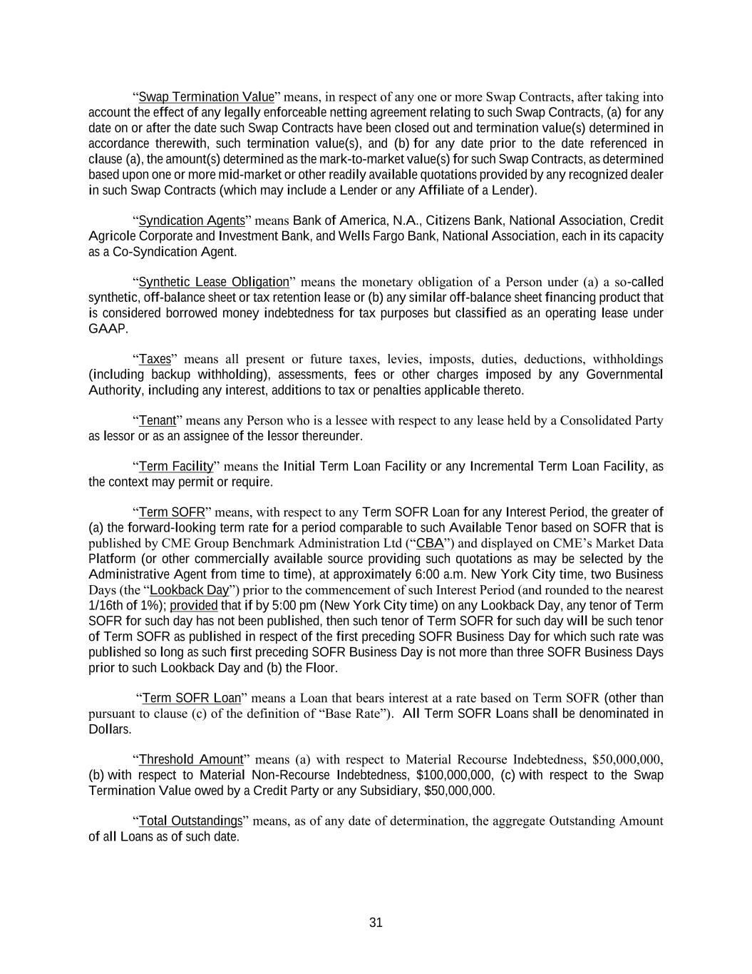 31 “Swap Termination Value” means, in respect of any one or more Swap Contracts, after taking into account the effect of any legally enforceable netting agreement relating to such Swap Contracts, (a) for any date on or after the date such Swap Contracts have been closed out and termination value(s) determined in accordance therewith, such termination value(s), and (b) for any date prior to the date referenced in clause (a), the amount(s) determined as the mark-to-market value(s) for such Swap Contracts, as determined based upon one or more mid-market or other readily available quotations provided by any recognized dealer in such Swap Contracts (which may include a Lender or any Affiliate of a Lender). “Syndication Agents” means Bank of America, N.A., Citizens Bank, National Association, Credit Agricole Corporate and Investment Bank, and Wells Fargo Bank, National Association, each in its capacity as a Co-Syndication Agent. “Synthetic Lease Obligation” means the monetary obligation of a Person under (a) a so-called synthetic, off-balance sheet or tax retention lease or (b) any similar off-balance sheet financing product that is considered borrowed money indebtedness for tax purposes but classified as an operating lease under GAAP. “Taxes” means all present or future taxes, levies, imposts, duties, deductions, withholdings (including backup withholding), assessments, fees or other charges imposed by any Governmental Authority, including any interest, additions to tax or penalties applicable thereto. “Tenant” means any Person who is a lessee with respect to any lease held by a Consolidated Party as lessor or as an assignee of the lessor thereunder. “Term Facility” means the Initial Term Loan Facility or any Incremental Term Loan Facility, as the context may permit or require. “Term SOFR” means, with respect to any Term SOFR Loan for any Interest Period, the greater of (a) the forward-looking term rate for a period comparable to such Available Tenor based on SOFR that is published by CME Group Benchmark Administration Ltd (“CBA”) and displayed on CME’s Market Data Platform (or other commercially available source providing such quotations as may be selected by the Administrative Agent from time to time), at approximately 6:00 a.m. New York City time, two Business Days (the “Lookback Day”) prior to the commencement of such Interest Period (and rounded to the nearest 1/16th of 1%); provided that if by 5:00 pm (New York City time) on any Lookback Day, any tenor of Term SOFR for such day has not been published, then such tenor of Term SOFR for such day will be such tenor of Term SOFR as published in respect of the first preceding SOFR Business Day for which such rate was published so long as such first preceding SOFR Business Day is not more than three SOFR Business Days prior to such Lookback Day and (b) the Floor. “Term SOFR Loan” means a Loan that bears interest at a rate based on Term SOFR (other than pursuant to clause (c) of the definition of “Base Rate”). All Term SOFR Loans shall be denominated in Dollars. “Threshold Amount” means (a) with respect to Material Recourse Indebtedness, $50,000,000, (b) with respect to Material Non-Recourse Indebtedness, $100,000,000, (c) with respect to the Swap Termination Value owed by a Credit Party or any Subsidiary, $50,000,000. “Total Outstandings” means, as of any date of determination, the aggregate Outstanding Amount of all Loans as of such date.