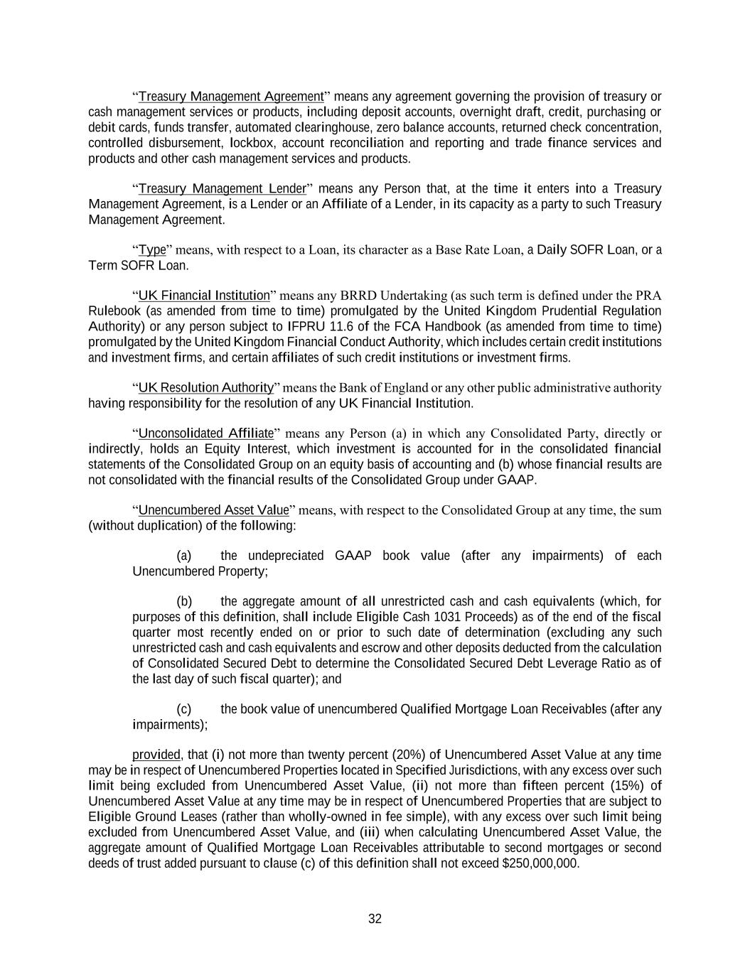 32 “Treasury Management Agreement” means any agreement governing the provision of treasury or cash management services or products, including deposit accounts, overnight draft, credit, purchasing or debit cards, funds transfer, automated clearinghouse, zero balance accounts, returned check concentration, controlled disbursement, lockbox, account reconciliation and reporting and trade finance services and products and other cash management services and products. “Treasury Management Lender” means any Person that, at the time it enters into a Treasury Management Agreement, is a Lender or an Affiliate of a Lender, in its capacity as a party to such Treasury Management Agreement. “Type” means, with respect to a Loan, its character as a Base Rate Loan, a Daily SOFR Loan, or a Term SOFR Loan. “UK Financial Institution” means any BRRD Undertaking (as such term is defined under the PRA Rulebook (as amended from time to time) promulgated by the United Kingdom Prudential Regulation Authority) or any person subject to IFPRU 11.6 of the FCA Handbook (as amended from time to time) promulgated by the United Kingdom Financial Conduct Authority, which includes certain credit institutions and investment firms, and certain affiliates of such credit institutions or investment firms. “UK Resolution Authority” means the Bank of England or any other public administrative authority having responsibility for the resolution of any UK Financial Institution. “Unconsolidated Affiliate” means any Person (a) in which any Consolidated Party, directly or indirectly, holds an Equity Interest, which investment is accounted for in the consolidated financial statements of the Consolidated Group on an equity basis of accounting and (b) whose financial results are not consolidated with the financial results of the Consolidated Group under GAAP. “Unencumbered Asset Value” means, with respect to the Consolidated Group at any time, the sum (without duplication) of the following: (a) the undepreciated GAAP book value (after any impairments) of each Unencumbered Property; (b) the aggregate amount of all unrestricted cash and cash equivalents (which, for purposes of this definition, shall include Eligible Cash 1031 Proceeds) as of the end of the fiscal quarter most recently ended on or prior to such date of determination (excluding any such unrestricted cash and cash equivalents and escrow and other deposits deducted from the calculation of Consolidated Secured Debt to determine the Consolidated Secured Debt Leverage Ratio as of the last day of such fiscal quarter); and (c) the book value of unencumbered Qualified Mortgage Loan Receivables (after any impairments); provided, that (i) not more than twenty percent (20%) of Unencumbered Asset Value at any time may be in respect of Unencumbered Properties located in Specified Jurisdictions, with any excess over such limit being excluded from Unencumbered Asset Value, (ii) not more than fifteen percent (15%) of Unencumbered Asset Value at any time may be in respect of Unencumbered Properties that are subject to Eligible Ground Leases (rather than wholly-owned in fee simple), with any excess over such limit being excluded from Unencumbered Asset Value, and (iii) when calculating Unencumbered Asset Value, the aggregate amount of Qualified Mortgage Loan Receivables attributable to second mortgages or second deeds of trust added pursuant to clause (c) of this definition shall not exceed $250,000,000.