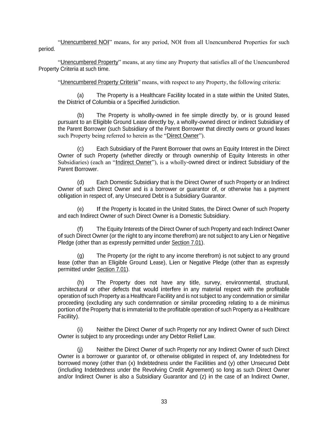33 “Unencumbered NOI” means, for any period, NOI from all Unencumbered Properties for such period. “Unencumbered Property” means, at any time any Property that satisfies all of the Unencumbered Property Criteria at such time. “Unencumbered Property Criteria” means, with respect to any Property, the following criteria: (a) The Property is a Healthcare Facility located in a state within the United States, the District of Columbia or a Specified Jurisdiction. (b) The Property is wholly-owned in fee simple directly by, or is ground leased pursuant to an Eligible Ground Lease directly by, a wholly-owned direct or indirect Subsidiary of the Parent Borrower (such Subsidiary of the Parent Borrower that directly owns or ground leases such Property being referred to herein as the “Direct Owner”). (c) Each Subsidiary of the Parent Borrower that owns an Equity Interest in the Direct Owner of such Property (whether directly or through ownership of Equity Interests in other Subsidiaries) (each an “Indirect Owner”), is a wholly-owned direct or indirect Subsidiary of the Parent Borrower. (d) Each Domestic Subsidiary that is the Direct Owner of such Property or an Indirect Owner of such Direct Owner and is a borrower or guarantor of, or otherwise has a payment obligation in respect of, any Unsecured Debt is a Subsidiary Guarantor. (e) If the Property is located in the United States, the Direct Owner of such Property and each Indirect Owner of such Direct Owner is a Domestic Subsidiary. (f) The Equity Interests of the Direct Owner of such Property and each Indirect Owner of such Direct Owner (or the right to any income therefrom) are not subject to any Lien or Negative Pledge (other than as expressly permitted under Section 7.01). (g) The Property (or the right to any income therefrom) is not subject to any ground lease (other than an Eligible Ground Lease), Lien or Negative Pledge (other than as expressly permitted under Section 7.01). (h) The Property does not have any title, survey, environmental, structural, architectural or other defects that would interfere in any material respect with the profitable operation of such Property as a Healthcare Facility and is not subject to any condemnation or similar proceeding (excluding any such condemnation or similar proceeding relating to a de minimus portion of the Property that is immaterial to the profitable operation of such Property as a Healthcare Facility). (i) Neither the Direct Owner of such Property nor any Indirect Owner of such Direct Owner is subject to any proceedings under any Debtor Relief Law. (j) Neither the Direct Owner of such Property nor any Indirect Owner of such Direct Owner is a borrower or guarantor of, or otherwise obligated in respect of, any Indebtedness for borrowed money (other than (x) Indebtedness under the Facilities and (y) other Unsecured Debt (including Indebtedness under the Revolving Credit Agreement) so long as such Direct Owner and/or Indirect Owner is also a Subsidiary Guarantor and (z) in the case of an Indirect Owner,
