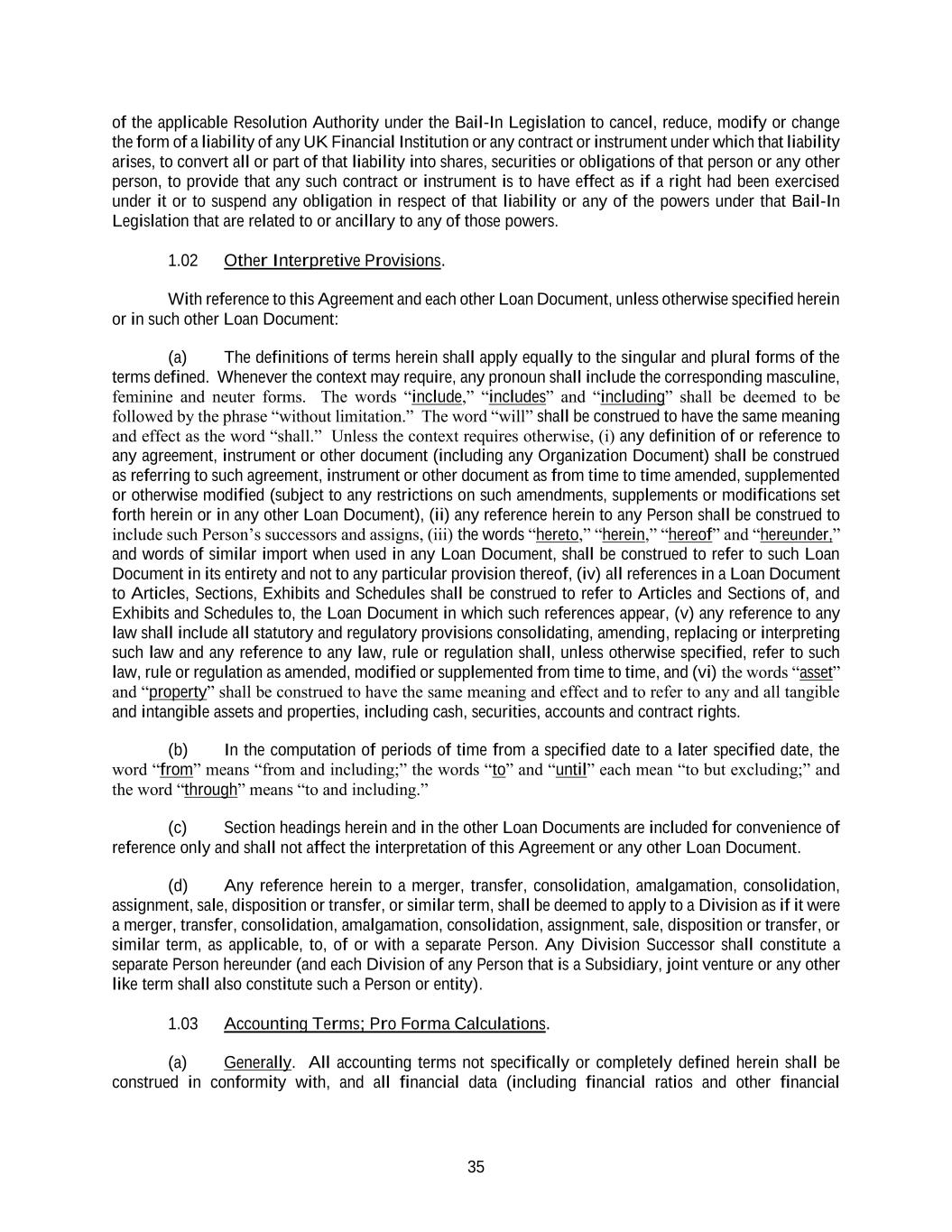 35 of the applicable Resolution Authority under the Bail-In Legislation to cancel, reduce, modify or change the form of a liability of any UK Financial Institution or any contract or instrument under which that liability arises, to convert all or part of that liability into shares, securities or obligations of that person or any other person, to provide that any such contract or instrument is to have effect as if a right had been exercised under it or to suspend any obligation in respect of that liability or any of the powers under that Bail-In Legislation that are related to or ancillary to any of those powers. 1.02 Other Interpretive Provisions. With reference to this Agreement and each other Loan Document, unless otherwise specified herein or in such other Loan Document: (a) The definitions of terms herein shall apply equally to the singular and plural forms of the terms defined. Whenever the context may require, any pronoun shall include the corresponding masculine, feminine and neuter forms. The words “include,” “includes” and “including” shall be deemed to be followed by the phrase “without limitation.” The word “will” shall be construed to have the same meaning and effect as the word “shall.” Unless the context requires otherwise, (i) any definition of or reference to any agreement, instrument or other document (including any Organization Document) shall be construed as referring to such agreement, instrument or other document as from time to time amended, supplemented or otherwise modified (subject to any restrictions on such amendments, supplements or modifications set forth herein or in any other Loan Document), (ii) any reference herein to any Person shall be construed to include such Person’s successors and assigns, (iii) the words “hereto,” “herein,” “hereof” and “hereunder,” and words of similar import when used in any Loan Document, shall be construed to refer to such Loan Document in its entirety and not to any particular provision thereof, (iv) all references in a Loan Document to Articles, Sections, Exhibits and Schedules shall be construed to refer to Articles and Sections of, and Exhibits and Schedules to, the Loan Document in which such references appear, (v) any reference to any law shall include all statutory and regulatory provisions consolidating, amending, replacing or interpreting such law and any reference to any law, rule or regulation shall, unless otherwise specified, refer to such law, rule or regulation as amended, modified or supplemented from time to time, and (vi) the words “asset” and “property” shall be construed to have the same meaning and effect and to refer to any and all tangible and intangible assets and properties, including cash, securities, accounts and contract rights. (b) In the computation of periods of time from a specified date to a later specified date, the word “from” means “from and including;” the words “to” and “until” each mean “to but excluding;” and the word “through” means “to and including.” (c) Section headings herein and in the other Loan Documents are included for convenience of reference only and shall not affect the interpretation of this Agreement or any other Loan Document. (d) Any reference herein to a merger, transfer, consolidation, amalgamation, consolidation, assignment, sale, disposition or transfer, or similar term, shall be deemed to apply to a Division as if it were a merger, transfer, consolidation, amalgamation, consolidation, assignment, sale, disposition or transfer, or similar term, as applicable, to, of or with a separate Person. Any Division Successor shall constitute a separate Person hereunder (and each Division of any Person that is a Subsidiary, joint venture or any other like term shall also constitute such a Person or entity). 1.03 Accounting Terms; Pro Forma Calculations. (a) Generally. All accounting terms not specifically or completely defined herein shall be construed in conformity with, and all financial data (including financial ratios and other financial