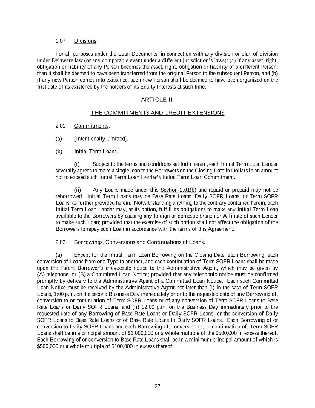 37 1.07 Divisions. For all purposes under the Loan Documents, in connection with any division or plan of division under Delaware law (or any comparable event under a different jurisdiction’s laws): (a) if any asset, right, obligation or liability of any Person becomes the asset, right, obligation or liability of a different Person, then it shall be deemed to have been transferred from the original Person to the subsequent Person, and (b) if any new Person comes into existence, such new Person shall be deemed to have been organized on the first date of its existence by the holders of its Equity Interests at such time. ARTICLE II. THE COMMITMENTS AND CREDIT EXTENSIONS 2.01 Commitments. (a) [Intentionally Omitted]. (b) Initial Term Loans. (i) Subject to the terms and conditions set forth herein, each Initial Term Loan Lender severally agrees to make a single loan to the Borrowers on the Closing Date in Dollars in an amount not to exceed such Initial Term Loan Lender’s Initial Term Loan Commitment. (ii) Any Loans made under this Section 2.01(b) and repaid or prepaid may not be reborrowed. Initial Term Loans may be Base Rate Loans, Daily SOFR Loans, or Term SOFR Loans, as further provided herein. Notwithstanding anything to the contrary contained herein, each Initial Term Loan Lender may, at its option, fulfill its obligations to make any Initial Term Loan available to the Borrowers by causing any foreign or domestic branch or Affiliate of such Lender to make such Loan; provided that the exercise of such option shall not affect the obligation of the Borrowers to repay such Loan in accordance with the terms of this Agreement. 2.02 Borrowings, Conversions and Continuations of Loans. (a) Except for the Initial Term Loan Borrowing on the Closing Date, each Borrowing, each conversion of Loans from one Type to another, and each continuation of Term SOFR Loans shall be made upon the Parent Borrower’s irrevocable notice to the Administrative Agent, which may be given by (A) telephone, or (B) a Committed Loan Notice; provided that any telephonic notice must be confirmed promptly by delivery to the Administrative Agent of a Committed Loan Notice. Each such Committed Loan Notice must be received by the Administrative Agent not later than (i) in the case of Term SOFR Loans, 1:00 p.m. on the second Business Day immediately prior to the requested date of any Borrowing of, conversion to or continuation of Term SOFR Loans or of any conversion of Term SOFR Loans to Base Rate Loans or Daily SOFR Loans, and (ii) 12:00 p.m. on the Business Day immediately prior to the requested date of any Borrowing of Base Rate Loans or Daily SOFR Loans or the conversion of Daily SOFR Loans to Base Rate Loans or of Base Rate Loans to Daily SOFR Loans. Each Borrowing of or conversion to Daily SOFR Loans and each Borrowing of, conversion to, or continuation of, Term SOFR Loans shall be in a principal amount of $1,000,000 or a whole multiple of the $500,000 in excess thereof. Each Borrowing of or conversion to Base Rate Loans shall be in a minimum principal amount of which is $500,000 or a whole multiple of $100,000 in excess thereof.