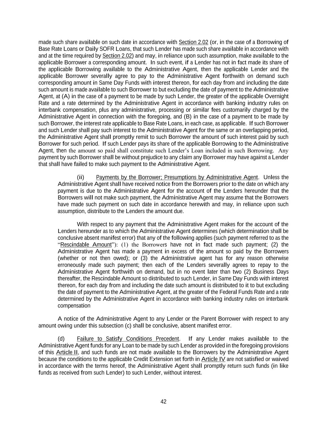 42 made such share available on such date in accordance with Section 2.02 (or, in the case of a Borrowing of Base Rate Loans or Daily SOFR Loans, that such Lender has made such share available in accordance with and at the time required by Section 2.02) and may, in reliance upon such assumption, make available to the applicable Borrower a corresponding amount. In such event, if a Lender has not in fact made its share of the applicable Borrowing available to the Administrative Agent, then the applicable Lender and the applicable Borrower severally agree to pay to the Administrative Agent forthwith on demand such corresponding amount in Same Day Funds with interest thereon, for each day from and including the date such amount is made available to such Borrower to but excluding the date of payment to the Administrative Agent, at (A) in the case of a payment to be made by such Lender, the greater of the applicable Overnight Rate and a rate determined by the Administrative Agent in accordance with banking industry rules on interbank compensation, plus any administrative, processing or similar fees customarily charged by the Administrative Agent in connection with the foregoing, and (B) in the case of a payment to be made by such Borrower, the interest rate applicable to Base Rate Loans, in each case, as applicable. If such Borrower and such Lender shall pay such interest to the Administrative Agent for the same or an overlapping period, the Administrative Agent shall promptly remit to such Borrower the amount of such interest paid by such Borrower for such period. If such Lender pays its share of the applicable Borrowing to the Administrative Agent, then the amount so paid shall constitute such Lender’s Loan included in such Borrowing. Any payment by such Borrower shall be without prejudice to any claim any Borrower may have against a Lender that shall have failed to make such payment to the Administrative Agent. (ii) Payments by the Borrower; Presumptions by Administrative Agent. Unless the Administrative Agent shall have received notice from the Borrowers prior to the date on which any payment is due to the Administrative Agent for the account of the Lenders hereunder that the Borrowers will not make such payment, the Administrative Agent may assume that the Borrowers have made such payment on such date in accordance herewith and may, in reliance upon such assumption, distribute to the Lenders the amount due. With respect to any payment that the Administrative Agent makes for the account of the Lenders hereunder as to which the Administrative Agent determines (which determination shall be conclusive absent manifest error) that any of the following applies (such payment referred to as the “Rescindable Amount”): (1) the Borrowers have not in fact made such payment; (2) the Administrative Agent has made a payment in excess of the amount so paid by the Borrowers (whether or not then owed); or (3) the Administrative agent has for any reason otherwise erroneously made such payment; then each of the Lenders severally agrees to repay to the Administrative Agent forthwith on demand, but in no event later than two (2) Business Days thereafter, the Rescindable Amount so distributed to such Lender, in Same Day Funds with interest thereon, for each day from and including the date such amount is distributed to it to but excluding the date of payment to the Administrative Agent, at the greater of the Federal Funds Rate and a rate determined by the Administrative Agent in accordance with banking industry rules on interbank compensation A notice of the Administrative Agent to any Lender or the Parent Borrower with respect to any amount owing under this subsection (c) shall be conclusive, absent manifest error. (d) Failure to Satisfy Conditions Precedent. If any Lender makes available to the Administrative Agent funds for any Loan to be made by such Lender as provided in the foregoing provisions of this Article II, and such funds are not made available to the Borrowers by the Administrative Agent because the conditions to the applicable Credit Extension set forth in Article IV are not satisfied or waived in accordance with the terms hereof, the Administrative Agent shall promptly return such funds (in like funds as received from such Lender) to such Lender, without interest.