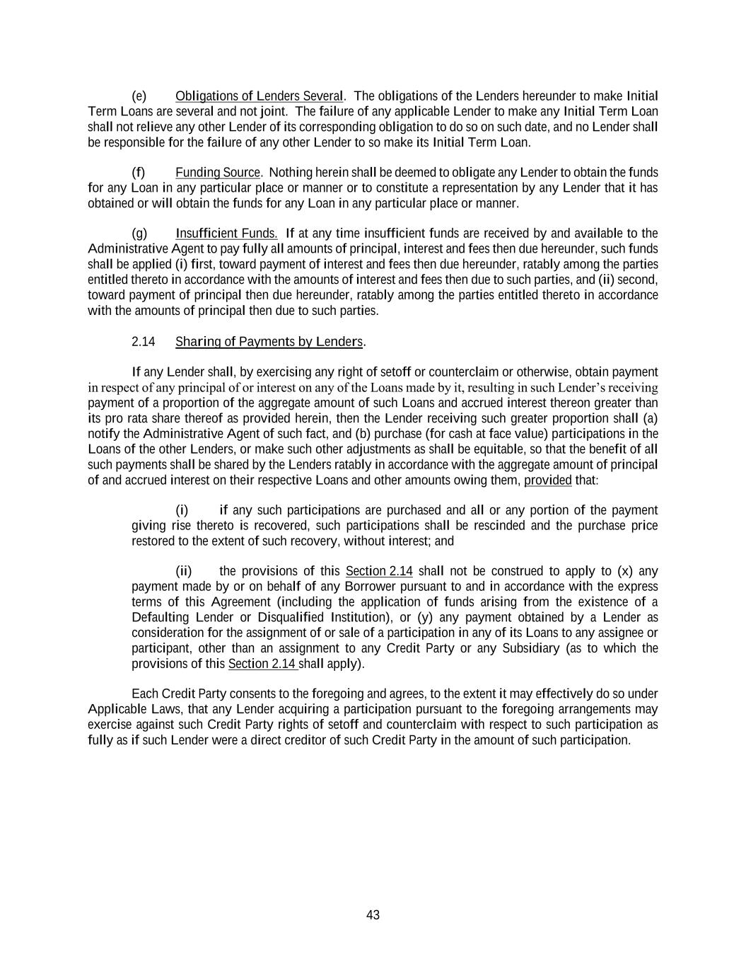 43 (e) Obligations of Lenders Several. The obligations of the Lenders hereunder to make Initial Term Loans are several and not joint. The failure of any applicable Lender to make any Initial Term Loan shall not relieve any other Lender of its corresponding obligation to do so on such date, and no Lender shall be responsible for the failure of any other Lender to so make its Initial Term Loan. (f) Funding Source. Nothing herein shall be deemed to obligate any Lender to obtain the funds for any Loan in any particular place or manner or to constitute a representation by any Lender that it has obtained or will obtain the funds for any Loan in any particular place or manner. (g) Insufficient Funds. If at any time insufficient funds are received by and available to the Administrative Agent to pay fully all amounts of principal, interest and fees then due hereunder, such funds shall be applied (i) first, toward payment of interest and fees then due hereunder, ratably among the parties entitled thereto in accordance with the amounts of interest and fees then due to such parties, and (ii) second, toward payment of principal then due hereunder, ratably among the parties entitled thereto in accordance with the amounts of principal then due to such parties. 2.14 Sharing of Payments by Lenders. If any Lender shall, by exercising any right of setoff or counterclaim or otherwise, obtain payment in respect of any principal of or interest on any of the Loans made by it, resulting in such Lender’s receiving payment of a proportion of the aggregate amount of such Loans and accrued interest thereon greater than its pro rata share thereof as provided herein, then the Lender receiving such greater proportion shall (a) notify the Administrative Agent of such fact, and (b) purchase (for cash at face value) participations in the Loans of the other Lenders, or make such other adjustments as shall be equitable, so that the benefit of all such payments shall be shared by the Lenders ratably in accordance with the aggregate amount of principal of and accrued interest on their respective Loans and other amounts owing them, provided that: (i) if any such participations are purchased and all or any portion of the payment giving rise thereto is recovered, such participations shall be rescinded and the purchase price restored to the extent of such recovery, without interest; and (ii) the provisions of this Section 2.14 shall not be construed to apply to (x) any payment made by or on behalf of any Borrower pursuant to and in accordance with the express terms of this Agreement (including the application of funds arising from the existence of a Defaulting Lender or Disqualified Institution), or (y) any payment obtained by a Lender as consideration for the assignment of or sale of a participation in any of its Loans to any assignee or participant, other than an assignment to any Credit Party or any Subsidiary (as to which the provisions of this Section 2.14 shall apply). Each Credit Party consents to the foregoing and agrees, to the extent it may effectively do so under Applicable Laws, that any Lender acquiring a participation pursuant to the foregoing arrangements may exercise against such Credit Party rights of setoff and counterclaim with respect to such participation as fully as if such Lender were a direct creditor of such Credit Party in the amount of such participation.