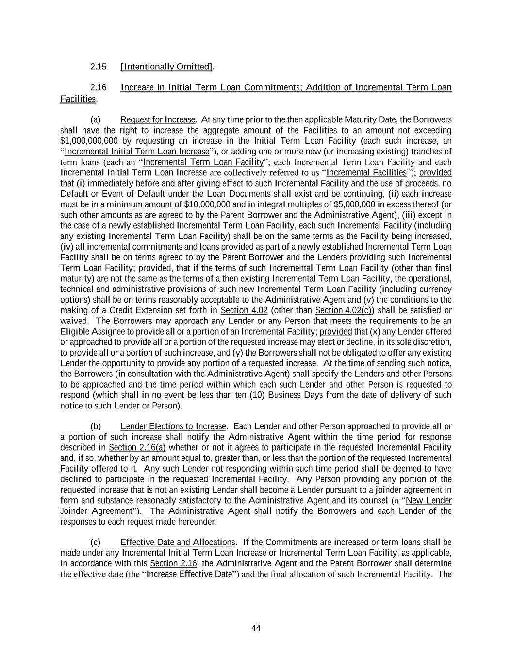 44 2.15 [Intentionally Omitted]. 2.16 Increase in Initial Term Loan Commitments; Addition of Incremental Term Loan Facilities. (a) Request for Increase. At any time prior to the then applicable Maturity Date, the Borrowers shall have the right to increase the aggregate amount of the Facilities to an amount not exceeding $1,000,000,000 by requesting an increase in the Initial Term Loan Facility (each such increase, an “Incremental Initial Term Loan Increase”), or adding one or more new (or increasing existing) tranches of term loans (each an “Incremental Term Loan Facility”; each Incremental Term Loan Facility and each Incremental Initial Term Loan Increase are collectively referred to as “Incremental Facilities”); provided that (i) immediately before and after giving effect to such Incremental Facility and the use of proceeds, no Default or Event of Default under the Loan Documents shall exist and be continuing, (ii) each increase must be in a minimum amount of $10,000,000 and in integral multiples of $5,000,000 in excess thereof (or such other amounts as are agreed to by the Parent Borrower and the Administrative Agent), (iii) except in the case of a newly established Incremental Term Loan Facility, each such Incremental Facility (including any existing Incremental Term Loan Facility) shall be on the same terms as the Facility being increased, (iv) all incremental commitments and loans provided as part of a newly established Incremental Term Loan Facility shall be on terms agreed to by the Parent Borrower and the Lenders providing such Incremental Term Loan Facility; provided, that if the terms of such Incremental Term Loan Facility (other than final maturity) are not the same as the terms of a then existing Incremental Term Loan Facility, the operational, technical and administrative provisions of such new Incremental Term Loan Facility (including currency options) shall be on terms reasonably acceptable to the Administrative Agent and (v) the conditions to the making of a Credit Extension set forth in Section 4.02 (other than Section 4.02(c)) shall be satisfied or waived. The Borrowers may approach any Lender or any Person that meets the requirements to be an Eligible Assignee to provide all or a portion of an Incremental Facility; provided that (x) any Lender offered or approached to provide all or a portion of the requested increase may elect or decline, in its sole discretion, to provide all or a portion of such increase, and (y) the Borrowers shall not be obligated to offer any existing Lender the opportunity to provide any portion of a requested increase. At the time of sending such notice, the Borrowers (in consultation with the Administrative Agent) shall specify the Lenders and other Persons to be approached and the time period within which each such Lender and other Person is requested to respond (which shall in no event be less than ten (10) Business Days from the date of delivery of such notice to such Lender or Person). (b) Lender Elections to Increase. Each Lender and other Person approached to provide all or a portion of such increase shall notify the Administrative Agent within the time period for response described in Section 2.16(a) whether or not it agrees to participate in the requested Incremental Facility and, if so, whether by an amount equal to, greater than, or less than the portion of the requested Incremental Facility offered to it. Any such Lender not responding within such time period shall be deemed to have declined to participate in the requested Incremental Facility. Any Person providing any portion of the requested increase that is not an existing Lender shall become a Lender pursuant to a joinder agreement in form and substance reasonably satisfactory to the Administrative Agent and its counsel (a “New Lender Joinder Agreement”). The Administrative Agent shall notify the Borrowers and each Lender of the responses to each request made hereunder. (c) Effective Date and Allocations. If the Commitments are increased or term loans shall be made under any Incremental Initial Term Loan Increase or Incremental Term Loan Facility, as applicable, in accordance with this Section 2.16, the Administrative Agent and the Parent Borrower shall determine the effective date (the “Increase Effective Date”) and the final allocation of such Incremental Facility. The