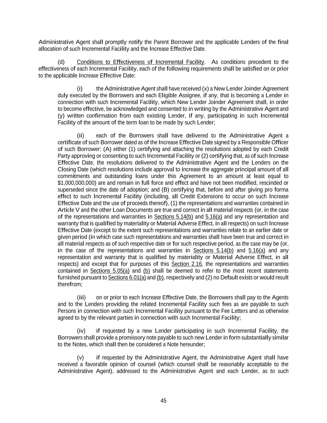 45 Administrative Agent shall promptly notify the Parent Borrower and the applicable Lenders of the final allocation of such Incremental Facility and the Increase Effective Date. (d) Conditions to Effectiveness of Incremental Facility. As conditions precedent to the effectiveness of each Incremental Facility, each of the following requirements shall be satisfied on or prior to the applicable Increase Effective Date: (i) the Administrative Agent shall have received (x) a New Lender Joinder Agreement duly executed by the Borrowers and each Eligible Assignee, if any, that is becoming a Lender in connection with such Incremental Facility, which New Lender Joinder Agreement shall, in order to become effective, be acknowledged and consented to in writing by the Administrative Agent and (y) written confirmation from each existing Lender, if any, participating in such Incremental Facility of the amount of the term loan to be made by such Lender; (ii) each of the Borrowers shall have delivered to the Administrative Agent a certificate of such Borrower dated as of the Increase Effective Date signed by a Responsible Officer of such Borrower: (A) either (1) certifying and attaching the resolutions adopted by each Credit Party approving or consenting to such Incremental Facility or (2) certifying that, as of such Increase Effective Date, the resolutions delivered to the Administrative Agent and the Lenders on the Closing Date (which resolutions include approval to increase the aggregate principal amount of all commitments and outstanding loans under this Agreement to an amount at least equal to $1,000,000,000) are and remain in full force and effect and have not been modified, rescinded or superseded since the date of adoption; and (B) certifying that, before and after giving pro forma effect to such Incremental Facility (including, all Credit Extensions to occur on such Increase Effective Date and the use of proceeds thereof), (1) the representations and warranties contained in Article V and the other Loan Documents are true and correct in all material respects (or, in the case of the representations and warranties in Sections 5.14(b) and 5.16(a) and any representation and warranty that is qualified by materiality or Material Adverse Effect, in all respects) on such Increase Effective Date (except to the extent such representations and warranties relate to an earlier date or given period (in which case such representations and warranties shall have been true and correct in all material respects as of such respective date or for such respective period, as the case may be (or, in the case of the representations and warranties in Sections 5.14(b) and 5.16(a) and any representation and warranty that is qualified by materiality or Material Adverse Effect, in all respects) and except that for purposes of this Section 2.16, the representations and warranties contained in Sections 5.05(a) and (b) shall be deemed to refer to the most recent statements furnished pursuant to Sections 6.01(a) and (b), respectively and (2) no Default exists or would result therefrom; (iii) on or prior to each Increase Effective Date, the Borrowers shall pay to the Agents and to the Lenders providing the related Incremental Facility such fees as are payable to such Persons in connection with such Incremental Facility pursuant to the Fee Letters and as otherwise agreed to by the relevant parties in connection with such Incremental Facility; (iv) if requested by a new Lender participating in such Incremental Facility, the Borrowers shall provide a promissory note payable to such new Lender in form substantially similar to the Notes, which shall then be considered a Note hereunder; (v) if requested by the Administrative Agent, the Administrative Agent shall have received a favorable opinion of counsel (which counsel shall be reasonably acceptable to the Administrative Agent), addressed to the Administrative Agent and each Lender, as to such