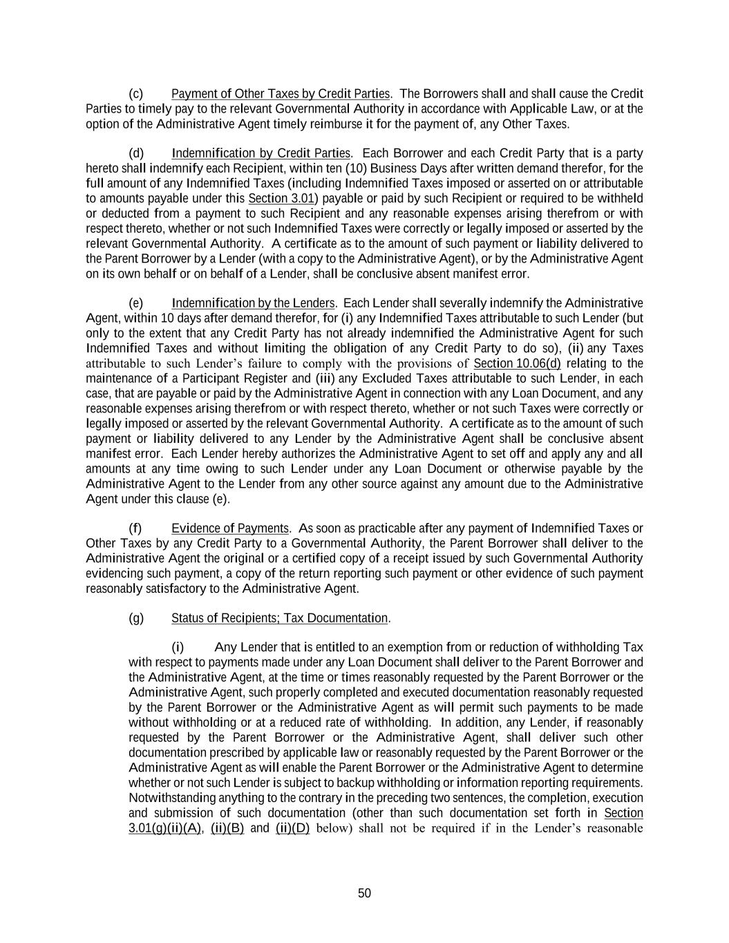 50 (c) Payment of Other Taxes by Credit Parties. The Borrowers shall and shall cause the Credit Parties to timely pay to the relevant Governmental Authority in accordance with Applicable Law, or at the option of the Administrative Agent timely reimburse it for the payment of, any Other Taxes. (d) Indemnification by Credit Parties. Each Borrower and each Credit Party that is a party hereto shall indemnify each Recipient, within ten (10) Business Days after written demand therefor, for the full amount of any Indemnified Taxes (including Indemnified Taxes imposed or asserted on or attributable to amounts payable under this Section 3.01) payable or paid by such Recipient or required to be withheld or deducted from a payment to such Recipient and any reasonable expenses arising therefrom or with respect thereto, whether or not such Indemnified Taxes were correctly or legally imposed or asserted by the relevant Governmental Authority. A certificate as to the amount of such payment or liability delivered to the Parent Borrower by a Lender (with a copy to the Administrative Agent), or by the Administrative Agent on its own behalf or on behalf of a Lender, shall be conclusive absent manifest error. (e) Indemnification by the Lenders. Each Lender shall severally indemnify the Administrative Agent, within 10 days after demand therefor, for (i) any Indemnified Taxes attributable to such Lender (but only to the extent that any Credit Party has not already indemnified the Administrative Agent for such Indemnified Taxes and without limiting the obligation of any Credit Party to do so), (ii) any Taxes attributable to such Lender’s failure to comply with the provisions of Section 10.06(d) relating to the maintenance of a Participant Register and (iii) any Excluded Taxes attributable to such Lender, in each case, that are payable or paid by the Administrative Agent in connection with any Loan Document, and any reasonable expenses arising therefrom or with respect thereto, whether or not such Taxes were correctly or legally imposed or asserted by the relevant Governmental Authority. A certificate as to the amount of such payment or liability delivered to any Lender by the Administrative Agent shall be conclusive absent manifest error. Each Lender hereby authorizes the Administrative Agent to set off and apply any and all amounts at any time owing to such Lender under any Loan Document or otherwise payable by the Administrative Agent to the Lender from any other source against any amount due to the Administrative Agent under this clause (e). (f) Evidence of Payments. As soon as practicable after any payment of Indemnified Taxes or Other Taxes by any Credit Party to a Governmental Authority, the Parent Borrower shall deliver to the Administrative Agent the original or a certified copy of a receipt issued by such Governmental Authority evidencing such payment, a copy of the return reporting such payment or other evidence of such payment reasonably satisfactory to the Administrative Agent. (g) Status of Recipients; Tax Documentation. (i) Any Lender that is entitled to an exemption from or reduction of withholding Tax with respect to payments made under any Loan Document shall deliver to the Parent Borrower and the Administrative Agent, at the time or times reasonably requested by the Parent Borrower or the Administrative Agent, such properly completed and executed documentation reasonably requested by the Parent Borrower or the Administrative Agent as will permit such payments to be made without withholding or at a reduced rate of withholding. In addition, any Lender, if reasonably requested by the Parent Borrower or the Administrative Agent, shall deliver such other documentation prescribed by applicable law or reasonably requested by the Parent Borrower or the Administrative Agent as will enable the Parent Borrower or the Administrative Agent to determine whether or not such Lender is subject to backup withholding or information reporting requirements. Notwithstanding anything to the contrary in the preceding two sentences, the completion, execution and submission of such documentation (other than such documentation set forth in Section 3.01(g)(ii)(A), (ii)(B) and (ii)(D) below) shall not be required if in the Lender’s reasonable