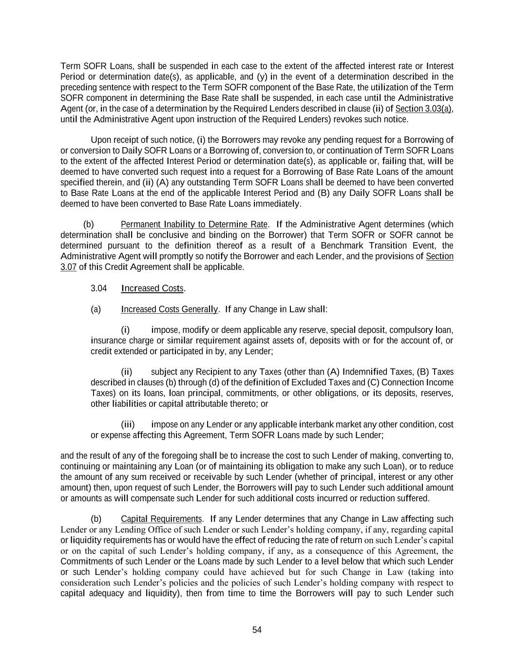 54 Term SOFR Loans, shall be suspended in each case to the extent of the affected interest rate or Interest Period or determination date(s), as applicable, and (y) in the event of a determination described in the preceding sentence with respect to the Term SOFR component of the Base Rate, the utilization of the Term SOFR component in determining the Base Rate shall be suspended, in each case until the Administrative Agent (or, in the case of a determination by the Required Lenders described in clause (ii) of Section 3.03(a), until the Administrative Agent upon instruction of the Required Lenders) revokes such notice. Upon receipt of such notice, (i) the Borrowers may revoke any pending request for a Borrowing of or conversion to Daily SOFR Loans or a Borrowing of, conversion to, or continuation of Term SOFR Loans to the extent of the affected Interest Period or determination date(s), as applicable or, failing that, will be deemed to have converted such request into a request for a Borrowing of Base Rate Loans of the amount specified therein, and (ii) (A) any outstanding Term SOFR Loans shall be deemed to have been converted to Base Rate Loans at the end of the applicable Interest Period and (B) any Daily SOFR Loans shall be deemed to have been converted to Base Rate Loans immediately. (b) Permanent Inability to Determine Rate. If the Administrative Agent determines (which determination shall be conclusive and binding on the Borrower) that Term SOFR or SOFR cannot be determined pursuant to the definition thereof as a result of a Benchmark Transition Event, the Administrative Agent will promptly so notify the Borrower and each Lender, and the provisions of Section 3.07 of this Credit Agreement shall be applicable. 3.04 Increased Costs. (a) Increased Costs Generally. If any Change in Law shall: (i) impose, modify or deem applicable any reserve, special deposit, compulsory loan, insurance charge or similar requirement against assets of, deposits with or for the account of, or credit extended or participated in by, any Lender; (ii) subject any Recipient to any Taxes (other than (A) Indemnified Taxes, (B) Taxes described in clauses (b) through (d) of the definition of Excluded Taxes and (C) Connection Income Taxes) on its loans, loan principal, commitments, or other obligations, or its deposits, reserves, other liabilities or capital attributable thereto; or (iii) impose on any Lender or any applicable interbank market any other condition, cost or expense affecting this Agreement, Term SOFR Loans made by such Lender; and the result of any of the foregoing shall be to increase the cost to such Lender of making, converting to, continuing or maintaining any Loan (or of maintaining its obligation to make any such Loan), or to reduce the amount of any sum received or receivable by such Lender (whether of principal, interest or any other amount) then, upon request of such Lender, the Borrowers will pay to such Lender such additional amount or amounts as will compensate such Lender for such additional costs incurred or reduction suffered. (b) Capital Requirements. If any Lender determines that any Change in Law affecting such Lender or any Lending Office of such Lender or such Lender’s holding company, if any, regarding capital or liquidity requirements has or would have the effect of reducing the rate of return on such Lender’s capital or on the capital of such Lender’s holding company, if any, as a consequence of this Agreement, the Commitments of such Lender or the Loans made by such Lender to a level below that which such Lender or such Lender’s holding company could have achieved but for such Change in Law (taking into consideration such Lender’s policies and the policies of such Lender’s holding company with respect to capital adequacy and liquidity), then from time to time the Borrowers will pay to such Lender such