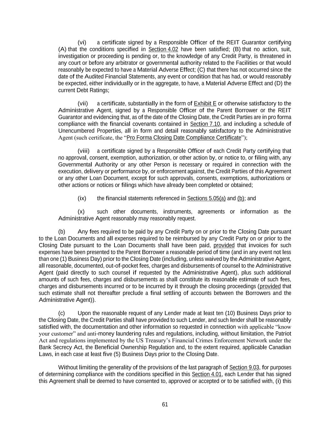 61 (vi) a certificate signed by a Responsible Officer of the REIT Guarantor certifying (A) that the conditions specified in Section 4.02 have been satisfied; (B) that no action, suit, investigation or proceeding is pending or, to the knowledge of any Credit Party, is threatened in any court or before any arbitrator or governmental authority related to the Facilities or that would reasonably be expected to have a Material Adverse Effect; (C) that there has not occurred since the date of the Audited Financial Statements, any event or condition that has had, or would reasonably be expected, either individually or in the aggregate, to have, a Material Adverse Effect and (D) the current Debt Ratings; (vii) a certificate, substantially in the form of Exhibit E or otherwise satisfactory to the Administrative Agent, signed by a Responsible Officer of the Parent Borrower or the REIT Guarantor and evidencing that, as of the date of the Closing Date, the Credit Parties are in pro forma compliance with the financial covenants contained in Section 7.10, and including a schedule of Unencumbered Properties, all in form and detail reasonably satisfactory to the Administrative Agent (such certificate, the “Pro Forma Closing Date Compliance Certificate”); (viii) a certificate signed by a Responsible Officer of each Credit Party certifying that no approval, consent, exemption, authorization, or other action by, or notice to, or filing with, any Governmental Authority or any other Person is necessary or required in connection with the execution, delivery or performance by, or enforcement against, the Credit Parties of this Agreement or any other Loan Document, except for such approvals, consents, exemptions, authorizations or other actions or notices or filings which have already been completed or obtained; (ix) the financial statements referenced in Sections 5.05(a) and (b); and (x) such other documents, instruments, agreements or information as the Administrative Agent reasonably may reasonably request. (b) Any fees required to be paid by any Credit Party on or prior to the Closing Date pursuant to the Loan Documents and all expenses required to be reimbursed by any Credit Party on or prior to the Closing Date pursuant to the Loan Documents shall have been paid, provided that invoices for such expenses have been presented to the Parent Borrower a reasonable period of time (and in any event not less than one (1) Business Day) prior to the Closing Date (including, unless waived by the Administrative Agent, all reasonable, documented, out-of-pocket fees, charges and disbursements of counsel to the Administrative Agent (paid directly to such counsel if requested by the Administrative Agent), plus such additional amounts of such fees, charges and disbursements as shall constitute its reasonable estimate of such fees, charges and disbursements incurred or to be incurred by it through the closing proceedings (provided that such estimate shall not thereafter preclude a final settling of accounts between the Borrowers and the Administrative Agent)). (c) Upon the reasonable request of any Lender made at least ten (10) Business Days prior to the Closing Date, the Credit Parties shall have provided to such Lender, and such lender shall be reasonably satisfied with, the documentation and other information so requested in connection with applicable “know your customer” and anti-money laundering rules and regulations, including, without limitation, the Patriot Act and regulations implemented by the US Treasury’s Financial Crimes Enforcement Network under the Bank Secrecy Act, the Beneficial Ownership Regulation and, to the extent required, applicable Canadian Laws, in each case at least five (5) Business Days prior to the Closing Date. Without limiting the generality of the provisions of the last paragraph of Section 9.03, for purposes of determining compliance with the conditions specified in this Section 4.01, each Lender that has signed this Agreement shall be deemed to have consented to, approved or accepted or to be satisfied with, (i) this