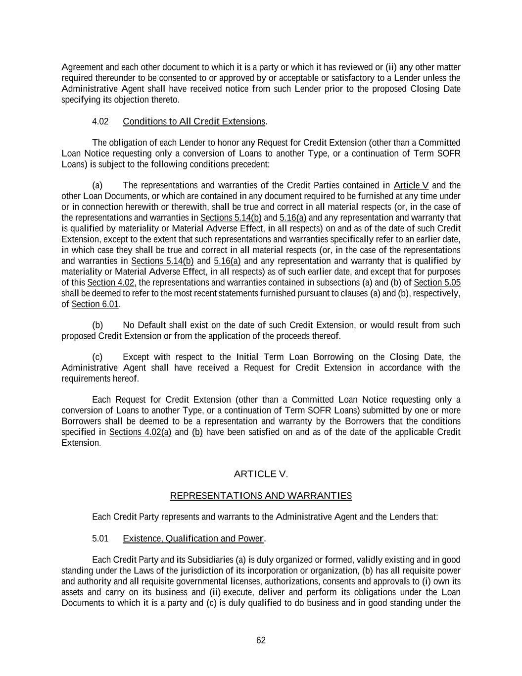 62 Agreement and each other document to which it is a party or which it has reviewed or (ii) any other matter required thereunder to be consented to or approved by or acceptable or satisfactory to a Lender unless the Administrative Agent shall have received notice from such Lender prior to the proposed Closing Date specifying its objection thereto. 4.02 Conditions to All Credit Extensions. The obligation of each Lender to honor any Request for Credit Extension (other than a Committed Loan Notice requesting only a conversion of Loans to another Type, or a continuation of Term SOFR Loans) is subject to the following conditions precedent: (a) The representations and warranties of the Credit Parties contained in Article V and the other Loan Documents, or which are contained in any document required to be furnished at any time under or in connection herewith or therewith, shall be true and correct in all material respects (or, in the case of the representations and warranties in Sections 5.14(b) and 5.16(a) and any representation and warranty that is qualified by materiality or Material Adverse Effect, in all respects) on and as of the date of such Credit Extension, except to the extent that such representations and warranties specifically refer to an earlier date, in which case they shall be true and correct in all material respects (or, in the case of the representations and warranties in Sections 5.14(b) and 5.16(a) and any representation and warranty that is qualified by materiality or Material Adverse Effect, in all respects) as of such earlier date, and except that for purposes of this Section 4.02, the representations and warranties contained in subsections (a) and (b) of Section 5.05 shall be deemed to refer to the most recent statements furnished pursuant to clauses (a) and (b), respectively, of Section 6.01. (b) No Default shall exist on the date of such Credit Extension, or would result from such proposed Credit Extension or from the application of the proceeds thereof. (c) Except with respect to the Initial Term Loan Borrowing on the Closing Date, the Administrative Agent shall have received a Request for Credit Extension in accordance with the requirements hereof. Each Request for Credit Extension (other than a Committed Loan Notice requesting only a conversion of Loans to another Type, or a continuation of Term SOFR Loans) submitted by one or more Borrowers shall be deemed to be a representation and warranty by the Borrowers that the conditions specified in Sections 4.02(a) and (b) have been satisfied on and as of the date of the applicable Credit Extension. ARTICLE V. REPRESENTATIONS AND WARRANTIES Each Credit Party represents and warrants to the Administrative Agent and the Lenders that: 5.01 Existence, Qualification and Power. Each Credit Party and its Subsidiaries (a) is duly organized or formed, validly existing and in good standing under the Laws of the jurisdiction of its incorporation or organization, (b) has all requisite power and authority and all requisite governmental licenses, authorizations, consents and approvals to (i) own its assets and carry on its business and (ii) execute, deliver and perform its obligations under the Loan Documents to which it is a party and (c) is duly qualified to do business and in good standing under the