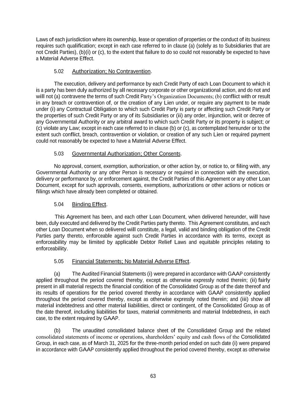 63 Laws of each jurisdiction where its ownership, lease or operation of properties or the conduct of its business requires such qualification; except in each case referred to in clause (a) (solely as to Subsidiaries that are not Credit Parties), (b)(i) or (c), to the extent that failure to do so could not reasonably be expected to have a Material Adverse Effect. 5.02 Authorization; No Contravention. The execution, delivery and performance by each Credit Party of each Loan Document to which it is a party has been duly authorized by all necessary corporate or other organizational action, and do not and will not (a) contravene the terms of such Credit Party’s Organization Documents; (b) conflict with or result in any breach or contravention of, or the creation of any Lien under, or require any payment to be made under (i) any Contractual Obligation to which such Credit Party is party or affecting such Credit Party or the properties of such Credit Party or any of its Subsidiaries or (ii) any order, injunction, writ or decree of any Governmental Authority or any arbitral award to which such Credit Party or its property is subject; or (c) violate any Law; except in each case referred to in clause (b) or (c), as contemplated hereunder or to the extent such conflict, breach, contravention or violation, or creation of any such Lien or required payment could not reasonably be expected to have a Material Adverse Effect. 5.03 Governmental Authorization; Other Consents. No approval, consent, exemption, authorization, or other action by, or notice to, or filing with, any Governmental Authority or any other Person is necessary or required in connection with the execution, delivery or performance by, or enforcement against, the Credit Parties of this Agreement or any other Loan Document, except for such approvals, consents, exemptions, authorizations or other actions or notices or filings which have already been completed or obtained. 5.04 Binding Effect. This Agreement has been, and each other Loan Document, when delivered hereunder, will have been, duly executed and delivered by the Credit Parties party thereto. This Agreement constitutes, and each other Loan Document when so delivered will constitute, a legal, valid and binding obligation of the Credit Parties party thereto, enforceable against such Credit Parties in accordance with its terms, except as enforceability may be limited by applicable Debtor Relief Laws and equitable principles relating to enforceability. 5.05 Financial Statements; No Material Adverse Effect. (a) The Audited Financial Statements (i) were prepared in accordance with GAAP consistently applied throughout the period covered thereby, except as otherwise expressly noted therein; (ii) fairly present in all material respects the financial condition of the Consolidated Group as of the date thereof and its results of operations for the period covered thereby in accordance with GAAP consistently applied throughout the period covered thereby, except as otherwise expressly noted therein; and (iii) show all material indebtedness and other material liabilities, direct or contingent, of the Consolidated Group as of the date thereof, including liabilities for taxes, material commitments and material Indebtedness, in each case, to the extent required by GAAP. (b) The unaudited consolidated balance sheet of the Consolidated Group and the related consolidated statements of income or operations, shareholders’ equity and cash flows of the Consolidated Group, in each case, as of March 31, 2025 for the three-month period ended on such date (i) were prepared in accordance with GAAP consistently applied throughout the period covered thereby, except as otherwise