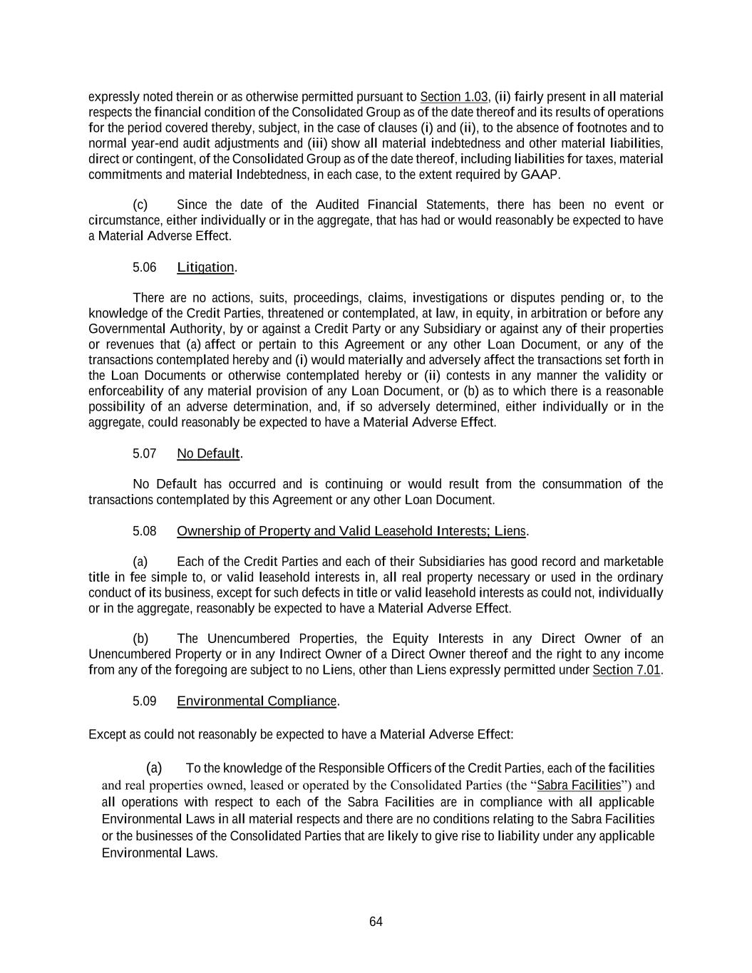 64 expressly noted therein or as otherwise permitted pursuant to Section 1.03, (ii) fairly present in all material respects the financial condition of the Consolidated Group as of the date thereof and its results of operations for the period covered thereby, subject, in the case of clauses (i) and (ii), to the absence of footnotes and to normal year-end audit adjustments and (iii) show all material indebtedness and other material liabilities, direct or contingent, of the Consolidated Group as of the date thereof, including liabilities for taxes, material commitments and material Indebtedness, in each case, to the extent required by GAAP. (c) Since the date of the Audited Financial Statements, there has been no event or circumstance, either individually or in the aggregate, that has had or would reasonably be expected to have a Material Adverse Effect. 5.06 Litigation. There are no actions, suits, proceedings, claims, investigations or disputes pending or, to the knowledge of the Credit Parties, threatened or contemplated, at law, in equity, in arbitration or before any Governmental Authority, by or against a Credit Party or any Subsidiary or against any of their properties or revenues that (a) affect or pertain to this Agreement or any other Loan Document, or any of the transactions contemplated hereby and (i) would materially and adversely affect the transactions set forth in the Loan Documents or otherwise contemplated hereby or (ii) contests in any manner the validity or enforceability of any material provision of any Loan Document, or (b) as to which there is a reasonable possibility of an adverse determination, and, if so adversely determined, either individually or in the aggregate, could reasonably be expected to have a Material Adverse Effect. 5.07 No Default. No Default has occurred and is continuing or would result from the consummation of the transactions contemplated by this Agreement or any other Loan Document. 5.08 Ownership of Property and Valid Leasehold Interests; Liens. (a) Each of the Credit Parties and each of their Subsidiaries has good record and marketable title in fee simple to, or valid leasehold interests in, all real property necessary or used in the ordinary conduct of its business, except for such defects in title or valid leasehold interests as could not, individually or in the aggregate, reasonably be expected to have a Material Adverse Effect. (b) The Unencumbered Properties, the Equity Interests in any Direct Owner of an Unencumbered Property or in any Indirect Owner of a Direct Owner thereof and the right to any income from any of the foregoing are subject to no Liens, other than Liens expressly permitted under Section 7.01. 5.09 Environmental Compliance. Except as could not reasonably be expected to have a Material Adverse Effect: (a) To the knowledge of the Responsible Officers of the Credit Parties, each of the facilities and real properties owned, leased or operated by the Consolidated Parties (the “Sabra Facilities”) and all operations with respect to each of the Sabra Facilities are in compliance with all applicable Environmental Laws in all material respects and there are no conditions relating to the Sabra Facilities or the businesses of the Consolidated Parties that are likely to give rise to liability under any applicable Environmental Laws.