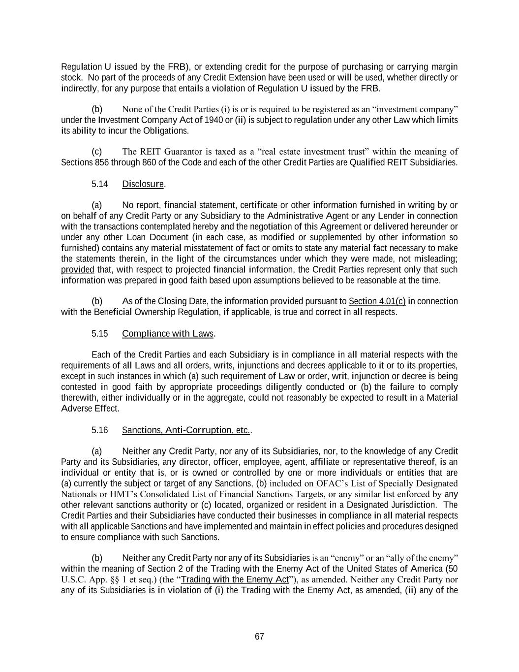 67 Regulation U issued by the FRB), or extending credit for the purpose of purchasing or carrying margin stock. No part of the proceeds of any Credit Extension have been used or will be used, whether directly or indirectly, for any purpose that entails a violation of Regulation U issued by the FRB. (b) None of the Credit Parties (i) is or is required to be registered as an “investment company” under the Investment Company Act of 1940 or (ii) is subject to regulation under any other Law which limits its ability to incur the Obligations. (c) The REIT Guarantor is taxed as a “real estate investment trust” within the meaning of Sections 856 through 860 of the Code and each of the other Credit Parties are Qualified REIT Subsidiaries. 5.14 Disclosure. (a) No report, financial statement, certificate or other information furnished in writing by or on behalf of any Credit Party or any Subsidiary to the Administrative Agent or any Lender in connection with the transactions contemplated hereby and the negotiation of this Agreement or delivered hereunder or under any other Loan Document (in each case, as modified or supplemented by other information so furnished) contains any material misstatement of fact or omits to state any material fact necessary to make the statements therein, in the light of the circumstances under which they were made, not misleading; provided that, with respect to projected financial information, the Credit Parties represent only that such information was prepared in good faith based upon assumptions believed to be reasonable at the time. (b) As of the Closing Date, the information provided pursuant to Section 4.01(c) in connection with the Beneficial Ownership Regulation, if applicable, is true and correct in all respects. 5.15 Compliance with Laws. Each of the Credit Parties and each Subsidiary is in compliance in all material respects with the requirements of all Laws and all orders, writs, injunctions and decrees applicable to it or to its properties, except in such instances in which (a) such requirement of Law or order, writ, injunction or decree is being contested in good faith by appropriate proceedings diligently conducted or (b) the failure to comply therewith, either individually or in the aggregate, could not reasonably be expected to result in a Material Adverse Effect. 5.16 Sanctions, Anti-Corruption, etc.. (a) Neither any Credit Party, nor any of its Subsidiaries, nor, to the knowledge of any Credit Party and its Subsidiaries, any director, officer, employee, agent, affiliate or representative thereof, is an individual or entity that is, or is owned or controlled by one or more individuals or entities that are (a) currently the subject or target of any Sanctions, (b) included on OFAC’s List of Specially Designated Nationals or HMT’s Consolidated List of Financial Sanctions Targets, or any similar list enforced by any other relevant sanctions authority or (c) located, organized or resident in a Designated Jurisdiction. The Credit Parties and their Subsidiaries have conducted their businesses in compliance in all material respects with all applicable Sanctions and have implemented and maintain in effect policies and procedures designed to ensure compliance with such Sanctions. (b) Neither any Credit Party nor any of its Subsidiaries is an “enemy” or an “ally of the enemy” within the meaning of Section 2 of the Trading with the Enemy Act of the United States of America (50 U.S.C. App. §§ 1 et seq.) (the “Trading with the Enemy Act”), as amended. Neither any Credit Party nor any of its Subsidiaries is in violation of (i) the Trading with the Enemy Act, as amended, (ii) any of the