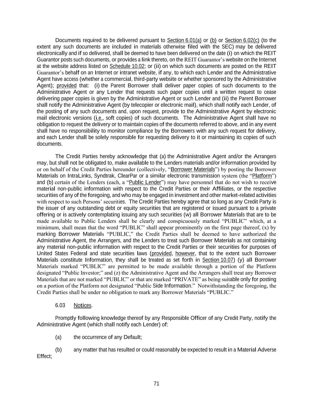 71 Documents required to be delivered pursuant to Section 6.01(a) or (b) or Section 6.02(c) (to the extent any such documents are included in materials otherwise filed with the SEC) may be delivered electronically and if so delivered, shall be deemed to have been delivered on the date (i) on which the REIT Guarantor posts such documents, or provides a link thereto, on the REIT Guarantor’s website on the Internet at the website address listed on Schedule 10.02; or (ii) on which such documents are posted on the REIT Guarantor’s behalf on an Internet or intranet website, if any, to which each Lender and the Administrative Agent have access (whether a commercial, third-party website or whether sponsored by the Administrative Agent); provided that: (i) the Parent Borrower shall deliver paper copies of such documents to the Administrative Agent or any Lender that requests such paper copies until a written request to cease delivering paper copies is given by the Administrative Agent or such Lender and (ii) the Parent Borrower shall notify the Administrative Agent (by telecopier or electronic mail), which shall notify each Lender, of the posting of any such documents and, upon request, provide to the Administrative Agent by electronic mail electronic versions (i.e., soft copies) of such documents. The Administrative Agent shall have no obligation to request the delivery or to maintain copies of the documents referred to above, and in any event shall have no responsibility to monitor compliance by the Borrowers with any such request for delivery, and each Lender shall be solely responsible for requesting delivery to it or maintaining its copies of such documents. The Credit Parties hereby acknowledge that (a) the Administrative Agent and/or the Arrangers may, but shall not be obligated to, make available to the Lenders materials and/or information provided by or on behalf of the Credit Parties hereunder (collectively, “Borrower Materials”) by posting the Borrower Materials on IntraLinks, Syndtrak, ClearPar or a similar electronic transmission system (the “Platform”) and (b) certain of the Lenders (each, a “Public Lender”) may have personnel that do not wish to receive material non-public information with respect to the Credit Parties or their Affiliates, or the respective securities of any of the foregoing, and who may be engaged in investment and other market-related activities with respect to such Persons’ securities. The Credit Parties hereby agree that so long as any Credit Party is the issuer of any outstanding debt or equity securities that are registered or issued pursuant to a private offering or is actively contemplating issuing any such securities (w) all Borrower Materials that are to be made available to Public Lenders shall be clearly and conspicuously marked “PUBLIC” which, at a minimum, shall mean that the word “PUBLIC” shall appear prominently on the first page thereof, (x) by marking Borrower Materials “PUBLIC,” the Credit Parties shall be deemed to have authorized the Administrative Agent, the Arrangers, and the Lenders to treat such Borrower Materials as not containing any material non-public information with respect to the Credit Parties or their securities for purposes of United States Federal and state securities laws (provided, however, that to the extent such Borrower Materials constitute Information, they shall be treated as set forth in Section 10.07) (y) all Borrower Materials marked “PUBLIC” are permitted to be made available through a portion of the Platform designated “Public Investor;” and (z) the Administrative Agent and the Arrangers shall treat any Borrower Materials that are not marked “PUBLIC” or that are marked “PRIVATE” as being suitable only for posting on a portion of the Platform not designated “Public Side Information.” Notwithstanding the foregoing, the Credit Parties shall be under no obligation to mark any Borrower Materials “PUBLIC.” 6.03 Notices. Promptly following knowledge thereof by any Responsible Officer of any Credit Party, notify the Administrative Agent (which shall notify each Lender) of: (a) the occurrence of any Default; (b) any matter that has resulted or could reasonably be expected to result in a Material Adverse Effect;