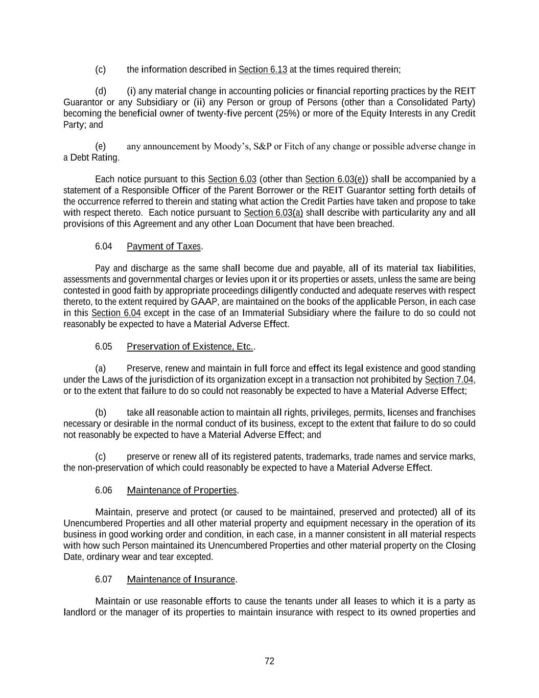 72 (c) the information described in Section 6.13 at the times required therein; (d) (i) any material change in accounting policies or financial reporting practices by the REIT Guarantor or any Subsidiary or (ii) any Person or group of Persons (other than a Consolidated Party) becoming the beneficial owner of twenty-five percent (25%) or more of the Equity Interests in any Credit Party; and (e) any announcement by Moody’s, S&P or Fitch of any change or possible adverse change in a Debt Rating. Each notice pursuant to this Section 6.03 (other than Section 6.03(e)) shall be accompanied by a statement of a Responsible Officer of the Parent Borrower or the REIT Guarantor setting forth details of the occurrence referred to therein and stating what action the Credit Parties have taken and propose to take with respect thereto. Each notice pursuant to Section 6.03(a) shall describe with particularity any and all provisions of this Agreement and any other Loan Document that have been breached. 6.04 Payment of Taxes. Pay and discharge as the same shall become due and payable, all of its material tax liabilities, assessments and governmental charges or levies upon it or its properties or assets, unless the same are being contested in good faith by appropriate proceedings diligently conducted and adequate reserves with respect thereto, to the extent required by GAAP, are maintained on the books of the applicable Person, in each case in this Section 6.04 except in the case of an Immaterial Subsidiary where the failure to do so could not reasonably be expected to have a Material Adverse Effect. 6.05 Preservation of Existence, Etc.. (a) Preserve, renew and maintain in full force and effect its legal existence and good standing under the Laws of the jurisdiction of its organization except in a transaction not prohibited by Section 7.04, or to the extent that failure to do so could not reasonably be expected to have a Material Adverse Effect; (b) take all reasonable action to maintain all rights, privileges, permits, licenses and franchises necessary or desirable in the normal conduct of its business, except to the extent that failure to do so could not reasonably be expected to have a Material Adverse Effect; and (c) preserve or renew all of its registered patents, trademarks, trade names and service marks, the non-preservation of which could reasonably be expected to have a Material Adverse Effect. 6.06 Maintenance of Properties. Maintain, preserve and protect (or caused to be maintained, preserved and protected) all of its Unencumbered Properties and all other material property and equipment necessary in the operation of its business in good working order and condition, in each case, in a manner consistent in all material respects with how such Person maintained its Unencumbered Properties and other material property on the Closing Date, ordinary wear and tear excepted. 6.07 Maintenance of Insurance. Maintain or use reasonable efforts to cause the tenants under all leases to which it is a party as landlord or the manager of its properties to maintain insurance with respect to its owned properties and
