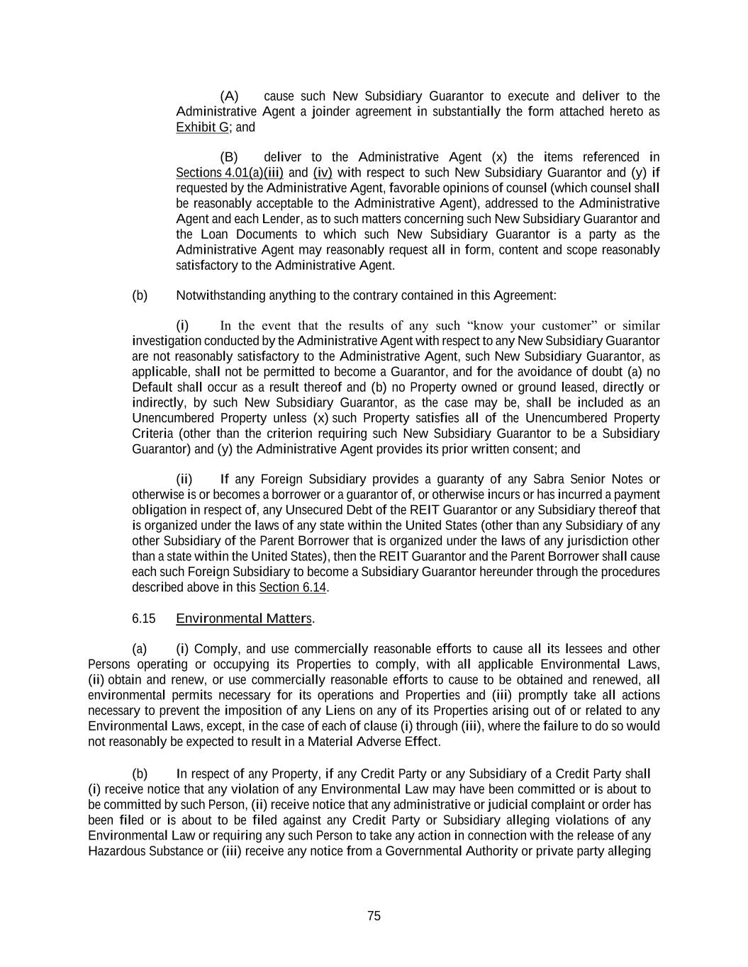 75 (A) cause such New Subsidiary Guarantor to execute and deliver to the Administrative Agent a joinder agreement in substantially the form attached hereto as Exhibit G; and (B) deliver to the Administrative Agent (x) the items referenced in Sections 4.01(a)(iii) and (iv) with respect to such New Subsidiary Guarantor and (y) if requested by the Administrative Agent, favorable opinions of counsel (which counsel shall be reasonably acceptable to the Administrative Agent), addressed to the Administrative Agent and each Lender, as to such matters concerning such New Subsidiary Guarantor and the Loan Documents to which such New Subsidiary Guarantor is a party as the Administrative Agent may reasonably request all in form, content and scope reasonably satisfactory to the Administrative Agent. (b) Notwithstanding anything to the contrary contained in this Agreement: (i) In the event that the results of any such “know your customer” or similar investigation conducted by the Administrative Agent with respect to any New Subsidiary Guarantor are not reasonably satisfactory to the Administrative Agent, such New Subsidiary Guarantor, as applicable, shall not be permitted to become a Guarantor, and for the avoidance of doubt (a) no Default shall occur as a result thereof and (b) no Property owned or ground leased, directly or indirectly, by such New Subsidiary Guarantor, as the case may be, shall be included as an Unencumbered Property unless (x) such Property satisfies all of the Unencumbered Property Criteria (other than the criterion requiring such New Subsidiary Guarantor to be a Subsidiary Guarantor) and (y) the Administrative Agent provides its prior written consent; and (ii) If any Foreign Subsidiary provides a guaranty of any Sabra Senior Notes or otherwise is or becomes a borrower or a guarantor of, or otherwise incurs or has incurred a payment obligation in respect of, any Unsecured Debt of the REIT Guarantor or any Subsidiary thereof that is organized under the laws of any state within the United States (other than any Subsidiary of any other Subsidiary of the Parent Borrower that is organized under the laws of any jurisdiction other than a state within the United States), then the REIT Guarantor and the Parent Borrower shall cause each such Foreign Subsidiary to become a Subsidiary Guarantor hereunder through the procedures described above in this Section 6.14. 6.15 Environmental Matters. (a) (i) Comply, and use commercially reasonable efforts to cause all its lessees and other Persons operating or occupying its Properties to comply, with all applicable Environmental Laws, (ii) obtain and renew, or use commercially reasonable efforts to cause to be obtained and renewed, all environmental permits necessary for its operations and Properties and (iii) promptly take all actions necessary to prevent the imposition of any Liens on any of its Properties arising out of or related to any Environmental Laws, except, in the case of each of clause (i) through (iii), where the failure to do so would not reasonably be expected to result in a Material Adverse Effect. (b) In respect of any Property, if any Credit Party or any Subsidiary of a Credit Party shall (i) receive notice that any violation of any Environmental Law may have been committed or is about to be committed by such Person, (ii) receive notice that any administrative or judicial complaint or order has been filed or is about to be filed against any Credit Party or Subsidiary alleging violations of any Environmental Law or requiring any such Person to take any action in connection with the release of any Hazardous Substance or (iii) receive any notice from a Governmental Authority or private party alleging