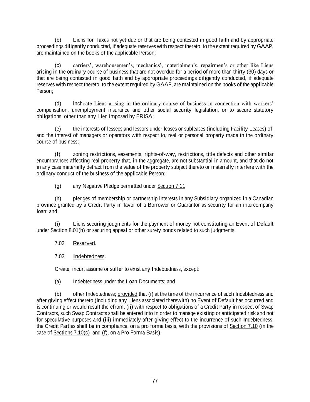 77 (b) Liens for Taxes not yet due or that are being contested in good faith and by appropriate proceedings diligently conducted, if adequate reserves with respect thereto, to the extent required by GAAP, are maintained on the books of the applicable Person; (c) carriers’, warehousemen’s, mechanics’, materialmen’s, repairmen’s or other like Liens arising in the ordinary course of business that are not overdue for a period of more than thirty (30) days or that are being contested in good faith and by appropriate proceedings diligently conducted, if adequate reserves with respect thereto, to the extent required by GAAP, are maintained on the books of the applicable Person; (d) inchoate Liens arising in the ordinary course of business in connection with workers’ compensation, unemployment insurance and other social security legislation, or to secure statutory obligations, other than any Lien imposed by ERISA; (e) the interests of lessees and lessors under leases or subleases (including Facility Leases) of, and the interest of managers or operators with respect to, real or personal property made in the ordinary course of business; (f) zoning restrictions, easements, rights-of-way, restrictions, title defects and other similar encumbrances affecting real property that, in the aggregate, are not substantial in amount, and that do not in any case materially detract from the value of the property subject thereto or materially interfere with the ordinary conduct of the business of the applicable Person; (g) any Negative Pledge permitted under Section 7.11; (h) pledges of membership or partnership interests in any Subsidiary organized in a Canadian province granted by a Credit Party in favor of a Borrower or Guarantor as security for an intercompany loan; and (i) Liens securing judgments for the payment of money not constituting an Event of Default under Section 8.01(h) or securing appeal or other surety bonds related to such judgments. 7.02 Reserved. 7.03 Indebtedness. Create, incur, assume or suffer to exist any Indebtedness, except: (a) Indebtedness under the Loan Documents; and (b) other Indebtedness; provided that (i) at the time of the incurrence of such Indebtedness and after giving effect thereto (including any Liens associated therewith) no Event of Default has occurred and is continuing or would result therefrom, (ii) with respect to obligations of a Credit Party in respect of Swap Contracts, such Swap Contracts shall be entered into in order to manage existing or anticipated risk and not for speculative purposes and (iii) immediately after giving effect to the incurrence of such Indebtedness, the Credit Parties shall be in compliance, on a pro forma basis, with the provisions of Section 7.10 (in the case of Sections 7.10(c) and (f), on a Pro Forma Basis).