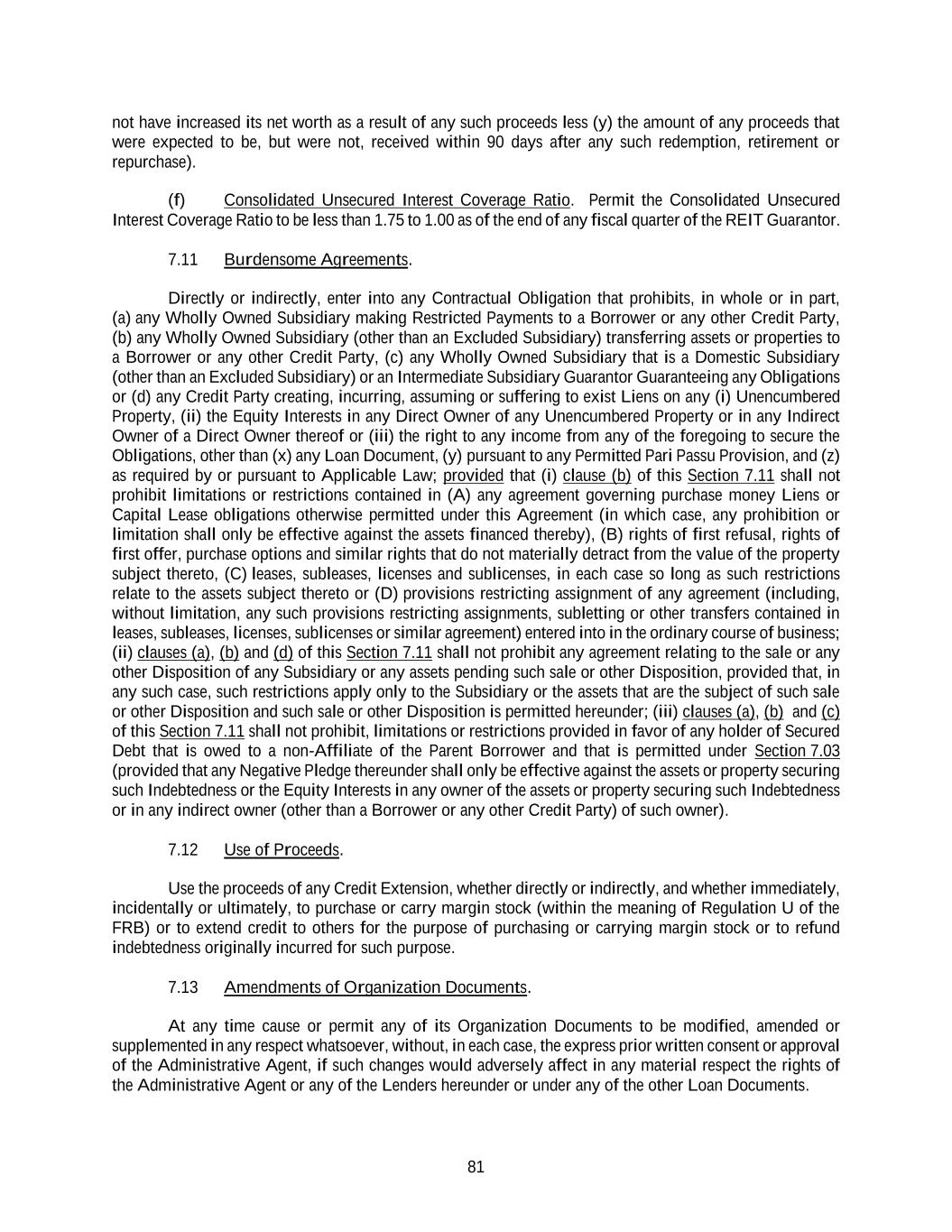 81 not have increased its net worth as a result of any such proceeds less (y) the amount of any proceeds that were expected to be, but were not, received within 90 days after any such redemption, retirement or repurchase). (f) Consolidated Unsecured Interest Coverage Ratio. Permit the Consolidated Unsecured Interest Coverage Ratio to be less than 1.75 to 1.00 as of the end of any fiscal quarter of the REIT Guarantor. 7.11 Burdensome Agreements. Directly or indirectly, enter into any Contractual Obligation that prohibits, in whole or in part, (a) any Wholly Owned Subsidiary making Restricted Payments to a Borrower or any other Credit Party, (b) any Wholly Owned Subsidiary (other than an Excluded Subsidiary) transferring assets or properties to a Borrower or any other Credit Party, (c) any Wholly Owned Subsidiary that is a Domestic Subsidiary (other than an Excluded Subsidiary) or an Intermediate Subsidiary Guarantor Guaranteeing any Obligations or (d) any Credit Party creating, incurring, assuming or suffering to exist Liens on any (i) Unencumbered Property, (ii) the Equity Interests in any Direct Owner of any Unencumbered Property or in any Indirect Owner of a Direct Owner thereof or (iii) the right to any income from any of the foregoing to secure the Obligations, other than (x) any Loan Document, (y) pursuant to any Permitted Pari Passu Provision, and (z) as required by or pursuant to Applicable Law; provided that (i) clause (b) of this Section 7.11 shall not prohibit limitations or restrictions contained in (A) any agreement governing purchase money Liens or Capital Lease obligations otherwise permitted under this Agreement (in which case, any prohibition or limitation shall only be effective against the assets financed thereby), (B) rights of first refusal, rights of first offer, purchase options and similar rights that do not materially detract from the value of the property subject thereto, (C) leases, subleases, licenses and sublicenses, in each case so long as such restrictions relate to the assets subject thereto or (D) provisions restricting assignment of any agreement (including, without limitation, any such provisions restricting assignments, subletting or other transfers contained in leases, subleases, licenses, sublicenses or similar agreement) entered into in the ordinary course of business; (ii) clauses (a), (b) and (d) of this Section 7.11 shall not prohibit any agreement relating to the sale or any other Disposition of any Subsidiary or any assets pending such sale or other Disposition, provided that, in any such case, such restrictions apply only to the Subsidiary or the assets that are the subject of such sale or other Disposition and such sale or other Disposition is permitted hereunder; (iii) clauses (a), (b) and (c) of this Section 7.11 shall not prohibit, limitations or restrictions provided in favor of any holder of Secured Debt that is owed to a non-Affiliate of the Parent Borrower and that is permitted under Section 7.03 (provided that any Negative Pledge thereunder shall only be effective against the assets or property securing such Indebtedness or the Equity Interests in any owner of the assets or property securing such Indebtedness or in any indirect owner (other than a Borrower or any other Credit Party) of such owner). 7.12 Use of Proceeds. Use the proceeds of any Credit Extension, whether directly or indirectly, and whether immediately, incidentally or ultimately, to purchase or carry margin stock (within the meaning of Regulation U of the FRB) or to extend credit to others for the purpose of purchasing or carrying margin stock or to refund indebtedness originally incurred for such purpose. 7.13 Amendments of Organization Documents. At any time cause or permit any of its Organization Documents to be modified, amended or supplemented in any respect whatsoever, without, in each case, the express prior written consent or approval of the Administrative Agent, if such changes would adversely affect in any material respect the rights of the Administrative Agent or any of the Lenders hereunder or under any of the other Loan Documents.