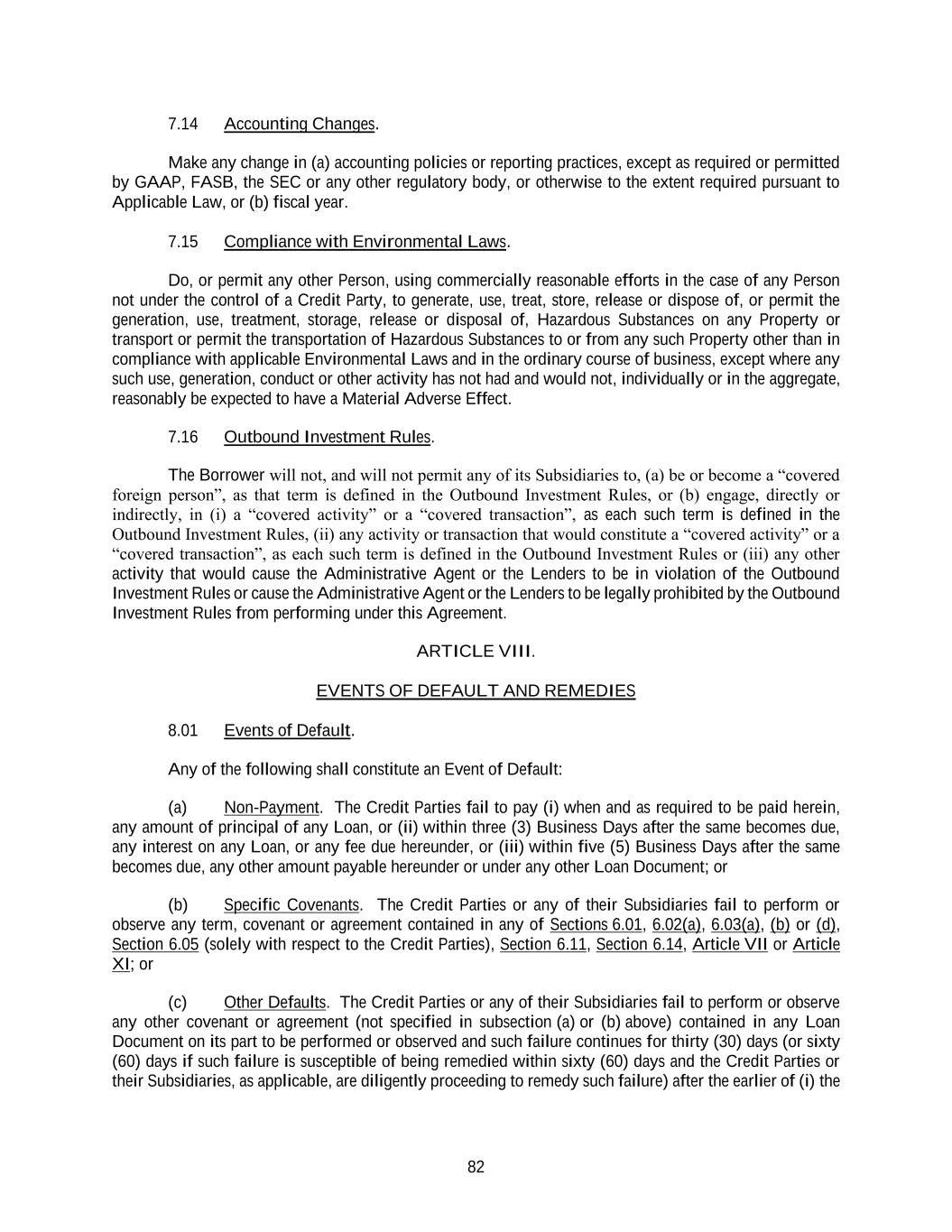 82 7.14 Accounting Changes. Make any change in (a) accounting policies or reporting practices, except as required or permitted by GAAP, FASB, the SEC or any other regulatory body, or otherwise to the extent required pursuant to Applicable Law, or (b) fiscal year. 7.15 Compliance with Environmental Laws. Do, or permit any other Person, using commercially reasonable efforts in the case of any Person not under the control of a Credit Party, to generate, use, treat, store, release or dispose of, or permit the generation, use, treatment, storage, release or disposal of, Hazardous Substances on any Property or transport or permit the transportation of Hazardous Substances to or from any such Property other than in compliance with applicable Environmental Laws and in the ordinary course of business, except where any such use, generation, conduct or other activity has not had and would not, individually or in the aggregate, reasonably be expected to have a Material Adverse Effect. 7.16 Outbound Investment Rules. The Borrower will not, and will not permit any of its Subsidiaries to, (a) be or become a “covered foreign person”, as that term is defined in the Outbound Investment Rules, or (b) engage, directly or indirectly, in (i) a “covered activity” or a “covered transaction”, as each such term is defined in the Outbound Investment Rules, (ii) any activity or transaction that would constitute a “covered activity” or a “covered transaction”, as each such term is defined in the Outbound Investment Rules or (iii) any other activity that would cause the Administrative Agent or the Lenders to be in violation of the Outbound Investment Rules or cause the Administrative Agent or the Lenders to be legally prohibited by the Outbound Investment Rules from performing under this Agreement. ARTICLE VIII. EVENTS OF DEFAULT AND REMEDIES 8.01 Events of Default. Any of the following shall constitute an Event of Default: (a) Non-Payment. The Credit Parties fail to pay (i) when and as required to be paid herein, any amount of principal of any Loan, or (ii) within three (3) Business Days after the same becomes due, any interest on any Loan, or any fee due hereunder, or (iii) within five (5) Business Days after the same becomes due, any other amount payable hereunder or under any other Loan Document; or (b) Specific Covenants. The Credit Parties or any of their Subsidiaries fail to perform or observe any term, covenant or agreement contained in any of Sections 6.01, 6.02(a), 6.03(a), (b) or (d), Section 6.05 (solely with respect to the Credit Parties), Section 6.11, Section 6.14, Article VII or Article XI; or (c) Other Defaults. The Credit Parties or any of their Subsidiaries fail to perform or observe any other covenant or agreement (not specified in subsection (a) or (b) above) contained in any Loan Document on its part to be performed or observed and such failure continues for thirty (30) days (or sixty (60) days if such failure is susceptible of being remedied within sixty (60) days and the Credit Parties or their Subsidiaries, as applicable, are diligently proceeding to remedy such failure) after the earlier of (i) the