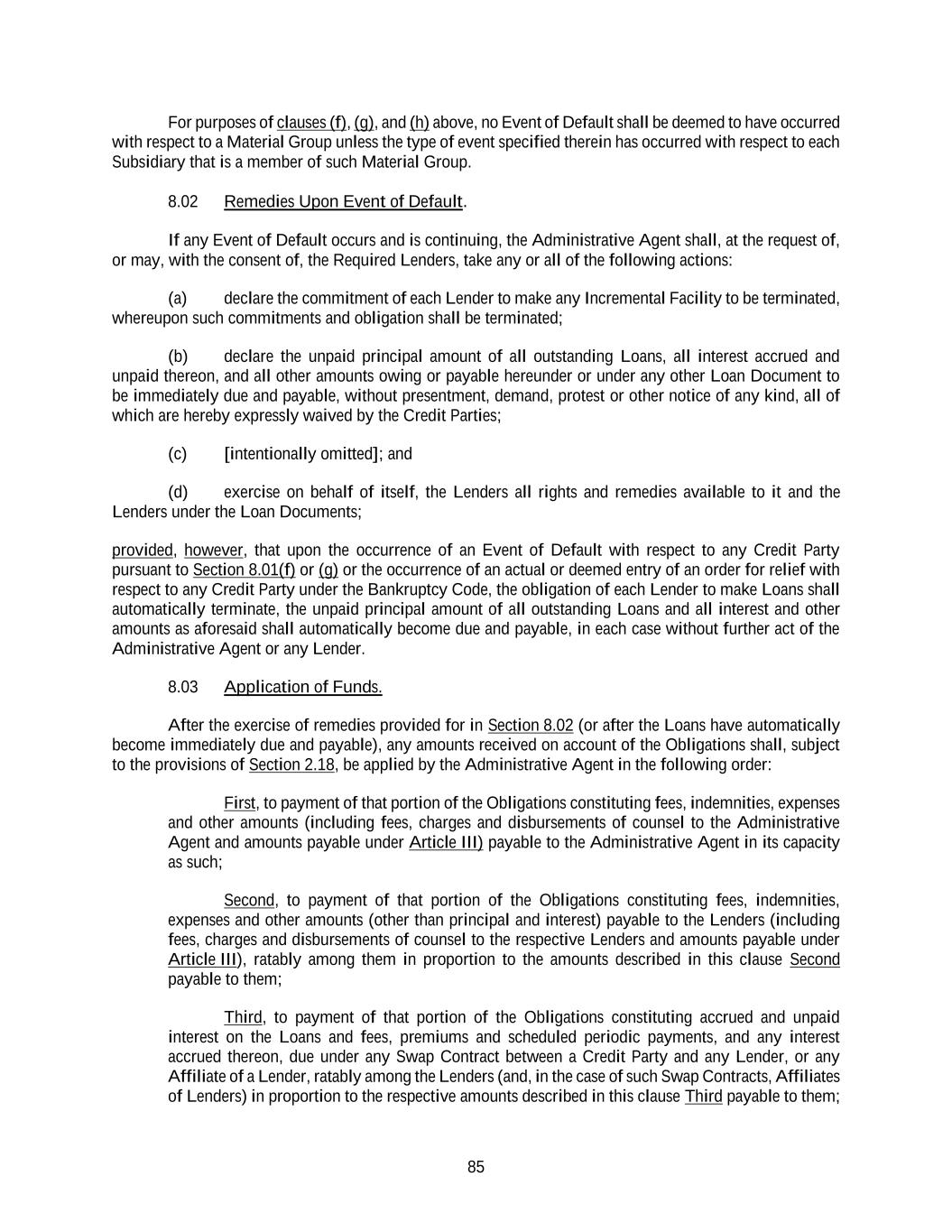 85 For purposes of clauses (f), (g), and (h) above, no Event of Default shall be deemed to have occurred with respect to a Material Group unless the type of event specified therein has occurred with respect to each Subsidiary that is a member of such Material Group. 8.02 Remedies Upon Event of Default. If any Event of Default occurs and is continuing, the Administrative Agent shall, at the request of, or may, with the consent of, the Required Lenders, take any or all of the following actions: (a) declare the commitment of each Lender to make any Incremental Facility to be terminated, whereupon such commitments and obligation shall be terminated; (b) declare the unpaid principal amount of all outstanding Loans, all interest accrued and unpaid thereon, and all other amounts owing or payable hereunder or under any other Loan Document to be immediately due and payable, without presentment, demand, protest or other notice of any kind, all of which are hereby expressly waived by the Credit Parties; (c) [intentionally omitted]; and (d) exercise on behalf of itself, the Lenders all rights and remedies available to it and the Lenders under the Loan Documents; provided, however, that upon the occurrence of an Event of Default with respect to any Credit Party pursuant to Section 8.01(f) or (g) or the occurrence of an actual or deemed entry of an order for relief with respect to any Credit Party under the Bankruptcy Code, the obligation of each Lender to make Loans shall automatically terminate, the unpaid principal amount of all outstanding Loans and all interest and other amounts as aforesaid shall automatically become due and payable, in each case without further act of the Administrative Agent or any Lender. 8.03 Application of Funds. After the exercise of remedies provided for in Section 8.02 (or after the Loans have automatically become immediately due and payable), any amounts received on account of the Obligations shall, subject to the provisions of Section 2.18, be applied by the Administrative Agent in the following order: First, to payment of that portion of the Obligations constituting fees, indemnities, expenses and other amounts (including fees, charges and disbursements of counsel to the Administrative Agent and amounts payable under Article III) payable to the Administrative Agent in its capacity as such; Second, to payment of that portion of the Obligations constituting fees, indemnities, expenses and other amounts (other than principal and interest) payable to the Lenders (including fees, charges and disbursements of counsel to the respective Lenders and amounts payable under Article III), ratably among them in proportion to the amounts described in this clause Second payable to them; Third, to payment of that portion of the Obligations constituting accrued and unpaid interest on the Loans and fees, premiums and scheduled periodic payments, and any interest accrued thereon, due under any Swap Contract between a Credit Party and any Lender, or any Affiliate of a Lender, ratably among the Lenders (and, in the case of such Swap Contracts, Affiliates of Lenders) in proportion to the respective amounts described in this clause Third payable to them;
