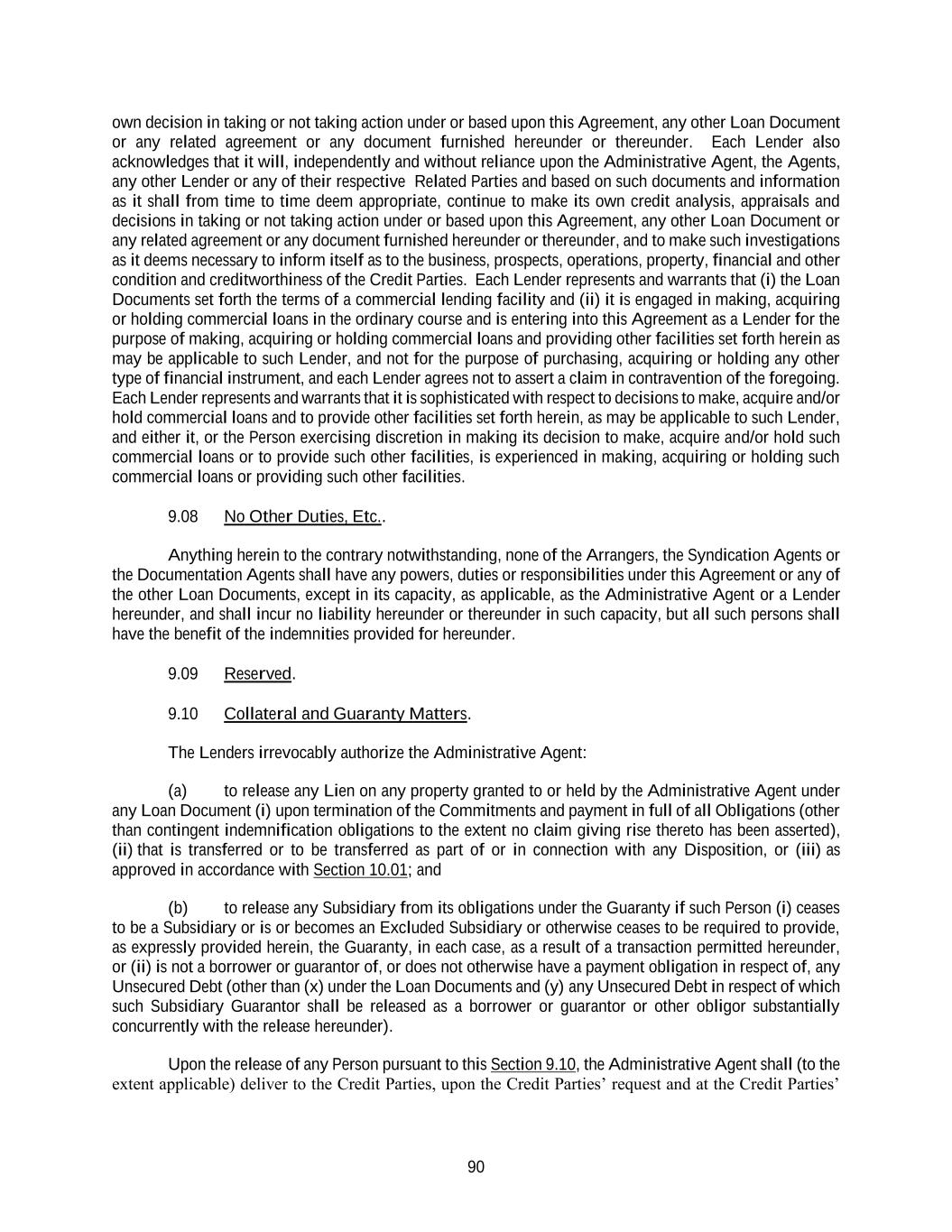90 own decision in taking or not taking action under or based upon this Agreement, any other Loan Document or any related agreement or any document furnished hereunder or thereunder. Each Lender also acknowledges that it will, independently and without reliance upon the Administrative Agent, the Agents, any other Lender or any of their respective Related Parties and based on such documents and information as it shall from time to time deem appropriate, continue to make its own credit analysis, appraisals and decisions in taking or not taking action under or based upon this Agreement, any other Loan Document or any related agreement or any document furnished hereunder or thereunder, and to make such investigations as it deems necessary to inform itself as to the business, prospects, operations, property, financial and other condition and creditworthiness of the Credit Parties. Each Lender represents and warrants that (i) the Loan Documents set forth the terms of a commercial lending facility and (ii) it is engaged in making, acquiring or holding commercial loans in the ordinary course and is entering into this Agreement as a Lender for the purpose of making, acquiring or holding commercial loans and providing other facilities set forth herein as may be applicable to such Lender, and not for the purpose of purchasing, acquiring or holding any other type of financial instrument, and each Lender agrees not to assert a claim in contravention of the foregoing. Each Lender represents and warrants that it is sophisticated with respect to decisions to make, acquire and/or hold commercial loans and to provide other facilities set forth herein, as may be applicable to such Lender, and either it, or the Person exercising discretion in making its decision to make, acquire and/or hold such commercial loans or to provide such other facilities, is experienced in making, acquiring or holding such commercial loans or providing such other facilities. 9.08 No Other Duties, Etc.. Anything herein to the contrary notwithstanding, none of the Arrangers, the Syndication Agents or the Documentation Agents shall have any powers, duties or responsibilities under this Agreement or any of the other Loan Documents, except in its capacity, as applicable, as the Administrative Agent or a Lender hereunder, and shall incur no liability hereunder or thereunder in such capacity, but all such persons shall have the benefit of the indemnities provided for hereunder. 9.09 Reserved. 9.10 Collateral and Guaranty Matters. The Lenders irrevocably authorize the Administrative Agent: (a) to release any Lien on any property granted to or held by the Administrative Agent under any Loan Document (i) upon termination of the Commitments and payment in full of all Obligations (other than contingent indemnification obligations to the extent no claim giving rise thereto has been asserted), (ii) that is transferred or to be transferred as part of or in connection with any Disposition, or (iii) as approved in accordance with Section 10.01; and (b) to release any Subsidiary from its obligations under the Guaranty if such Person (i) ceases to be a Subsidiary or is or becomes an Excluded Subsidiary or otherwise ceases to be required to provide, as expressly provided herein, the Guaranty, in each case, as a result of a transaction permitted hereunder, or (ii) is not a borrower or guarantor of, or does not otherwise have a payment obligation in respect of, any Unsecured Debt (other than (x) under the Loan Documents and (y) any Unsecured Debt in respect of which such Subsidiary Guarantor shall be released as a borrower or guarantor or other obligor substantially concurrently with the release hereunder). Upon the release of any Person pursuant to this Section 9.10, the Administrative Agent shall (to the extent applicable) deliver to the Credit Parties, upon the Credit Parties’ request and at the Credit Parties’
