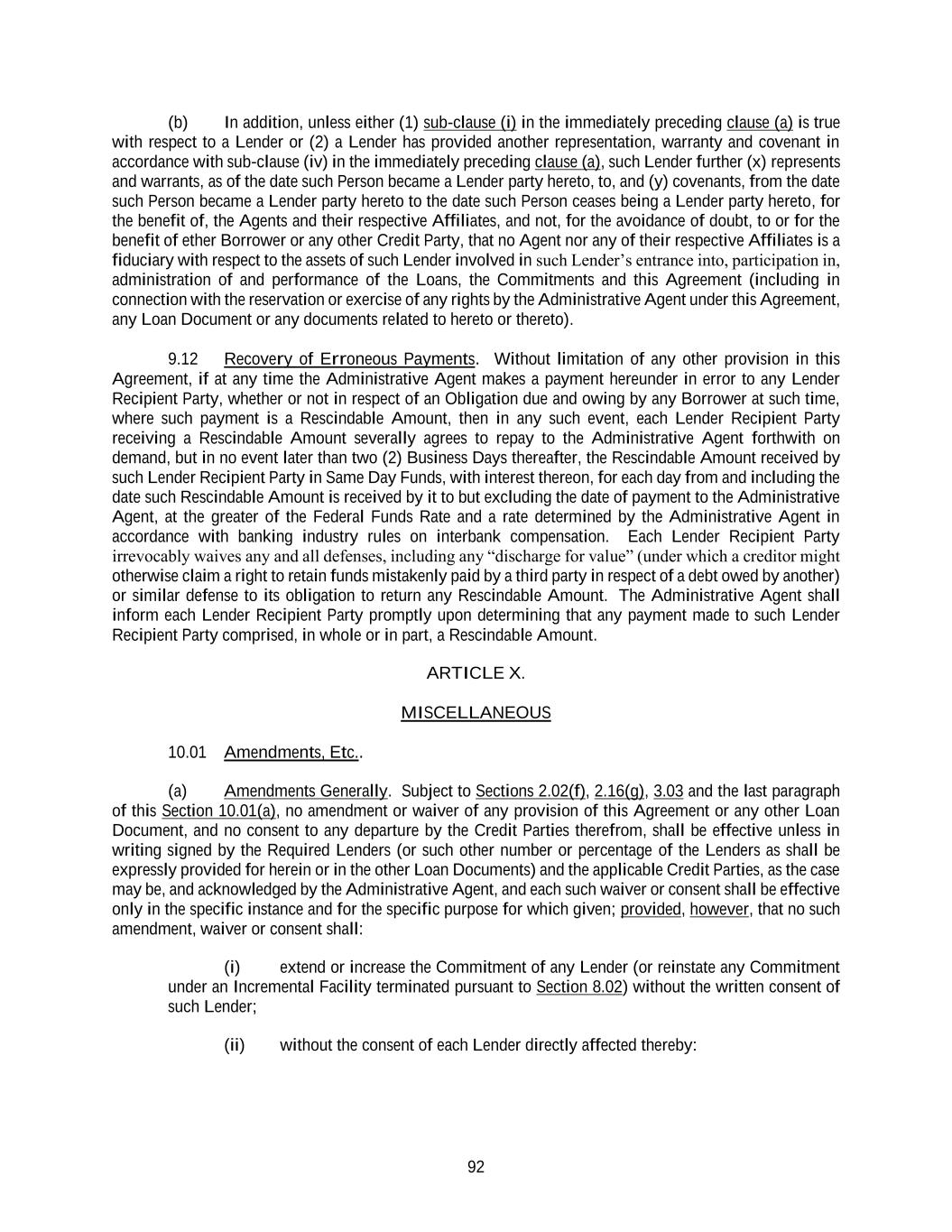 92 (b) In addition, unless either (1) sub-clause (i) in the immediately preceding clause (a) is true with respect to a Lender or (2) a Lender has provided another representation, warranty and covenant in accordance with sub-clause (iv) in the immediately preceding clause (a), such Lender further (x) represents and warrants, as of the date such Person became a Lender party hereto, to, and (y) covenants, from the date such Person became a Lender party hereto to the date such Person ceases being a Lender party hereto, for the benefit of, the Agents and their respective Affiliates, and not, for the avoidance of doubt, to or for the benefit of ether Borrower or any other Credit Party, that no Agent nor any of their respective Affiliates is a fiduciary with respect to the assets of such Lender involved in such Lender’s entrance into, participation in, administration of and performance of the Loans, the Commitments and this Agreement (including in connection with the reservation or exercise of any rights by the Administrative Agent under this Agreement, any Loan Document or any documents related to hereto or thereto). 9.12 Recovery of Erroneous Payments. Without limitation of any other provision in this Agreement, if at any time the Administrative Agent makes a payment hereunder in error to any Lender Recipient Party, whether or not in respect of an Obligation due and owing by any Borrower at such time, where such payment is a Rescindable Amount, then in any such event, each Lender Recipient Party receiving a Rescindable Amount severally agrees to repay to the Administrative Agent forthwith on demand, but in no event later than two (2) Business Days thereafter, the Rescindable Amount received by such Lender Recipient Party in Same Day Funds, with interest thereon, for each day from and including the date such Rescindable Amount is received by it to but excluding the date of payment to the Administrative Agent, at the greater of the Federal Funds Rate and a rate determined by the Administrative Agent in accordance with banking industry rules on interbank compensation. Each Lender Recipient Party irrevocably waives any and all defenses, including any “discharge for value” (under which a creditor might otherwise claim a right to retain funds mistakenly paid by a third party in respect of a debt owed by another) or similar defense to its obligation to return any Rescindable Amount. The Administrative Agent shall inform each Lender Recipient Party promptly upon determining that any payment made to such Lender Recipient Party comprised, in whole or in part, a Rescindable Amount. ARTICLE X. MISCELLANEOUS 10.01 Amendments, Etc.. (a) Amendments Generally. Subject to Sections 2.02(f), 2.16(g), 3.03 and the last paragraph of this Section 10.01(a), no amendment or waiver of any provision of this Agreement or any other Loan Document, and no consent to any departure by the Credit Parties therefrom, shall be effective unless in writing signed by the Required Lenders (or such other number or percentage of the Lenders as shall be expressly provided for herein or in the other Loan Documents) and the applicable Credit Parties, as the case may be, and acknowledged by the Administrative Agent, and each such waiver or consent shall be effective only in the specific instance and for the specific purpose for which given; provided, however, that no such amendment, waiver or consent shall: (i) extend or increase the Commitment of any Lender (or reinstate any Commitment under an Incremental Facility terminated pursuant to Section 8.02) without the written consent of such Lender; (ii) without the consent of each Lender directly affected thereby: