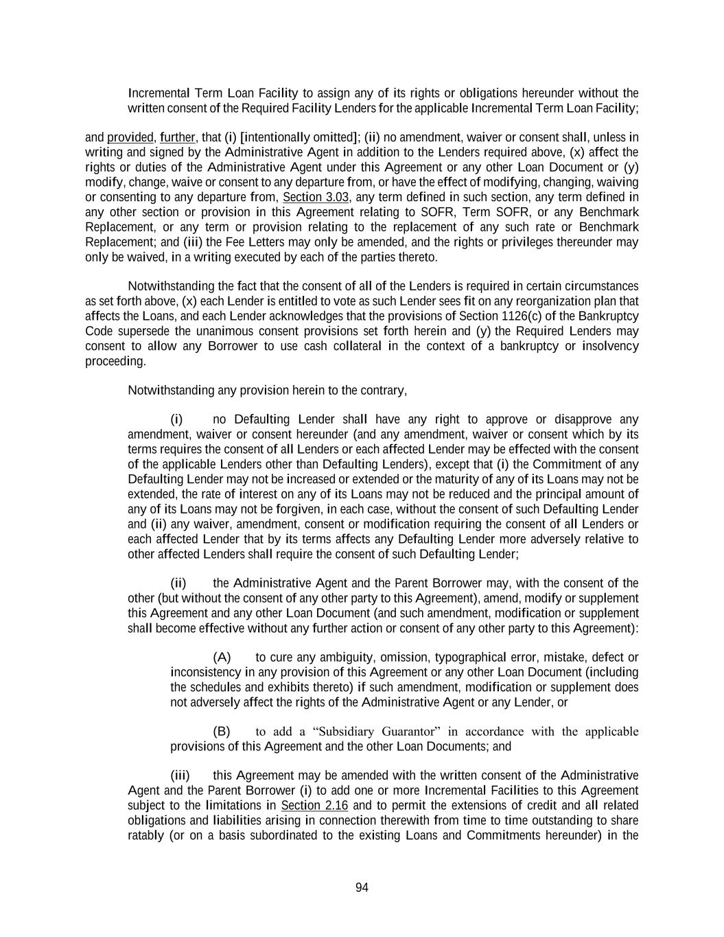 94 Incremental Term Loan Facility to assign any of its rights or obligations hereunder without the written consent of the Required Facility Lenders for the applicable Incremental Term Loan Facility; and provided, further, that (i) [intentionally omitted]; (ii) no amendment, waiver or consent shall, unless in writing and signed by the Administrative Agent in addition to the Lenders required above, (x) affect the rights or duties of the Administrative Agent under this Agreement or any other Loan Document or (y) modify, change, waive or consent to any departure from, or have the effect of modifying, changing, waiving or consenting to any departure from, Section 3.03, any term defined in such section, any term defined in any other section or provision in this Agreement relating to SOFR, Term SOFR, or any Benchmark Replacement, or any term or provision relating to the replacement of any such rate or Benchmark Replacement; and (iii) the Fee Letters may only be amended, and the rights or privileges thereunder may only be waived, in a writing executed by each of the parties thereto. Notwithstanding the fact that the consent of all of the Lenders is required in certain circumstances as set forth above, (x) each Lender is entitled to vote as such Lender sees fit on any reorganization plan that affects the Loans, and each Lender acknowledges that the provisions of Section 1126(c) of the Bankruptcy Code supersede the unanimous consent provisions set forth herein and (y) the Required Lenders may consent to allow any Borrower to use cash collateral in the context of a bankruptcy or insolvency proceeding. Notwithstanding any provision herein to the contrary, (i) no Defaulting Lender shall have any right to approve or disapprove any amendment, waiver or consent hereunder (and any amendment, waiver or consent which by its terms requires the consent of all Lenders or each affected Lender may be effected with the consent of the applicable Lenders other than Defaulting Lenders), except that (i) the Commitment of any Defaulting Lender may not be increased or extended or the maturity of any of its Loans may not be extended, the rate of interest on any of its Loans may not be reduced and the principal amount of any of its Loans may not be forgiven, in each case, without the consent of such Defaulting Lender and (ii) any waiver, amendment, consent or modification requiring the consent of all Lenders or each affected Lender that by its terms affects any Defaulting Lender more adversely relative to other affected Lenders shall require the consent of such Defaulting Lender; (ii) the Administrative Agent and the Parent Borrower may, with the consent of the other (but without the consent of any other party to this Agreement), amend, modify or supplement this Agreement and any other Loan Document (and such amendment, modification or supplement shall become effective without any further action or consent of any other party to this Agreement): (A) to cure any ambiguity, omission, typographical error, mistake, defect or inconsistency in any provision of this Agreement or any other Loan Document (including the schedules and exhibits thereto) if such amendment, modification or supplement does not adversely affect the rights of the Administrative Agent or any Lender, or (B) to add a “Subsidiary Guarantor” in accordance with the applicable provisions of this Agreement and the other Loan Documents; and (iii) this Agreement may be amended with the written consent of the Administrative Agent and the Parent Borrower (i) to add one or more Incremental Facilities to this Agreement subject to the limitations in Section 2.16 and to permit the extensions of credit and all related obligations and liabilities arising in connection therewith from time to time outstanding to share ratably (or on a basis subordinated to the existing Loans and Commitments hereunder) in the