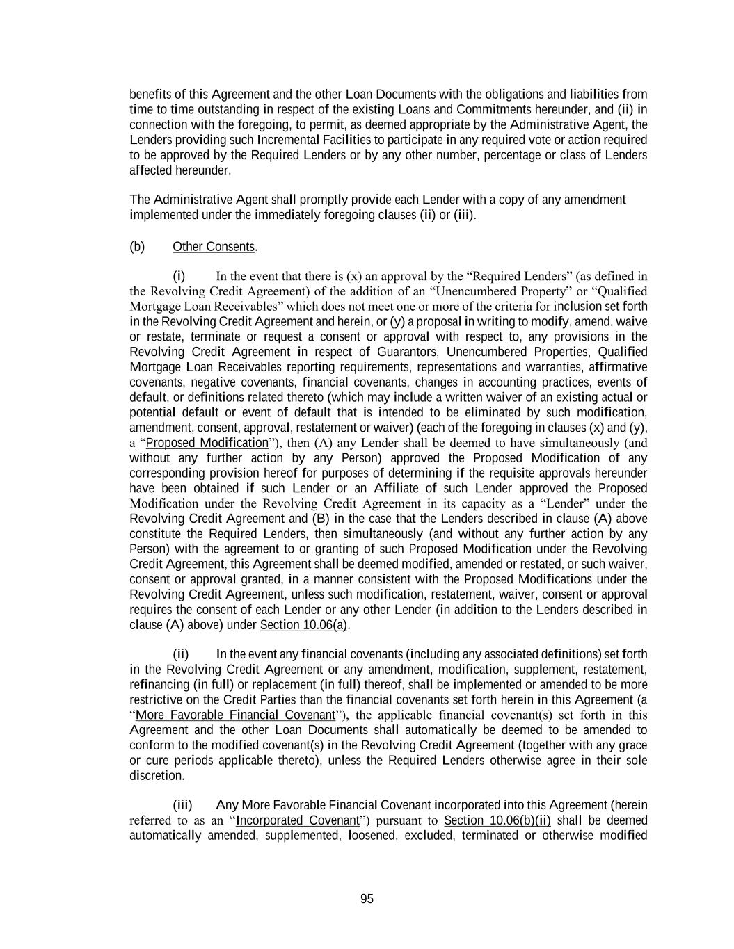 95 benefits of this Agreement and the other Loan Documents with the obligations and liabilities from time to time outstanding in respect of the existing Loans and Commitments hereunder, and (ii) in connection with the foregoing, to permit, as deemed appropriate by the Administrative Agent, the Lenders providing such Incremental Facilities to participate in any required vote or action required to be approved by the Required Lenders or by any other number, percentage or class of Lenders affected hereunder. The Administrative Agent shall promptly provide each Lender with a copy of any amendment implemented under the immediately foregoing clauses (ii) or (iii). (b) Other Consents. (i) In the event that there is (x) an approval by the “Required Lenders” (as defined in the Revolving Credit Agreement) of the addition of an “Unencumbered Property” or “Qualified Mortgage Loan Receivables” which does not meet one or more of the criteria for inclusion set forth in the Revolving Credit Agreement and herein, or (y) a proposal in writing to modify, amend, waive or restate, terminate or request a consent or approval with respect to, any provisions in the Revolving Credit Agreement in respect of Guarantors, Unencumbered Properties, Qualified Mortgage Loan Receivables reporting requirements, representations and warranties, affirmative covenants, negative covenants, financial covenants, changes in accounting practices, events of default, or definitions related thereto (which may include a written waiver of an existing actual or potential default or event of default that is intended to be eliminated by such modification, amendment, consent, approval, restatement or waiver) (each of the foregoing in clauses (x) and (y), a “Proposed Modification”), then (A) any Lender shall be deemed to have simultaneously (and without any further action by any Person) approved the Proposed Modification of any corresponding provision hereof for purposes of determining if the requisite approvals hereunder have been obtained if such Lender or an Affiliate of such Lender approved the Proposed Modification under the Revolving Credit Agreement in its capacity as a “Lender” under the Revolving Credit Agreement and (B) in the case that the Lenders described in clause (A) above constitute the Required Lenders, then simultaneously (and without any further action by any Person) with the agreement to or granting of such Proposed Modification under the Revolving Credit Agreement, this Agreement shall be deemed modified, amended or restated, or such waiver, consent or approval granted, in a manner consistent with the Proposed Modifications under the Revolving Credit Agreement, unless such modification, restatement, waiver, consent or approval requires the consent of each Lender or any other Lender (in addition to the Lenders described in clause (A) above) under Section 10.06(a). (ii) In the event any financial covenants (including any associated definitions) set forth in the Revolving Credit Agreement or any amendment, modification, supplement, restatement, refinancing (in full) or replacement (in full) thereof, shall be implemented or amended to be more restrictive on the Credit Parties than the financial covenants set forth herein in this Agreement (a “More Favorable Financial Covenant”), the applicable financial covenant(s) set forth in this Agreement and the other Loan Documents shall automatically be deemed to be amended to conform to the modified covenant(s) in the Revolving Credit Agreement (together with any grace or cure periods applicable thereto), unless the Required Lenders otherwise agree in their sole discretion. (iii) Any More Favorable Financial Covenant incorporated into this Agreement (herein referred to as an “Incorporated Covenant”) pursuant to Section 10.06(b)(ii) shall be deemed automatically amended, supplemented, loosened, excluded, terminated or otherwise modified