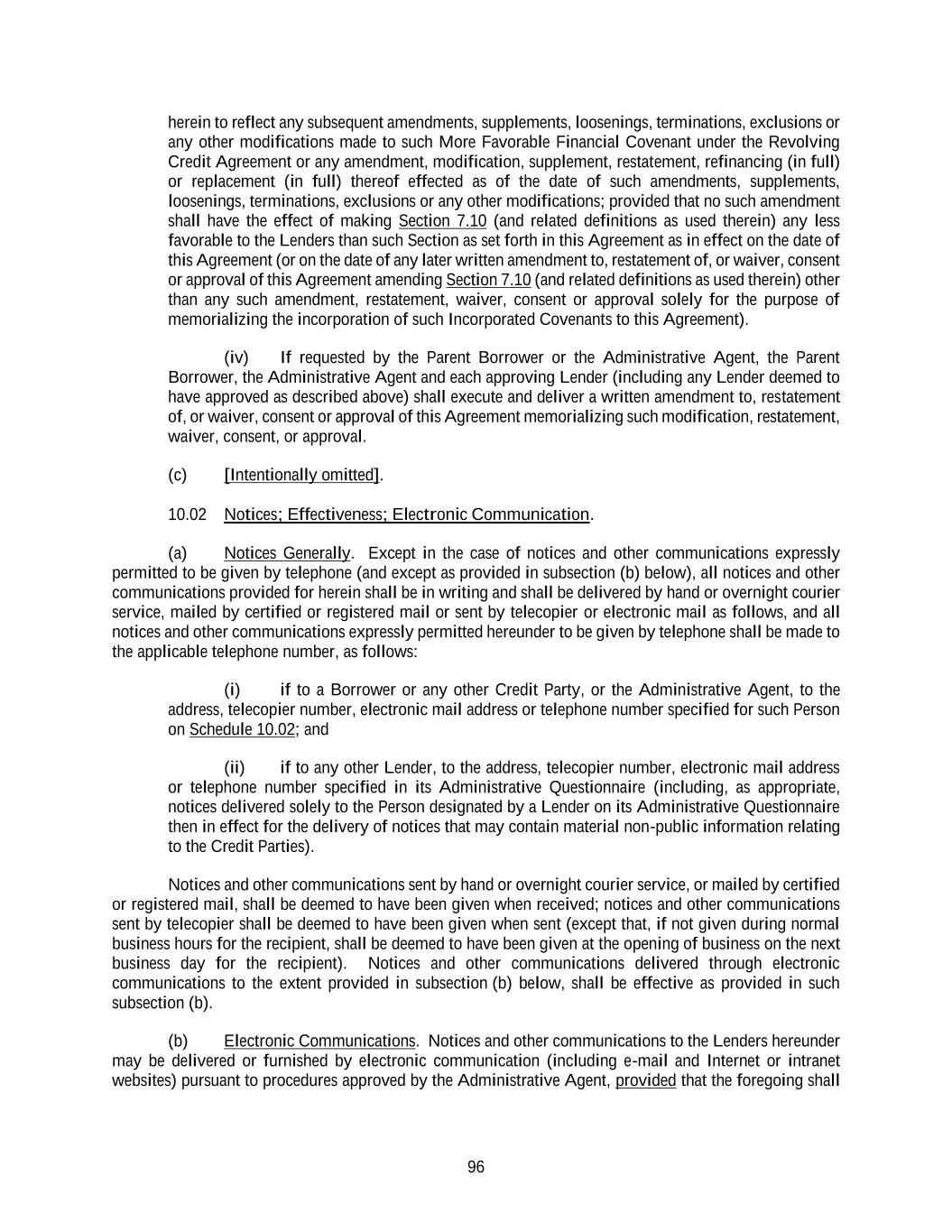 96 herein to reflect any subsequent amendments, supplements, loosenings, terminations, exclusions or any other modifications made to such More Favorable Financial Covenant under the Revolving Credit Agreement or any amendment, modification, supplement, restatement, refinancing (in full) or replacement (in full) thereof effected as of the date of such amendments, supplements, loosenings, terminations, exclusions or any other modifications; provided that no such amendment shall have the effect of making Section 7.10 (and related definitions as used therein) any less favorable to the Lenders than such Section as set forth in this Agreement as in effect on the date of this Agreement (or on the date of any later written amendment to, restatement of, or waiver, consent or approval of this Agreement amending Section 7.10 (and related definitions as used therein) other than any such amendment, restatement, waiver, consent or approval solely for the purpose of memorializing the incorporation of such Incorporated Covenants to this Agreement). (iv) If requested by the Parent Borrower or the Administrative Agent, the Parent Borrower, the Administrative Agent and each approving Lender (including any Lender deemed to have approved as described above) shall execute and deliver a written amendment to, restatement of, or waiver, consent or approval of this Agreement memorializing such modification, restatement, waiver, consent, or approval. (c) [Intentionally omitted]. 10.02 Notices; Effectiveness; Electronic Communication. (a) Notices Generally. Except in the case of notices and other communications expressly permitted to be given by telephone (and except as provided in subsection (b) below), all notices and other communications provided for herein shall be in writing and shall be delivered by hand or overnight courier service, mailed by certified or registered mail or sent by telecopier or electronic mail as follows, and all notices and other communications expressly permitted hereunder to be given by telephone shall be made to the applicable telephone number, as follows: (i) if to a Borrower or any other Credit Party, or the Administrative Agent, to the address, telecopier number, electronic mail address or telephone number specified for such Person on Schedule 10.02; and (ii) if to any other Lender, to the address, telecopier number, electronic mail address or telephone number specified in its Administrative Questionnaire (including, as appropriate, notices delivered solely to the Person designated by a Lender on its Administrative Questionnaire then in effect for the delivery of notices that may contain material non-public information relating to the Credit Parties). Notices and other communications sent by hand or overnight courier service, or mailed by certified or registered mail, shall be deemed to have been given when received; notices and other communications sent by telecopier shall be deemed to have been given when sent (except that, if not given during normal business hours for the recipient, shall be deemed to have been given at the opening of business on the next business day for the recipient). Notices and other communications delivered through electronic communications to the extent provided in subsection (b) below, shall be effective as provided in such subsection (b). (b) Electronic Communications. Notices and other communications to the Lenders hereunder may be delivered or furnished by electronic communication (including e-mail and Internet or intranet websites) pursuant to procedures approved by the Administrative Agent, provided that the foregoing shall