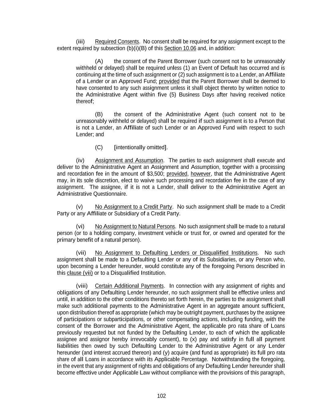 102 (iii) Required Consents. No consent shall be required for any assignment except to the extent required by subsection (b)(i)(B) of this Section 10.06 and, in addition: (A) the consent of the Parent Borrower (such consent not to be unreasonably withheld or delayed) shall be required unless (1) an Event of Default has occurred and is continuing at the time of such assignment or (2) such assignment is to a Lender, an Affiliate of a Lender or an Approved Fund; provided that the Parent Borrower shall be deemed to have consented to any such assignment unless it shall object thereto by written notice to the Administrative Agent within five (5) Business Days after having received notice thereof; (B) the consent of the Administrative Agent (such consent not to be unreasonably withheld or delayed) shall be required if such assignment is to a Person that is not a Lender, an Affiliate of such Lender or an Approved Fund with respect to such Lender; and (C) [intentionally omitted]. (iv) Assignment and Assumption. The parties to each assignment shall execute and deliver to the Administrative Agent an Assignment and Assumption, together with a processing and recordation fee in the amount of $3,500; provided, however, that the Administrative Agent may, in its sole discretion, elect to waive such processing and recordation fee in the case of any assignment. The assignee, if it is not a Lender, shall deliver to the Administrative Agent an Administrative Questionnaire. (v) No Assignment to a Credit Party. No such assignment shall be made to a Credit Party or any Affiliate or Subsidiary of a Credit Party. (vi) No Assignment to Natural Persons. No such assignment shall be made to a natural person (or to a holding company, investment vehicle or trust for, or owned and operated for the primary benefit of a natural person). (vii) No Assignment to Defaulting Lenders or Disqualified Institutions. No such assignment shall be made to a Defaulting Lender or any of its Subsidiaries, or any Person who, upon becoming a Lender hereunder, would constitute any of the foregoing Persons described in this clause (vii) or to a Disqualified Institution. (viii) Certain Additional Payments. In connection with any assignment of rights and obligations of any Defaulting Lender hereunder, no such assignment shall be effective unless and until, in addition to the other conditions thereto set forth herein, the parties to the assignment shall make such additional payments to the Administrative Agent in an aggregate amount sufficient, upon distribution thereof as appropriate (which may be outright payment, purchases by the assignee of participations or subparticipations, or other compensating actions, including funding, with the consent of the Borrower and the Administrative Agent, the applicable pro rata share of Loans previously requested but not funded by the Defaulting Lender, to each of which the applicable assignee and assignor hereby irrevocably consent), to (x) pay and satisfy in full all payment liabilities then owed by such Defaulting Lender to the Administrative Agent or any Lender hereunder (and interest accrued thereon) and (y) acquire (and fund as appropriate) its full pro rata share of all Loans in accordance with its Applicable Percentage. Notwithstanding the foregoing, in the event that any assignment of rights and obligations of any Defaulting Lender hereunder shall become effective under Applicable Law without compliance with the provisions of this paragraph,