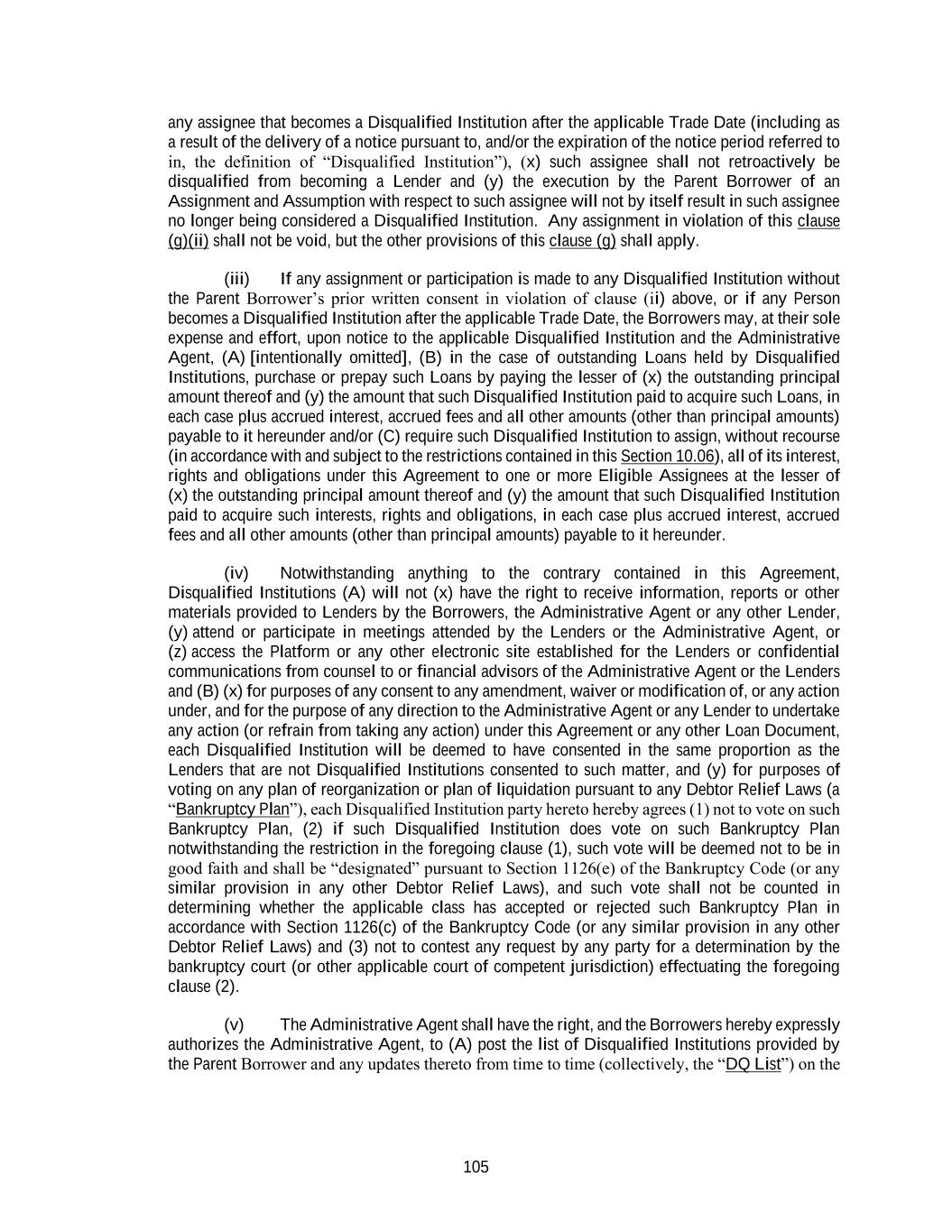 105 any assignee that becomes a Disqualified Institution after the applicable Trade Date (including as a result of the delivery of a notice pursuant to, and/or the expiration of the notice period referred to in, the definition of “Disqualified Institution”), (x) such assignee shall not retroactively be disqualified from becoming a Lender and (y) the execution by the Parent Borrower of an Assignment and Assumption with respect to such assignee will not by itself result in such assignee no longer being considered a Disqualified Institution. Any assignment in violation of this clause (g)(ii) shall not be void, but the other provisions of this clause (g) shall apply. (iii) If any assignment or participation is made to any Disqualified Institution without the Parent Borrower’s prior written consent in violation of clause (ii) above, or if any Person becomes a Disqualified Institution after the applicable Trade Date, the Borrowers may, at their sole expense and effort, upon notice to the applicable Disqualified Institution and the Administrative Agent, (A) [intentionally omitted], (B) in the case of outstanding Loans held by Disqualified Institutions, purchase or prepay such Loans by paying the lesser of (x) the outstanding principal amount thereof and (y) the amount that such Disqualified Institution paid to acquire such Loans, in each case plus accrued interest, accrued fees and all other amounts (other than principal amounts) payable to it hereunder and/or (C) require such Disqualified Institution to assign, without recourse (in accordance with and subject to the restrictions contained in this Section 10.06), all of its interest, rights and obligations under this Agreement to one or more Eligible Assignees at the lesser of (x) the outstanding principal amount thereof and (y) the amount that such Disqualified Institution paid to acquire such interests, rights and obligations, in each case plus accrued interest, accrued fees and all other amounts (other than principal amounts) payable to it hereunder. (iv) Notwithstanding anything to the contrary contained in this Agreement, Disqualified Institutions (A) will not (x) have the right to receive information, reports or other materials provided to Lenders by the Borrowers, the Administrative Agent or any other Lender, (y) attend or participate in meetings attended by the Lenders or the Administrative Agent, or (z) access the Platform or any other electronic site established for the Lenders or confidential communications from counsel to or financial advisors of the Administrative Agent or the Lenders and (B) (x) for purposes of any consent to any amendment, waiver or modification of, or any action under, and for the purpose of any direction to the Administrative Agent or any Lender to undertake any action (or refrain from taking any action) under this Agreement or any other Loan Document, each Disqualified Institution will be deemed to have consented in the same proportion as the Lenders that are not Disqualified Institutions consented to such matter, and (y) for purposes of voting on any plan of reorganization or plan of liquidation pursuant to any Debtor Relief Laws (a “Bankruptcy Plan”), each Disqualified Institution party hereto hereby agrees (1) not to vote on such Bankruptcy Plan, (2) if such Disqualified Institution does vote on such Bankruptcy Plan notwithstanding the restriction in the foregoing clause (1), such vote will be deemed not to be in good faith and shall be “designated” pursuant to Section 1126(e) of the Bankruptcy Code (or any similar provision in any other Debtor Relief Laws), and such vote shall not be counted in determining whether the applicable class has accepted or rejected such Bankruptcy Plan in accordance with Section 1126(c) of the Bankruptcy Code (or any similar provision in any other Debtor Relief Laws) and (3) not to contest any request by any party for a determination by the bankruptcy court (or other applicable court of competent jurisdiction) effectuating the foregoing clause (2). (v) The Administrative Agent shall have the right, and the Borrowers hereby expressly authorizes the Administrative Agent, to (A) post the list of Disqualified Institutions provided by the Parent Borrower and any updates thereto from time to time (collectively, the “DQ List”) on the
