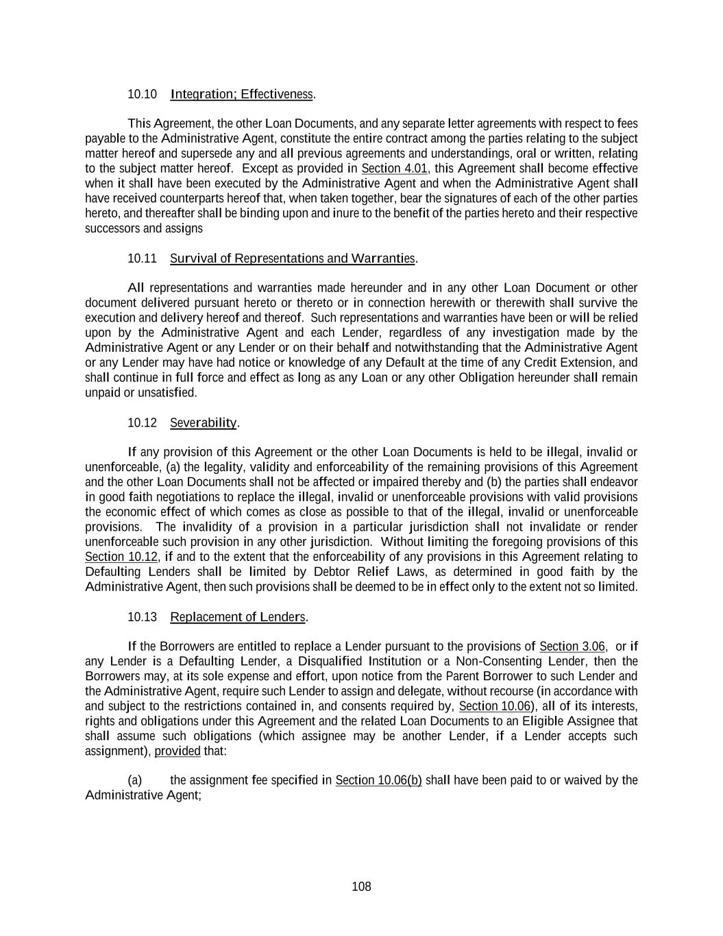 108 10.10 Integration; Effectiveness. This Agreement, the other Loan Documents, and any separate letter agreements with respect to fees payable to the Administrative Agent, constitute the entire contract among the parties relating to the subject matter hereof and supersede any and all previous agreements and understandings, oral or written, relating to the subject matter hereof. Except as provided in Section 4.01, this Agreement shall become effective when it shall have been executed by the Administrative Agent and when the Administrative Agent shall have received counterparts hereof that, when taken together, bear the signatures of each of the other parties hereto, and thereafter shall be binding upon and inure to the benefit of the parties hereto and their respective successors and assigns 10.11 Survival of Representations and Warranties. All representations and warranties made hereunder and in any other Loan Document or other document delivered pursuant hereto or thereto or in connection herewith or therewith shall survive the execution and delivery hereof and thereof. Such representations and warranties have been or will be relied upon by the Administrative Agent and each Lender, regardless of any investigation made by the Administrative Agent or any Lender or on their behalf and notwithstanding that the Administrative Agent or any Lender may have had notice or knowledge of any Default at the time of any Credit Extension, and shall continue in full force and effect as long as any Loan or any other Obligation hereunder shall remain unpaid or unsatisfied. 10.12 Severability. If any provision of this Agreement or the other Loan Documents is held to be illegal, invalid or unenforceable, (a) the legality, validity and enforceability of the remaining provisions of this Agreement and the other Loan Documents shall not be affected or impaired thereby and (b) the parties shall endeavor in good faith negotiations to replace the illegal, invalid or unenforceable provisions with valid provisions the economic effect of which comes as close as possible to that of the illegal, invalid or unenforceable provisions. The invalidity of a provision in a particular jurisdiction shall not invalidate or render unenforceable such provision in any other jurisdiction. Without limiting the foregoing provisions of this Section 10.12, if and to the extent that the enforceability of any provisions in this Agreement relating to Defaulting Lenders shall be limited by Debtor Relief Laws, as determined in good faith by the Administrative Agent, then such provisions shall be deemed to be in effect only to the extent not so limited. 10.13 Replacement of Lenders. If the Borrowers are entitled to replace a Lender pursuant to the provisions of Section 3.06, or if any Lender is a Defaulting Lender, a Disqualified Institution or a Non-Consenting Lender, then the Borrowers may, at its sole expense and effort, upon notice from the Parent Borrower to such Lender and the Administrative Agent, require such Lender to assign and delegate, without recourse (in accordance with and subject to the restrictions contained in, and consents required by, Section 10.06), all of its interests, rights and obligations under this Agreement and the related Loan Documents to an Eligible Assignee that shall assume such obligations (which assignee may be another Lender, if a Lender accepts such assignment), provided that: (a) the assignment fee specified in Section 10.06(b) shall have been paid to or waived by the Administrative Agent;