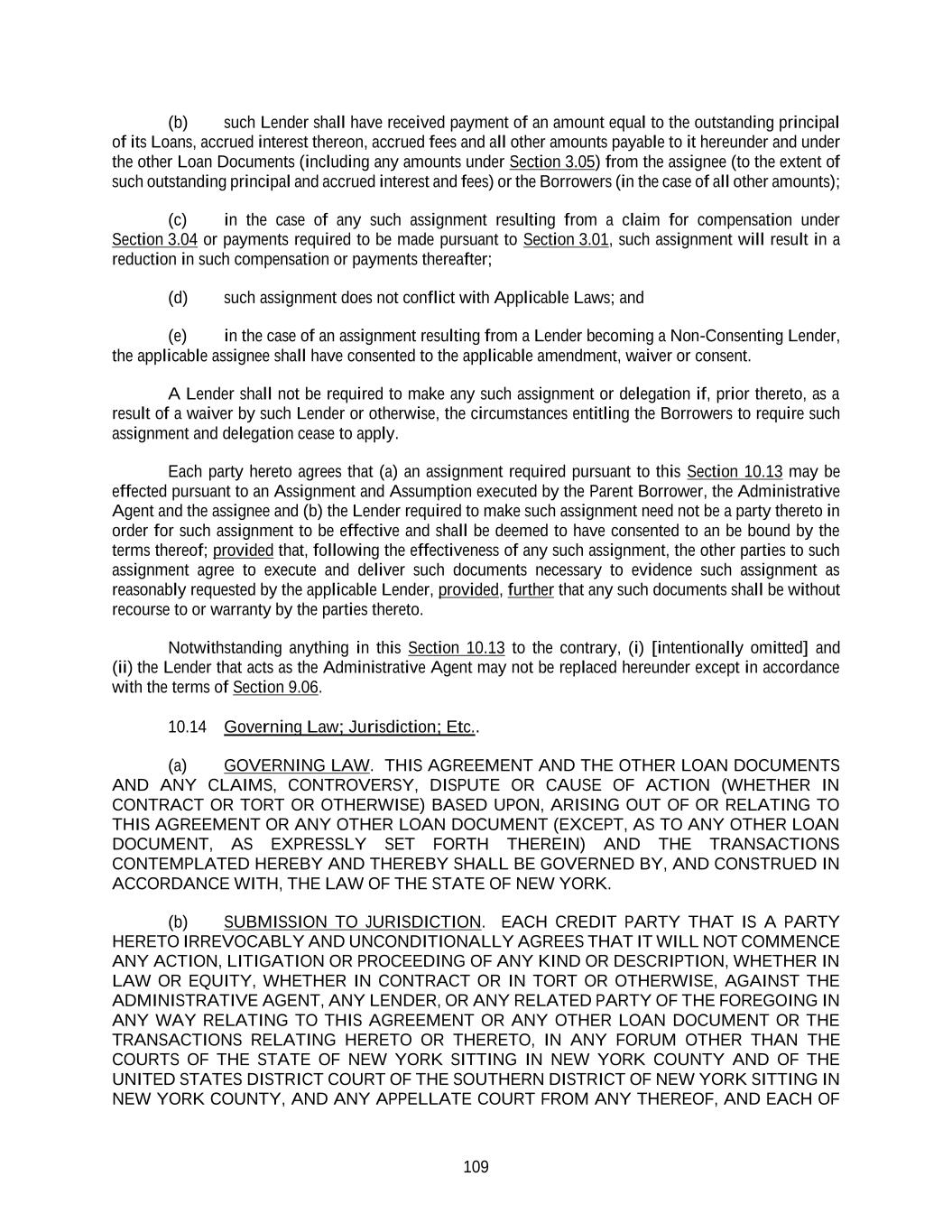 109 (b) such Lender shall have received payment of an amount equal to the outstanding principal of its Loans, accrued interest thereon, accrued fees and all other amounts payable to it hereunder and under the other Loan Documents (including any amounts under Section 3.05) from the assignee (to the extent of such outstanding principal and accrued interest and fees) or the Borrowers (in the case of all other amounts); (c) in the case of any such assignment resulting from a claim for compensation under Section 3.04 or payments required to be made pursuant to Section 3.01, such assignment will result in a reduction in such compensation or payments thereafter; (d) such assignment does not conflict with Applicable Laws; and (e) in the case of an assignment resulting from a Lender becoming a Non-Consenting Lender, the applicable assignee shall have consented to the applicable amendment, waiver or consent. A Lender shall not be required to make any such assignment or delegation if, prior thereto, as a result of a waiver by such Lender or otherwise, the circumstances entitling the Borrowers to require such assignment and delegation cease to apply. Each party hereto agrees that (a) an assignment required pursuant to this Section 10.13 may be effected pursuant to an Assignment and Assumption executed by the Parent Borrower, the Administrative Agent and the assignee and (b) the Lender required to make such assignment need not be a party thereto in order for such assignment to be effective and shall be deemed to have consented to an be bound by the terms thereof; provided that, following the effectiveness of any such assignment, the other parties to such assignment agree to execute and deliver such documents necessary to evidence such assignment as reasonably requested by the applicable Lender, provided, further that any such documents shall be without recourse to or warranty by the parties thereto. Notwithstanding anything in this Section 10.13 to the contrary, (i) [intentionally omitted] and (ii) the Lender that acts as the Administrative Agent may not be replaced hereunder except in accordance with the terms of Section 9.06. 10.14 Governing Law; Jurisdiction; Etc.. (a) GOVERNING LAW. THIS AGREEMENT AND THE OTHER LOAN DOCUMENTS AND ANY CLAIMS, CONTROVERSY, DISPUTE OR CAUSE OF ACTION (WHETHER IN CONTRACT OR TORT OR OTHERWISE) BASED UPON, ARISING OUT OF OR RELATING TO THIS AGREEMENT OR ANY OTHER LOAN DOCUMENT (EXCEPT, AS TO ANY OTHER LOAN DOCUMENT, AS EXPRESSLY SET FORTH THEREIN) AND THE TRANSACTIONS CONTEMPLATED HEREBY AND THEREBY SHALL BE GOVERNED BY, AND CONSTRUED IN ACCORDANCE WITH, THE LAW OF THE STATE OF NEW YORK. (b) SUBMISSION TO JURISDICTION. EACH CREDIT PARTY THAT IS A PARTY HERETO IRREVOCABLY AND UNCONDITIONALLY AGREES THAT IT WILL NOT COMMENCE ANY ACTION, LITIGATION OR PROCEEDING OF ANY KIND OR DESCRIPTION, WHETHER IN LAW OR EQUITY, WHETHER IN CONTRACT OR IN TORT OR OTHERWISE, AGAINST THE ADMINISTRATIVE AGENT, ANY LENDER, OR ANY RELATED PARTY OF THE FOREGOING IN ANY WAY RELATING TO THIS AGREEMENT OR ANY OTHER LOAN DOCUMENT OR THE TRANSACTIONS RELATING HERETO OR THERETO, IN ANY FORUM OTHER THAN THE COURTS OF THE STATE OF NEW YORK SITTING IN NEW YORK COUNTY AND OF THE UNITED STATES DISTRICT COURT OF THE SOUTHERN DISTRICT OF NEW YORK SITTING IN NEW YORK COUNTY, AND ANY APPELLATE COURT FROM ANY THEREOF, AND EACH OF