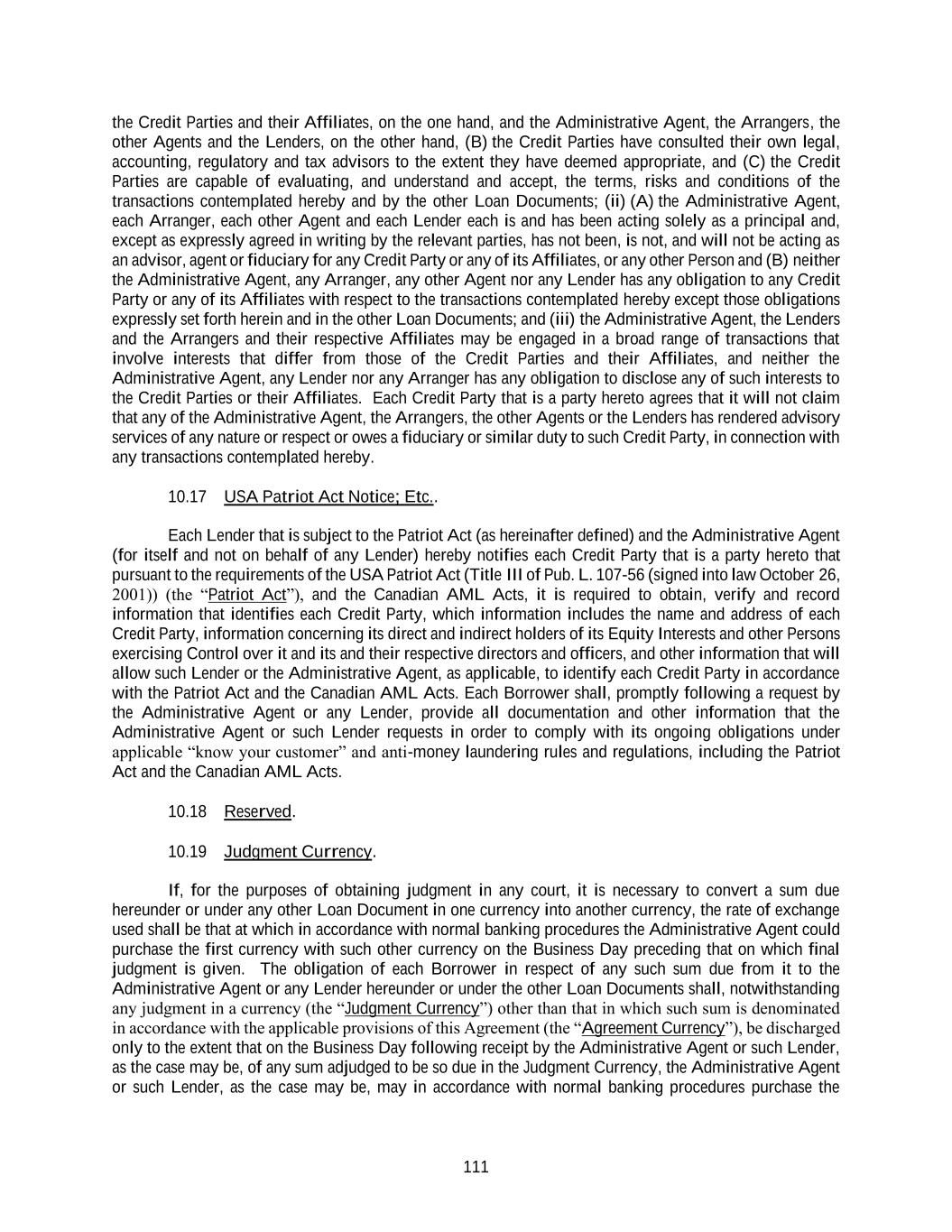 111 the Credit Parties and their Affiliates, on the one hand, and the Administrative Agent, the Arrangers, the other Agents and the Lenders, on the other hand, (B) the Credit Parties have consulted their own legal, accounting, regulatory and tax advisors to the extent they have deemed appropriate, and (C) the Credit Parties are capable of evaluating, and understand and accept, the terms, risks and conditions of the transactions contemplated hereby and by the other Loan Documents; (ii) (A) the Administrative Agent, each Arranger, each other Agent and each Lender each is and has been acting solely as a principal and, except as expressly agreed in writing by the relevant parties, has not been, is not, and will not be acting as an advisor, agent or fiduciary for any Credit Party or any of its Affiliates, or any other Person and (B) neither the Administrative Agent, any Arranger, any other Agent nor any Lender has any obligation to any Credit Party or any of its Affiliates with respect to the transactions contemplated hereby except those obligations expressly set forth herein and in the other Loan Documents; and (iii) the Administrative Agent, the Lenders and the Arrangers and their respective Affiliates may be engaged in a broad range of transactions that involve interests that differ from those of the Credit Parties and their Affiliates, and neither the Administrative Agent, any Lender nor any Arranger has any obligation to disclose any of such interests to the Credit Parties or their Affiliates. Each Credit Party that is a party hereto agrees that it will not claim that any of the Administrative Agent, the Arrangers, the other Agents or the Lenders has rendered advisory services of any nature or respect or owes a fiduciary or similar duty to such Credit Party, in connection with any transactions contemplated hereby. 10.17 USA Patriot Act Notice; Etc.. Each Lender that is subject to the Patriot Act (as hereinafter defined) and the Administrative Agent (for itself and not on behalf of any Lender) hereby notifies each Credit Party that is a party hereto that pursuant to the requirements of the USA Patriot Act (Title III of Pub. L. 107-56 (signed into law October 26, 2001)) (the “Patriot Act”), and the Canadian AML Acts, it is required to obtain, verify and record information that identifies each Credit Party, which information includes the name and address of each Credit Party, information concerning its direct and indirect holders of its Equity Interests and other Persons exercising Control over it and its and their respective directors and officers, and other information that will allow such Lender or the Administrative Agent, as applicable, to identify each Credit Party in accordance with the Patriot Act and the Canadian AML Acts. Each Borrower shall, promptly following a request by the Administrative Agent or any Lender, provide all documentation and other information that the Administrative Agent or such Lender requests in order to comply with its ongoing obligations under applicable “know your customer” and anti-money laundering rules and regulations, including the Patriot Act and the Canadian AML Acts. 10.18 Reserved. 10.19 Judgment Currency. If, for the purposes of obtaining judgment in any court, it is necessary to convert a sum due hereunder or under any other Loan Document in one currency into another currency, the rate of exchange used shall be that at which in accordance with normal banking procedures the Administrative Agent could purchase the first currency with such other currency on the Business Day preceding that on which final judgment is given. The obligation of each Borrower in respect of any such sum due from it to the Administrative Agent or any Lender hereunder or under the other Loan Documents shall, notwithstanding any judgment in a currency (the “Judgment Currency”) other than that in which such sum is denominated in accordance with the applicable provisions of this Agreement (the “Agreement Currency”), be discharged only to the extent that on the Business Day following receipt by the Administrative Agent or such Lender, as the case may be, of any sum adjudged to be so due in the Judgment Currency, the Administrative Agent or such Lender, as the case may be, may in accordance with normal banking procedures purchase the