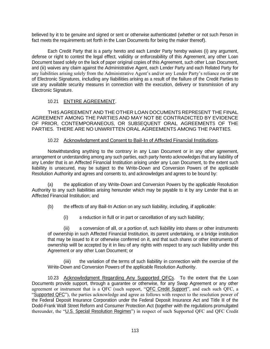 113 believed by it to be genuine and signed or sent or otherwise authenticated (whether or not such Person in fact meets the requirements set forth in the Loan Documents for being the maker thereof). Each Credit Party that is a party hereto and each Lender Party hereby waives (i) any argument, defense or right to contest the legal effect, validity or enforceability of this Agreement, any other Loan Document based solely on the lack of paper original copies of this Agreement, such other Loan Document, and (ii) waives any claim against the Administrative Agent, each Lender Party and each Related Party for any liabilities arising solely from the Administrative Agent’s and/or any Lender Party’s reliance on or use of Electronic Signatures, including any liabilities arising as a result of the failure of the Credit Parties to use any available security measures in connection with the execution, delivery or transmission of any Electronic Signature. 10.21 ENTIRE AGREEMENT. THIS AGREEMENT AND THE OTHER LOAN DOCUMENTS REPRESENT THE FINAL AGREEMENT AMONG THE PARTIES AND MAY NOT BE CONTRADICTED BY EVIDENCE OF PRIOR, CONTEMPORANEOUS, OR SUBSEQUENT ORAL AGREEMENTS OF THE PARTIES. THERE ARE NO UNWRITTEN ORAL AGREEMENTS AMONG THE PARTIES. 10.22 Acknowledgment and Consent to Bail-In of Affected Financial Institutions. Notwithstanding anything to the contrary in any Loan Document or in any other agreement, arrangement or understanding among any such parties, each party hereto acknowledges that any liability of any Lender that is an Affected Financial Institution arising under any Loan Document, to the extent such liability is unsecured, may be subject to the Write-Down and Conversion Powers of the applicable Resolution Authority and agrees and consents to, and acknowledges and agrees to be bound by: (a) the application of any Write-Down and Conversion Powers by the applicable Resolution Authority to any such liabilities arising hereunder which may be payable to it by any Lender that is an Affected Financial Institution; and (b) the effects of any Bail-In Action on any such liability, including, if applicable: (i) a reduction in full or in part or cancellation of any such liability; (ii) a conversion of all, or a portion of, such liability into shares or other instruments of ownership in such Affected Financial Institution, its parent undertaking, or a bridge institution that may be issued to it or otherwise conferred on it, and that such shares or other instruments of ownership will be accepted by it in lieu of any rights with respect to any such liability under this Agreement or any other Loan Document; or (iii) the variation of the terms of such liability in connection with the exercise of the Write-Down and Conversion Powers of the applicable Resolution Authority. 10.23 Acknowledgment Regarding Any Supported QFCs. To the extent that the Loan Documents provide support, through a guarantee or otherwise, for any Swap Agreement or any other agreement or instrument that is a QFC (such support, “QFC Credit Support”, and each such QFC, a “Supported QFC”), the parties acknowledge and agree as follows with respect to the resolution power of the Federal Deposit Insurance Corporation under the Federal Deposit Insurance Act and Title II of the Dodd-Frank Wall Street Reform and Consumer Protection Act (together with the regulations promulgated thereunder, the “U.S. Special Resolution Regimes”) in respect of such Supported QFC and QFC Credit