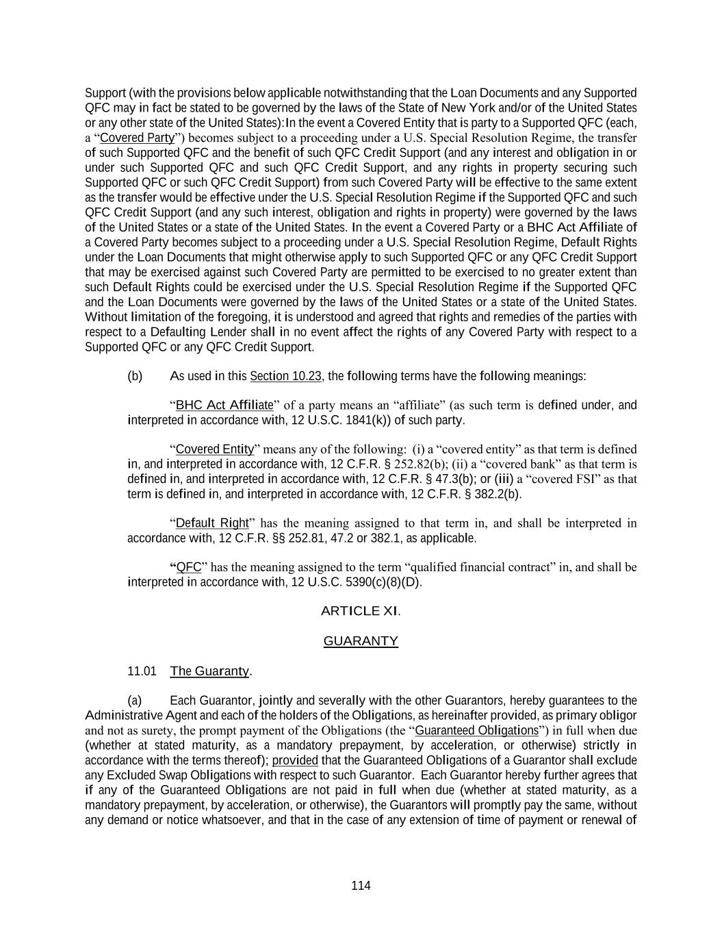 114 Support (with the provisions below applicable notwithstanding that the Loan Documents and any Supported QFC may in fact be stated to be governed by the laws of the State of New York and/or of the United States or any other state of the United States):In the event a Covered Entity that is party to a Supported QFC (each, a “Covered Party”) becomes subject to a proceeding under a U.S. Special Resolution Regime, the transfer of such Supported QFC and the benefit of such QFC Credit Support (and any interest and obligation in or under such Supported QFC and such QFC Credit Support, and any rights in property securing such Supported QFC or such QFC Credit Support) from such Covered Party will be effective to the same extent as the transfer would be effective under the U.S. Special Resolution Regime if the Supported QFC and such QFC Credit Support (and any such interest, obligation and rights in property) were governed by the laws of the United States or a state of the United States. In the event a Covered Party or a BHC Act Affiliate of a Covered Party becomes subject to a proceeding under a U.S. Special Resolution Regime, Default Rights under the Loan Documents that might otherwise apply to such Supported QFC or any QFC Credit Support that may be exercised against such Covered Party are permitted to be exercised to no greater extent than such Default Rights could be exercised under the U.S. Special Resolution Regime if the Supported QFC and the Loan Documents were governed by the laws of the United States or a state of the United States. Without limitation of the foregoing, it is understood and agreed that rights and remedies of the parties with respect to a Defaulting Lender shall in no event affect the rights of any Covered Party with respect to a Supported QFC or any QFC Credit Support. (b) As used in this Section 10.23, the following terms have the following meanings: “BHC Act Affiliate” of a party means an “affiliate” (as such term is defined under, and interpreted in accordance with, 12 U.S.C. 1841(k)) of such party. “Covered Entity” means any of the following: (i) a “covered entity” as that term is defined in, and interpreted in accordance with, 12 C.F.R. § 252.82(b); (ii) a “covered bank” as that term is defined in, and interpreted in accordance with, 12 C.F.R. § 47.3(b); or (iii) a “covered FSI” as that term is defined in, and interpreted in accordance with, 12 C.F.R. § 382.2(b). “Default Right” has the meaning assigned to that term in, and shall be interpreted in accordance with, 12 C.F.R. §§ 252.81, 47.2 or 382.1, as applicable. “QFC” has the meaning assigned to the term “qualified financial contract” in, and shall be interpreted in accordance with, 12 U.S.C. 5390(c)(8)(D). ARTICLE XI. GUARANTY 11.01 The Guaranty. (a) Each Guarantor, jointly and severally with the other Guarantors, hereby guarantees to the Administrative Agent and each of the holders of the Obligations, as hereinafter provided, as primary obligor and not as surety, the prompt payment of the Obligations (the “Guaranteed Obligations”) in full when due (whether at stated maturity, as a mandatory prepayment, by acceleration, or otherwise) strictly in accordance with the terms thereof); provided that the Guaranteed Obligations of a Guarantor shall exclude any Excluded Swap Obligations with respect to such Guarantor. Each Guarantor hereby further agrees that if any of the Guaranteed Obligations are not paid in full when due (whether at stated maturity, as a mandatory prepayment, by acceleration, or otherwise), the Guarantors will promptly pay the same, without any demand or notice whatsoever, and that in the case of any extension of time of payment or renewal of