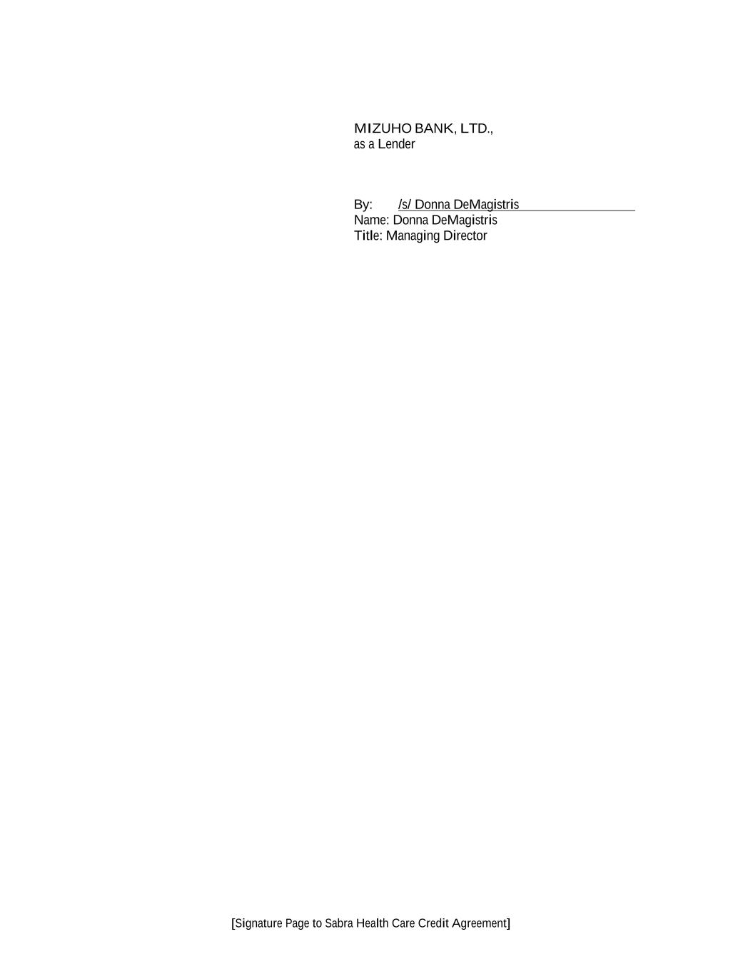 [Signature Page to Sabra Health Care Credit Agreement] MIZUHO BANK, LTD., as a Lender By: /s/ Donna DeMagistris Name: Donna DeMagistris Title: Managing Director