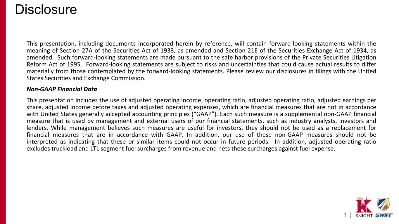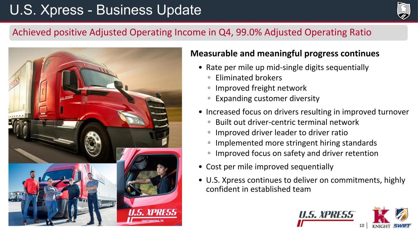 Since mid-2021 our cash flow generation, profitability, and access to capital have funded acquisitions and organic facility growth producing an annual run rate of nearly $1.0 billion in LTL revenue, with additional LTL facilities in the pipeline for implementation. Additionally, our strong financial position enabled our purchase of U.S. Xpress this past summer. In the first two quarters of ownership, we have made significant cost improvement and even some rate improvement, leading to slight profitability in the fourth quarter. We are ahead of schedule and believe an improvement in market conditions will enable U.S. Xpress to achieve our initial three-year targets, and longer-term, to perform at traditional Knight-Swift truckload levels.