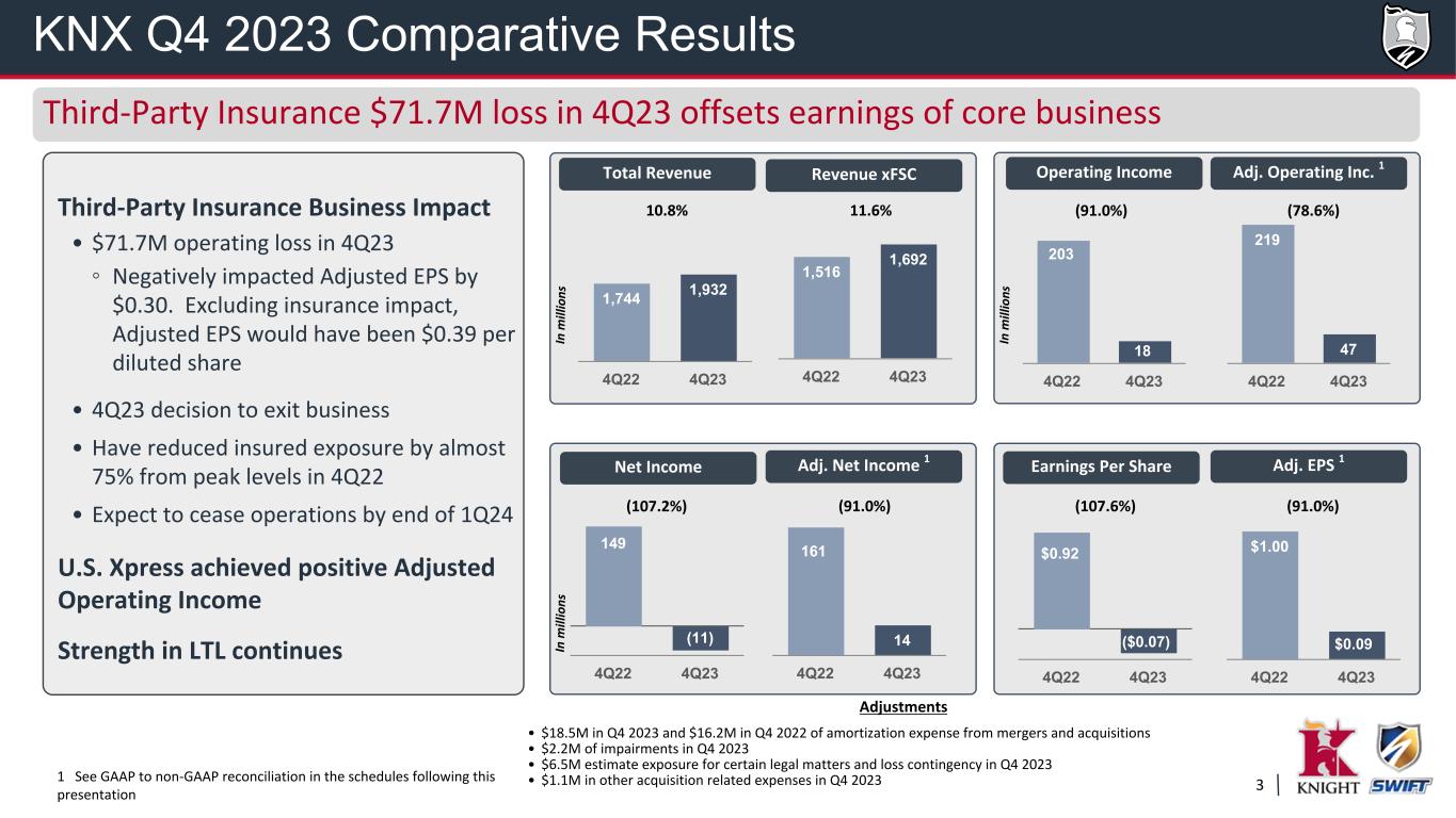 Knight-Swift Transportation Holdings Inc. (NYSE: KNX) ("Knight-Swift" or "the Company"), one of the largest and most diversified freight transportation companies, operating the largest full truckload fleet in North America, today reported fourth quarter 2023 net loss attributable to Knight-Swift of $10.7 million and Adjusted Net Income Attributable to Knight-Swift1 of $14.5 million. GAAP (loss) earnings per diluted share for the fourth quarter of 2023 were $(0.07), compared to $0.92 for the fourth quarter of 2022. The Adjusted EPS was $0.09 for the fourth quarter of 2023, compared to $1.00 for the fourth quarter of 2022. The current quarter results include an operating loss of $71.7 million for our third-party insurance business, which management has decided to exit as further discussed below. The insurance loss negatively impacted our Adjusted EPS by $0.30. Excluding the loss on the insurance business, our Adjusted EPS would have been $0.39.