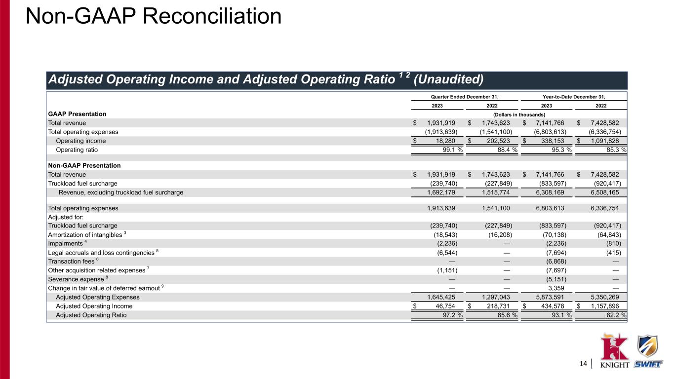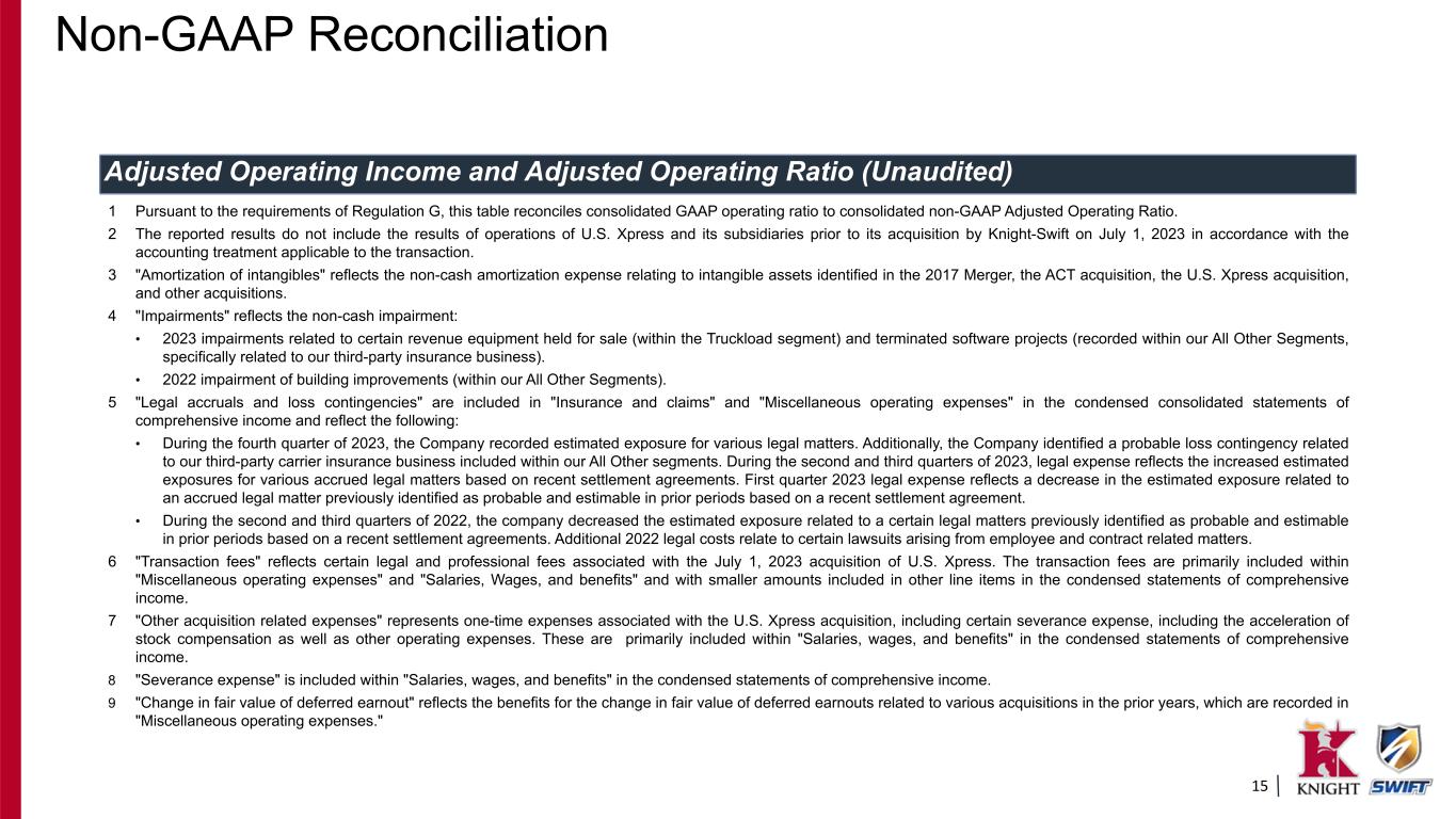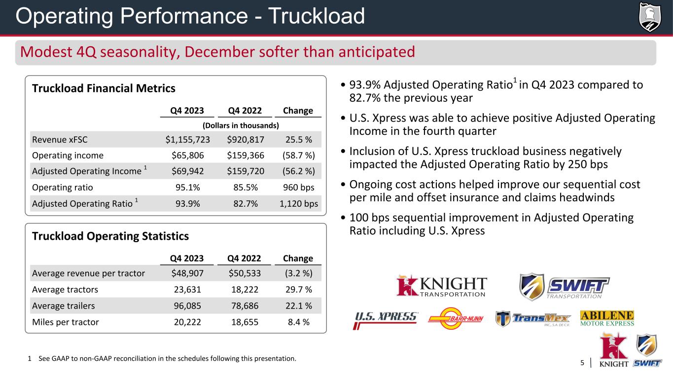 •Truckload — 93.9% Adjusted Operating Ratio, with a 25.5% year-over-year increase in revenue, excluding fuel surcharge and intersegment transactions, driven by the inclusion of the truckload business of U.S. Xpress Enterprises, Inc. ("U.S. Xpress"), acquired effective July 1, 2023. U.S. Xpress achieved positive Adjusted Operating Income for the quarter, though its inclusion also negatively impacted the Adjusted Operating Ratio for this segment by 250 basis points.