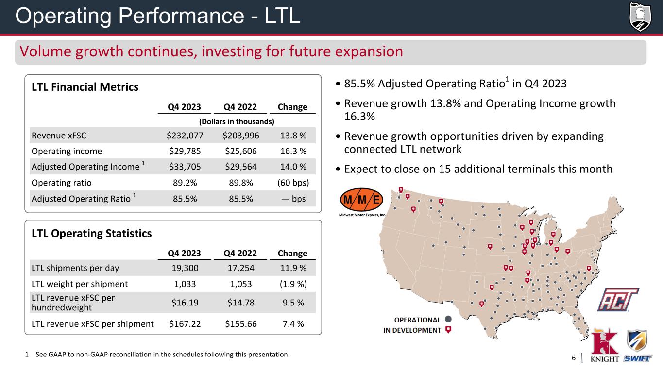 •LTL — 85.5% Adjusted Operating Ratio, while revenues, excluding fuel surcharge, increased 13.8% and Adjusted Operating Income grew 14.0% year-over-year. Shipments increased 11.9% and revenue per shipment excluding fuel surcharge increased 7.4% year-over-year.