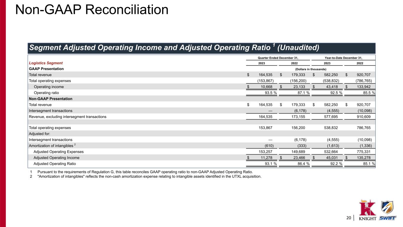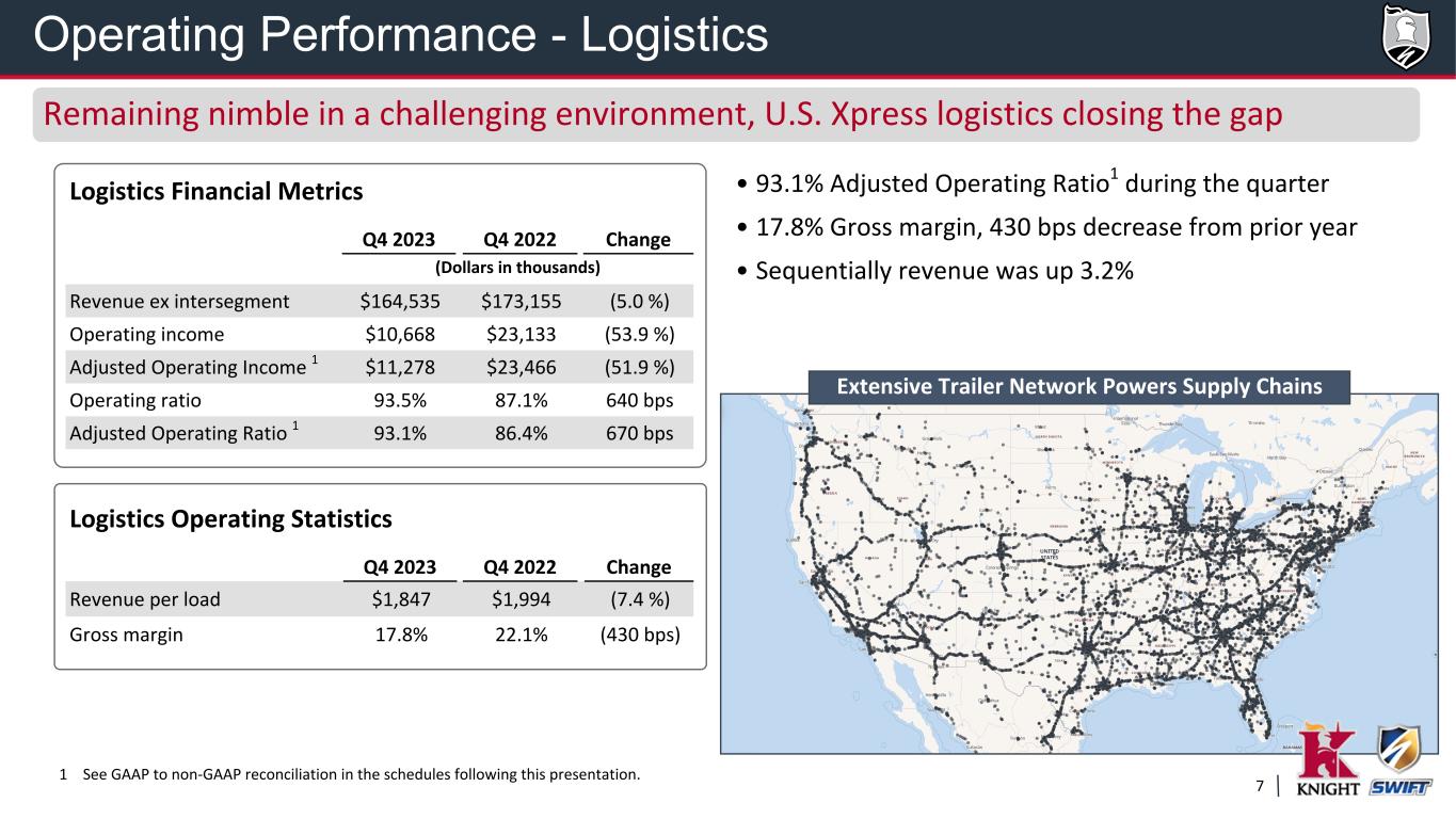 •Logistics — 93.1% Adjusted Operating Ratio with a gross margin of 17.8% while load count increased 2.6% year-over-year. Excluding the results of the U.S. Xpress logistics business, load count declined by 22.7%. The Adjusted Operating Ratio was negatively impacted by 40 basis points due to the inclusion of the U.S. Xpress logistics business.